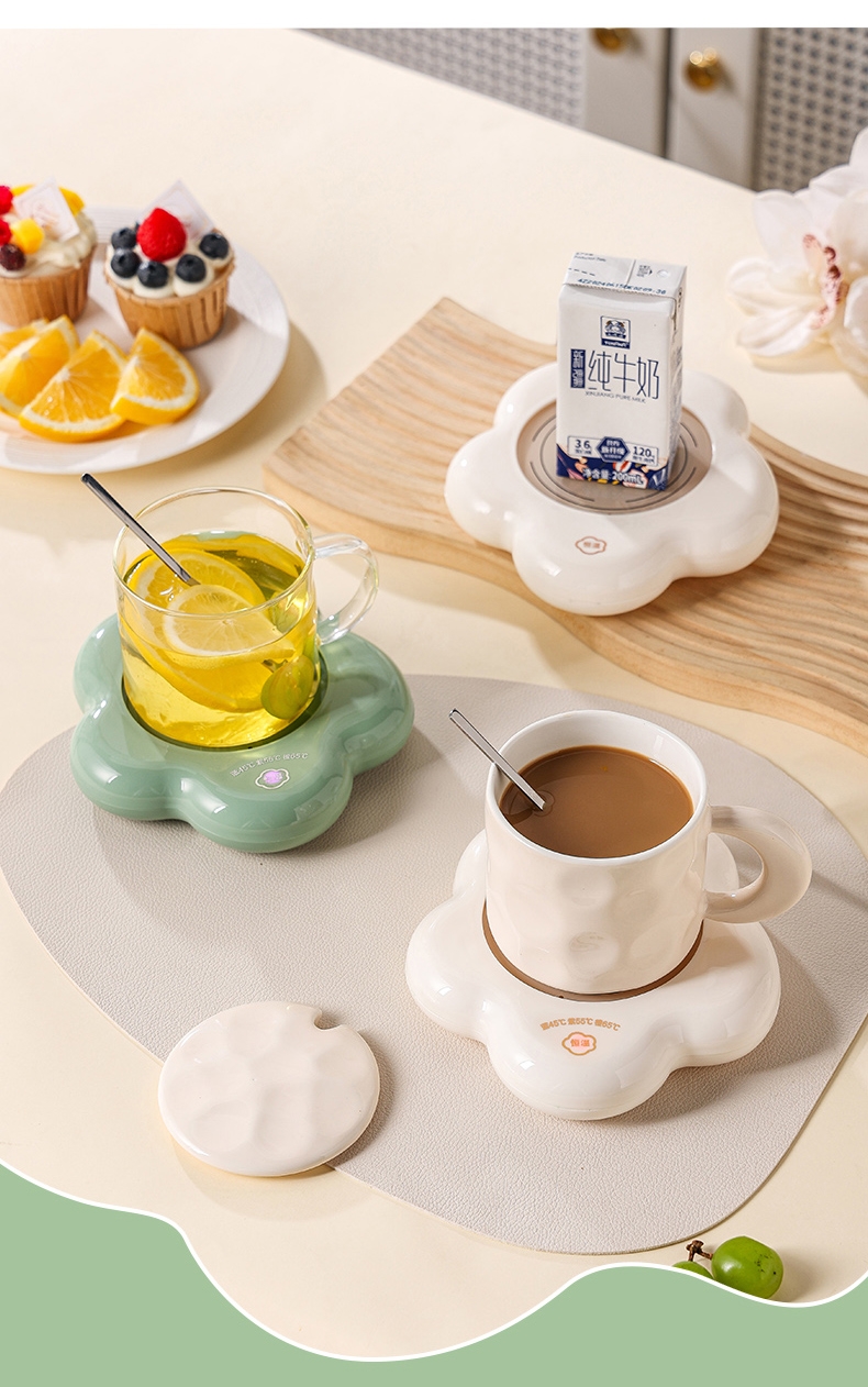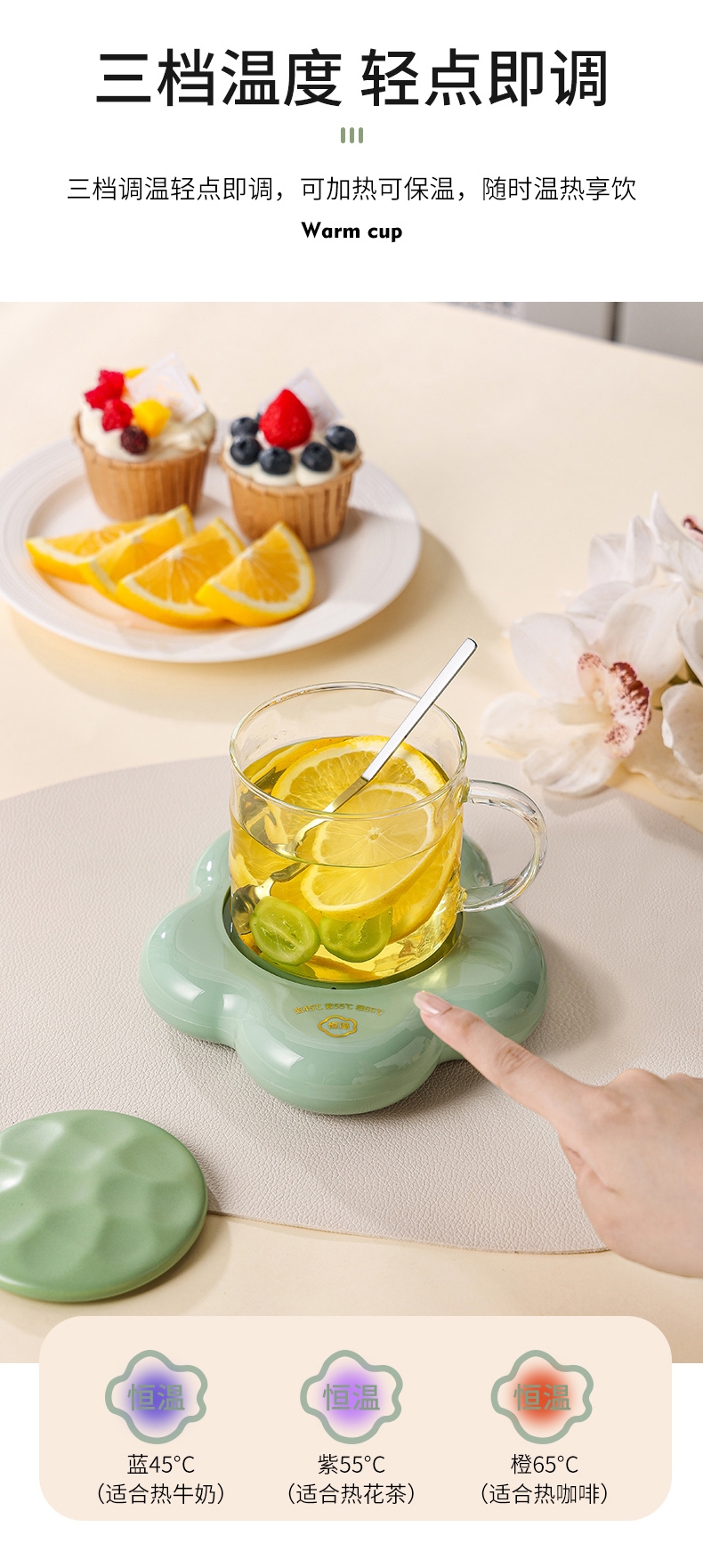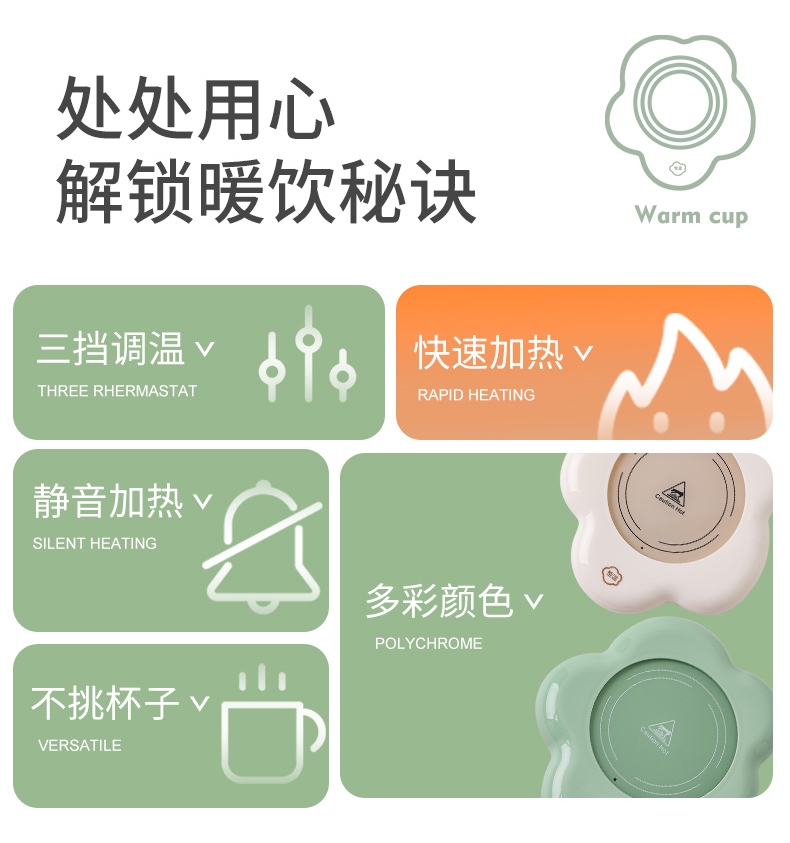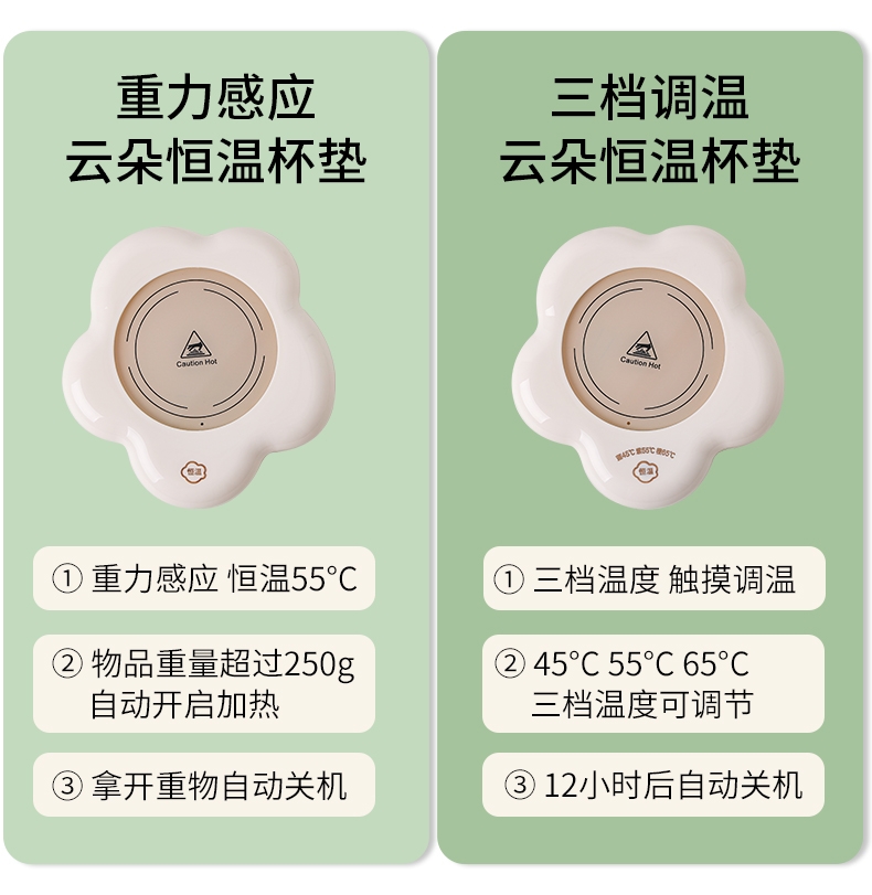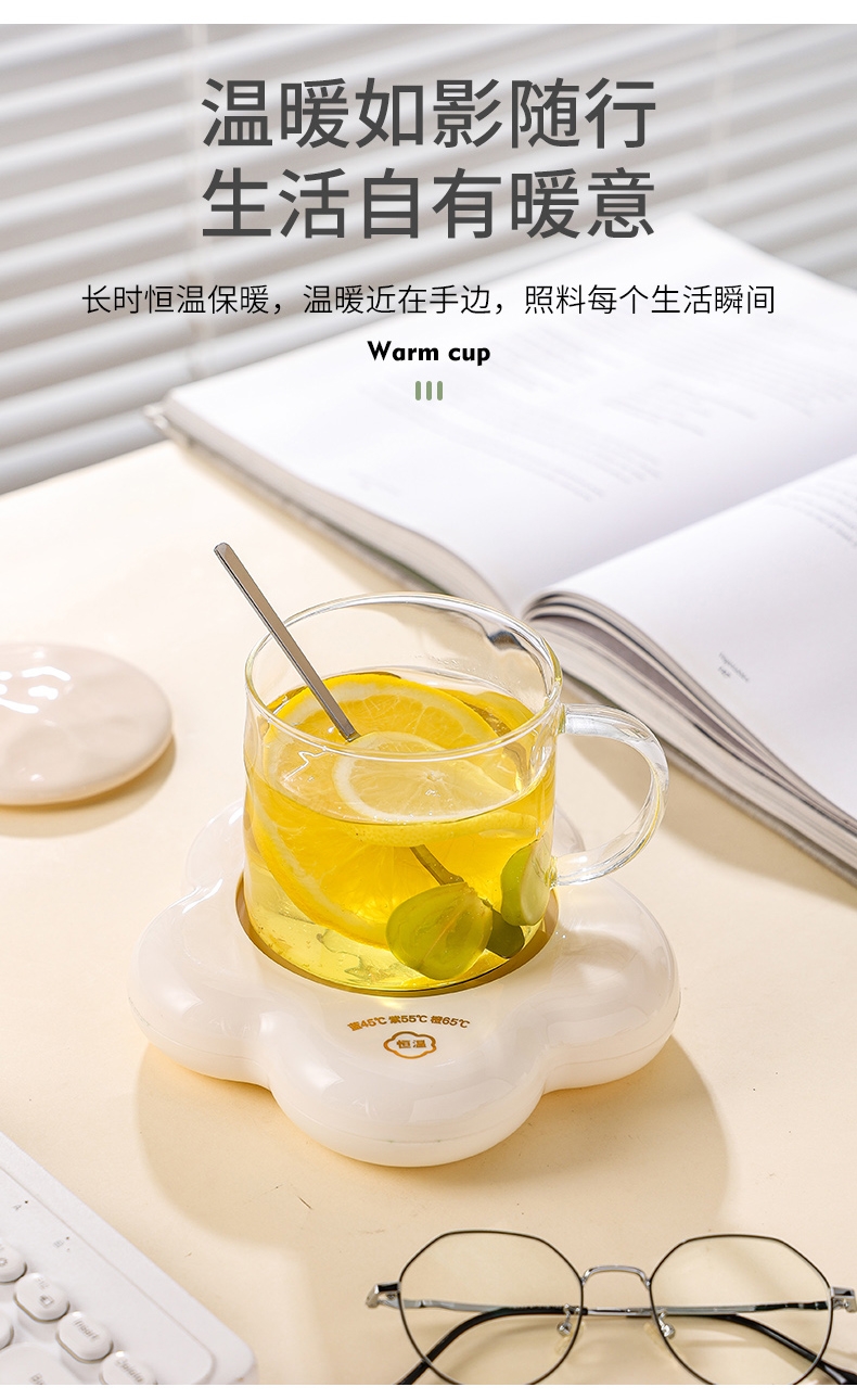 400ml大容量,安全易清洗;三档温控调节,45℃/55℃/65℃;55℃自动恒温,12h超长恒温;16W无噪加热,不挑杯子,快速加热,多彩颜色;极简设计,放办公室/床头都是风景