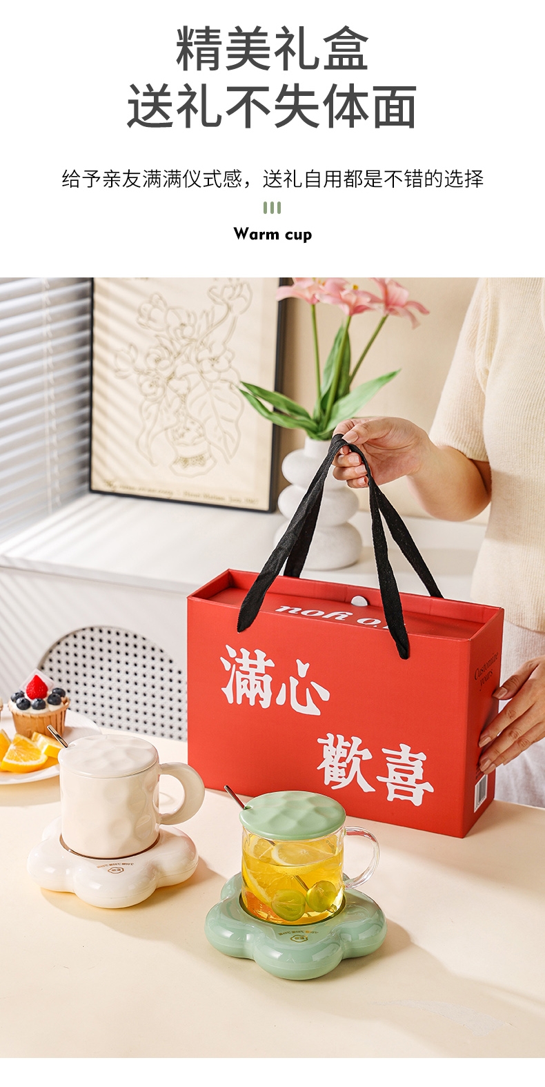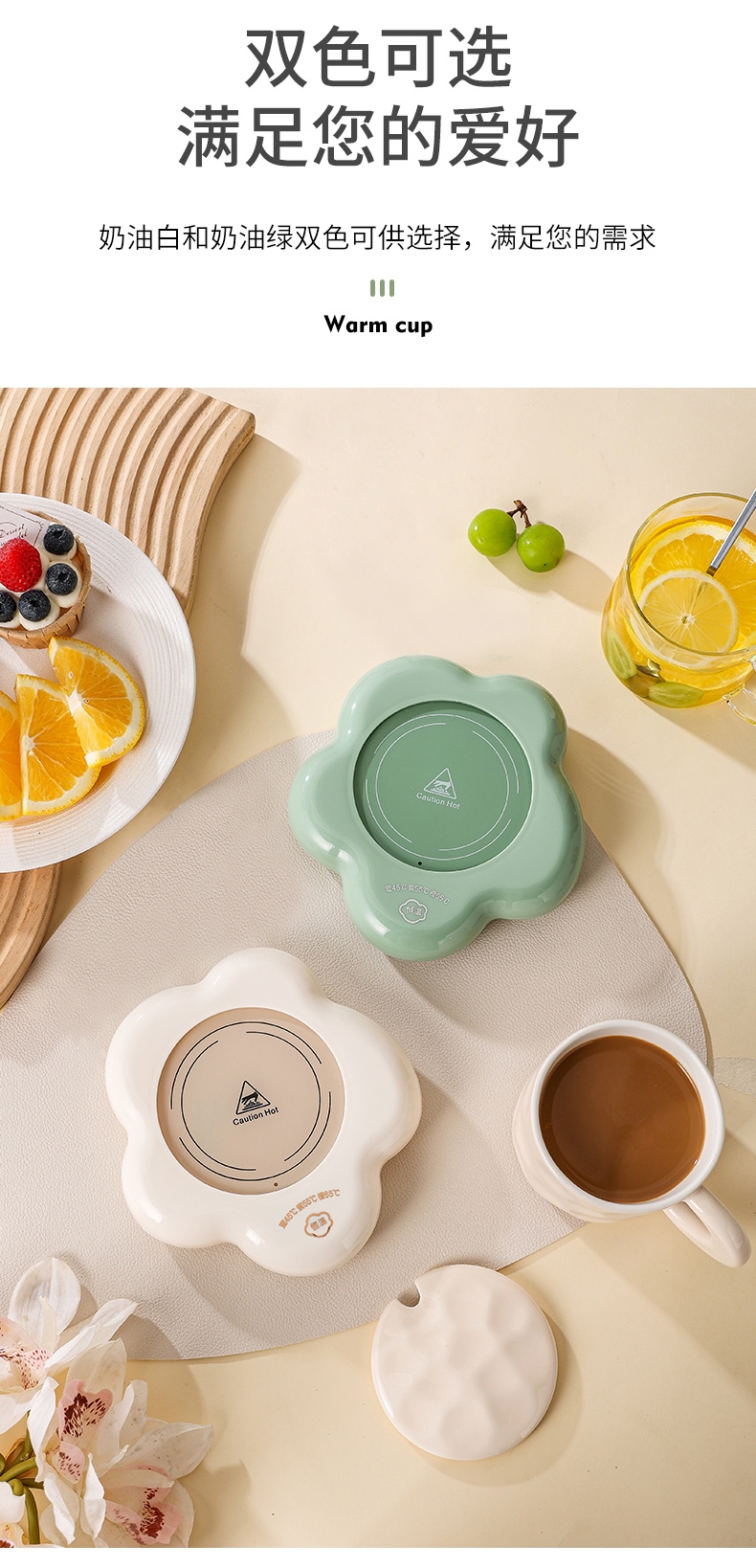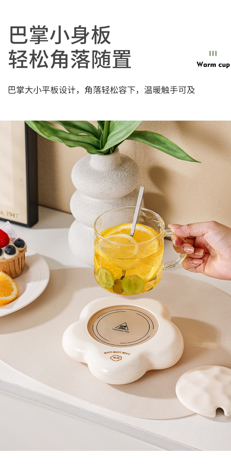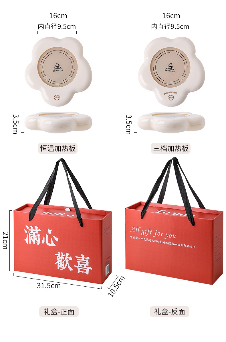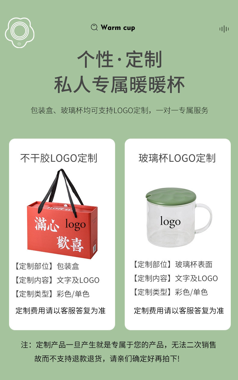 400ml大容量,安全易清洗;三档温控调节,45℃/55℃/65℃;55℃自动恒温,12h超长恒温;16W无噪加热,不挑杯子,快速加热,多彩颜色;极简设计,放办公室/床头都是风景