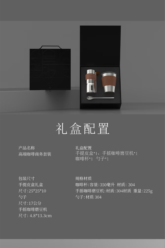 配置清单:手提皮盒*1、手摇咖啡磨豆机*1 咖啡杯*1 勺子*1