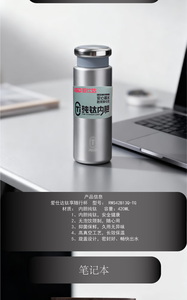爱仕达纯钛随行杯:纯钛锁鲜,轻便无异味; 笔记本:轻薄强能,护眼高效办公;英雄签字笔:金属质感,书写顺滑耐用