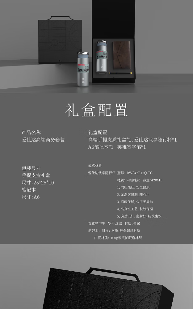 配置清单:高端手提皮质礼盒*1、爱仕达钛享随行杯*1 A6笔记本*1 英雄签字笔*1
