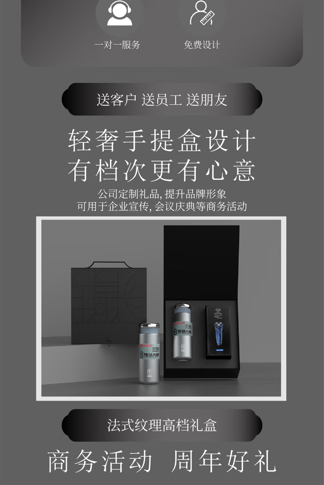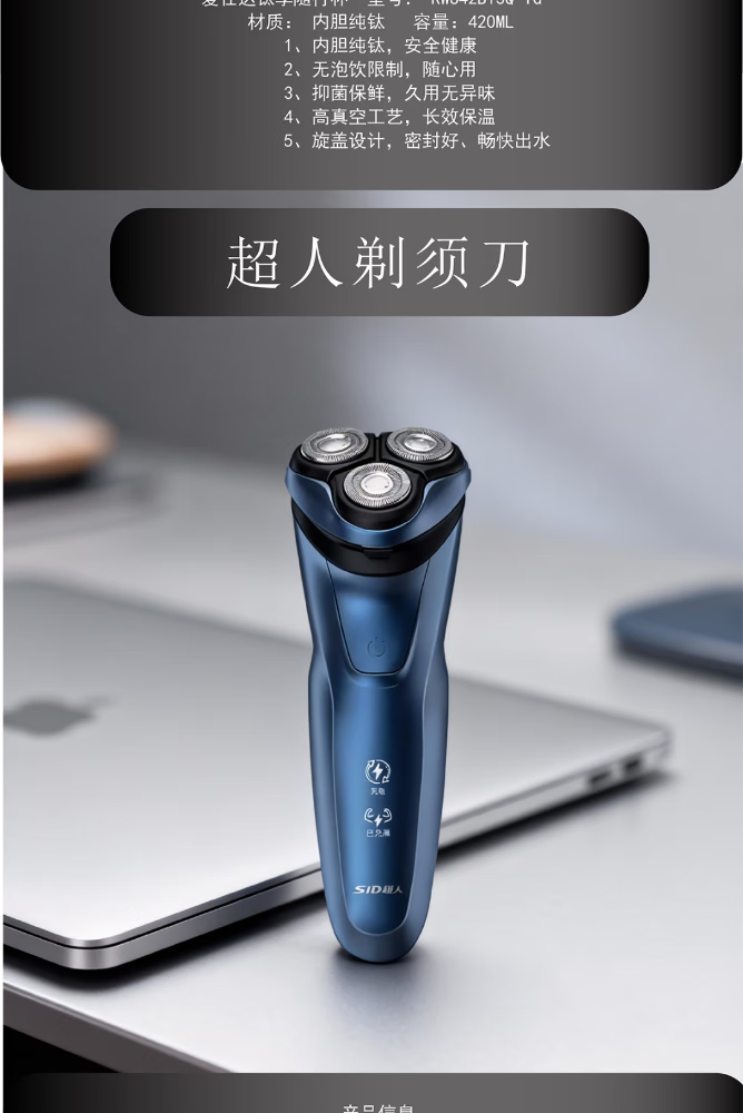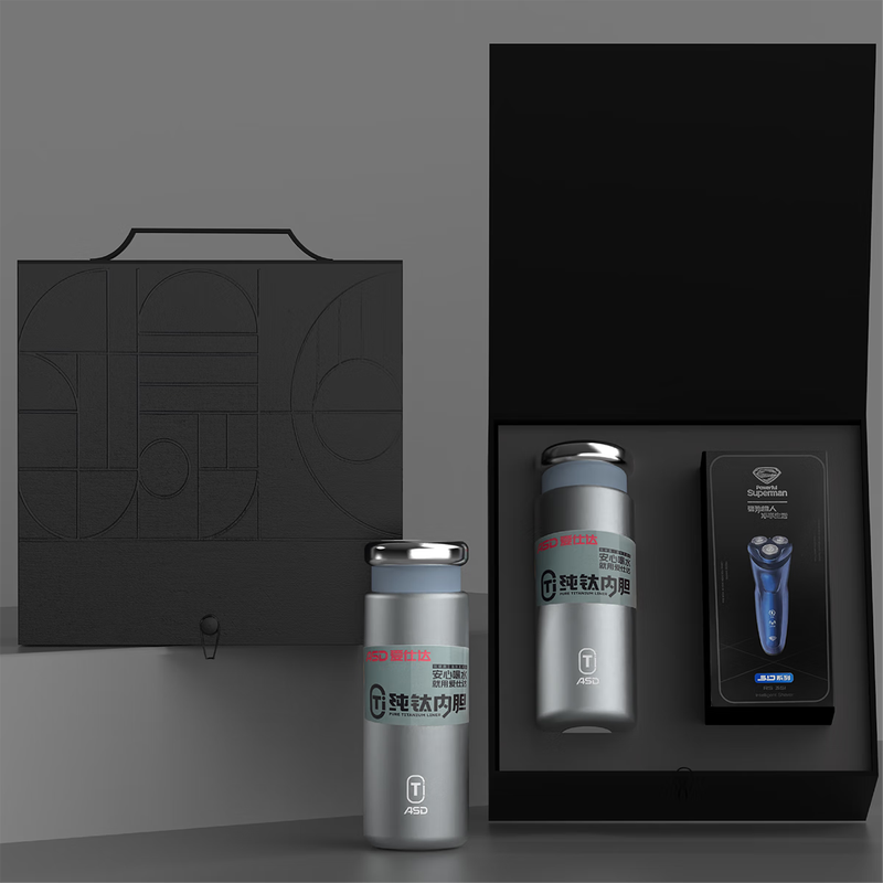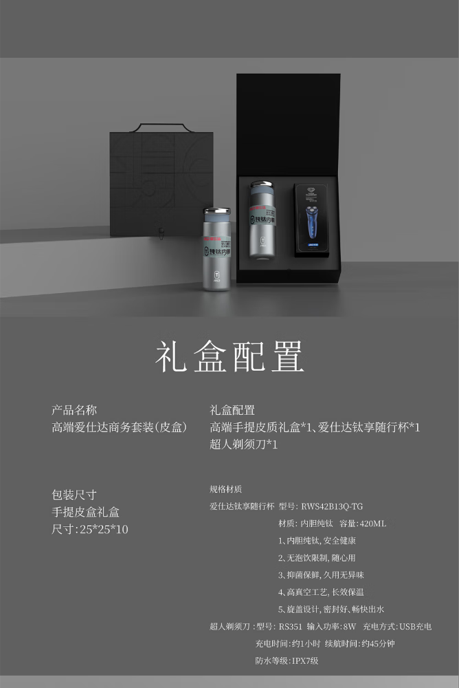 配置清单:高端手提皮质礼盒*1、爱仕达钛享随行杯*1 超人剃须刀*1
