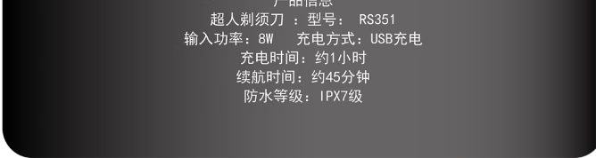 超人剃须刀:型号: RS351 输入功率:8W 充电方式:USB充电 充电时间:约1小时 续航时间:约45分钟 防水等级:IPX7级