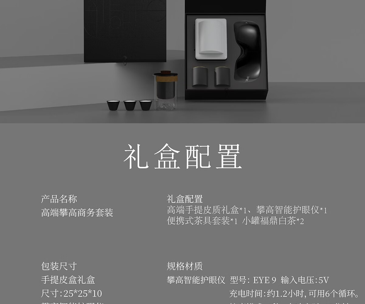 配置清单:高端手提皮质礼盒*1、攀高智能护眼仪*1 便携式茶具套装*1 小罐福鼎白茶*2