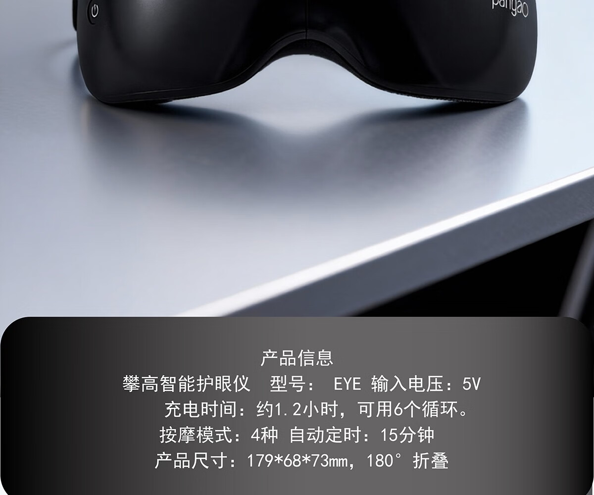 攀高智能护眼仪:型号: EYE 9 输入电压:5V 充电时间:约1.2小时,可用6个循环。 按摩模式:4种 自动定时:15分钟