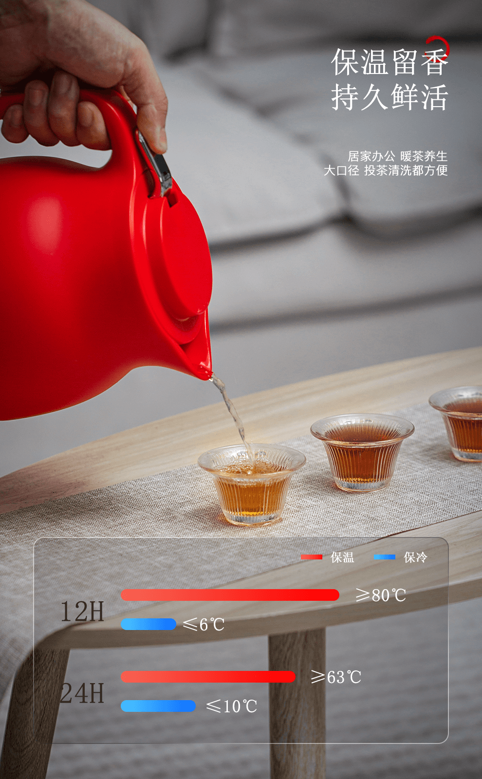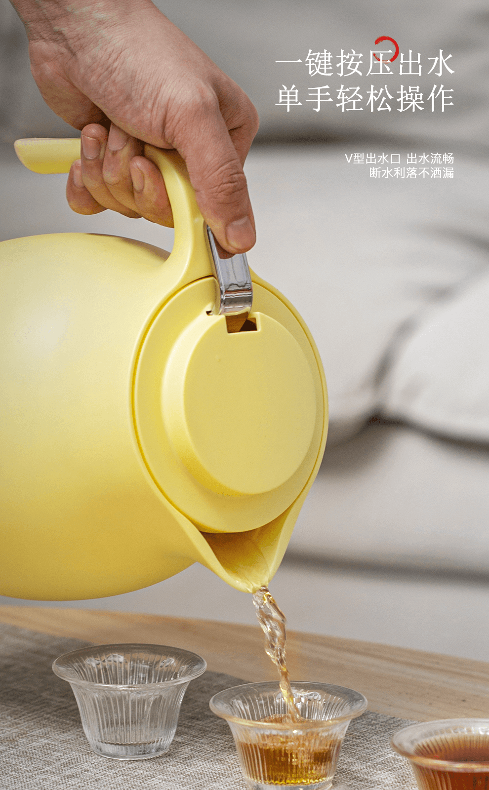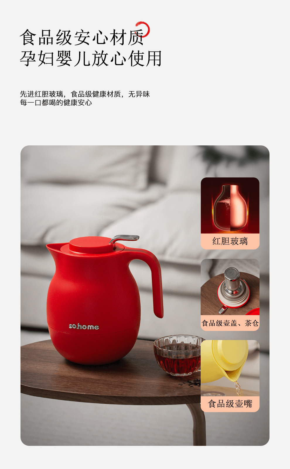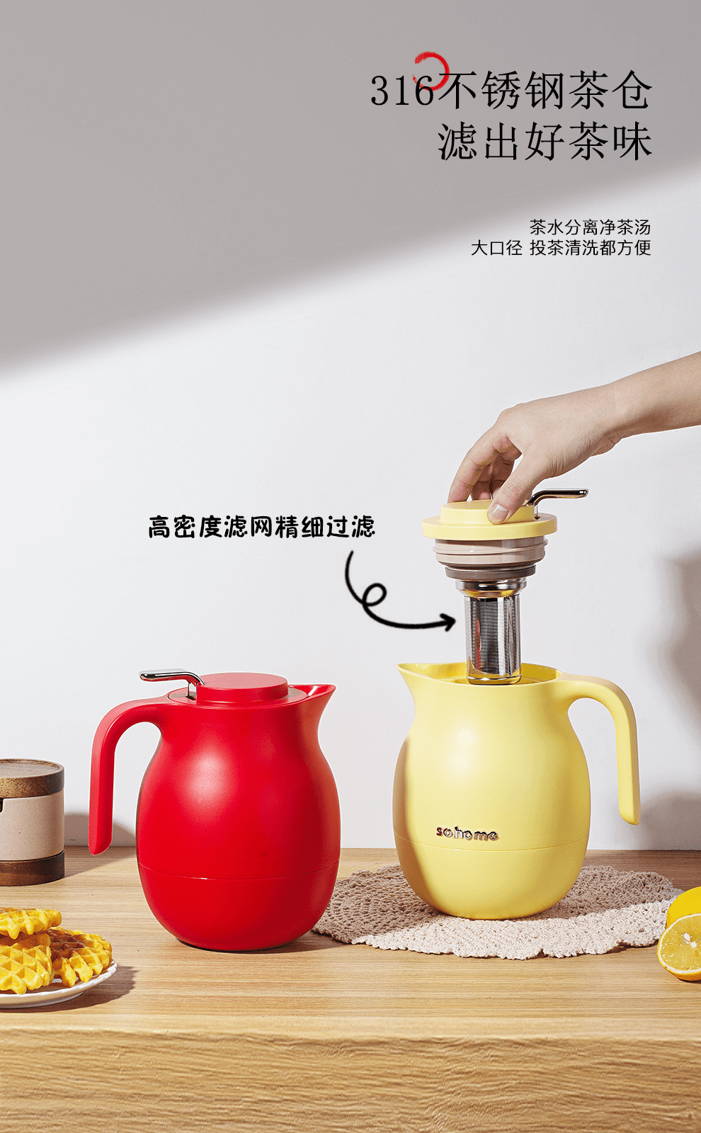 大容量316不锈钢茶仓,茶水分离,省心省力;一键按压式出水,单手操作很轻松,把手握持舒适;密封防漏,倾倒不漏水;一键按压出水,倒茶水流顺畅,不挂壁;红胆玻璃内胆,48小时保温,底部更耐压,材质更稳定