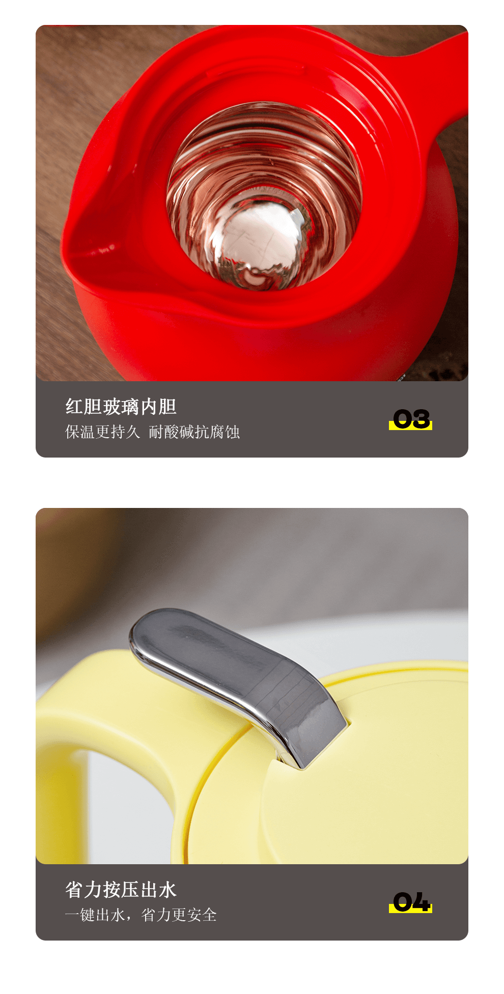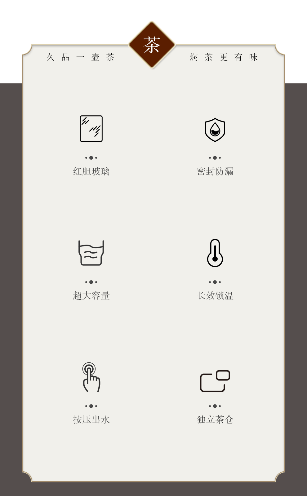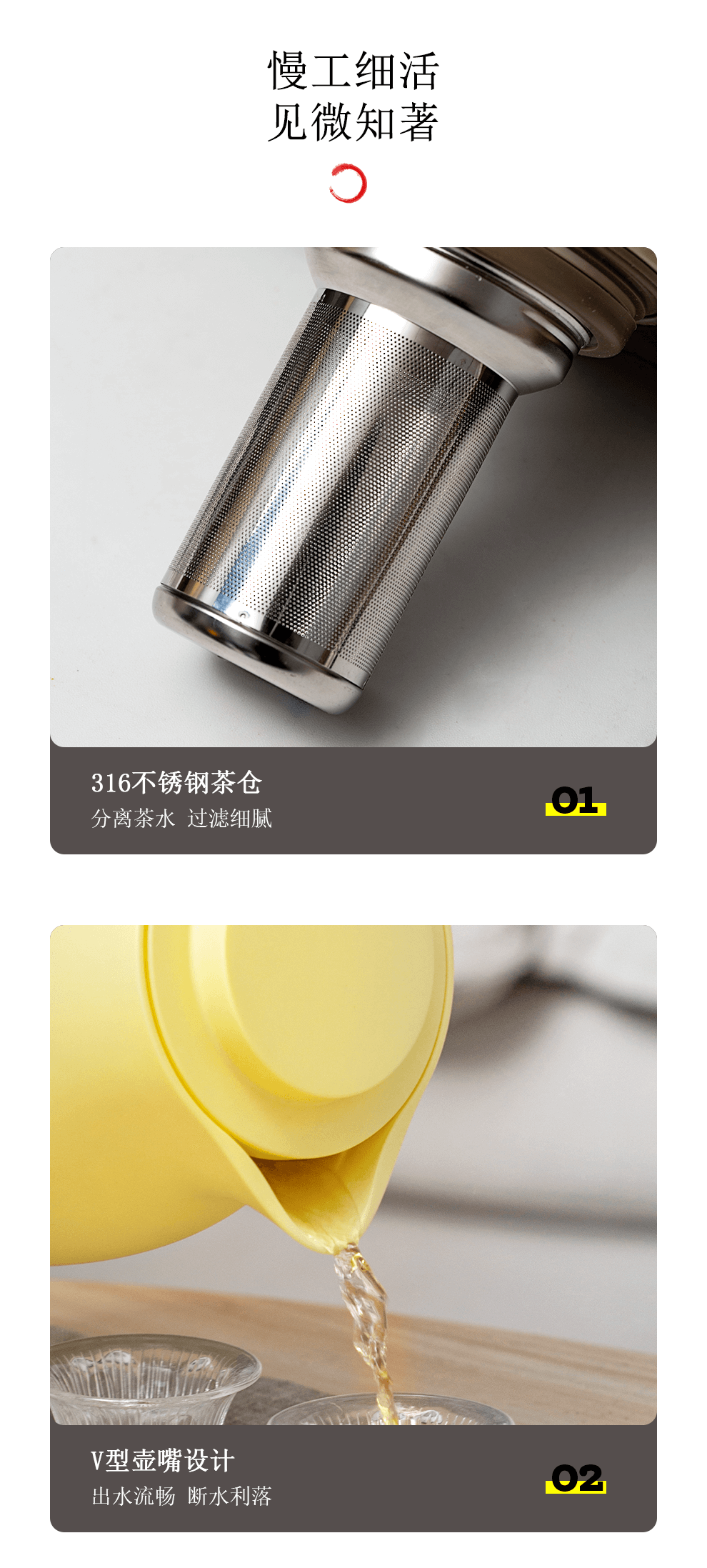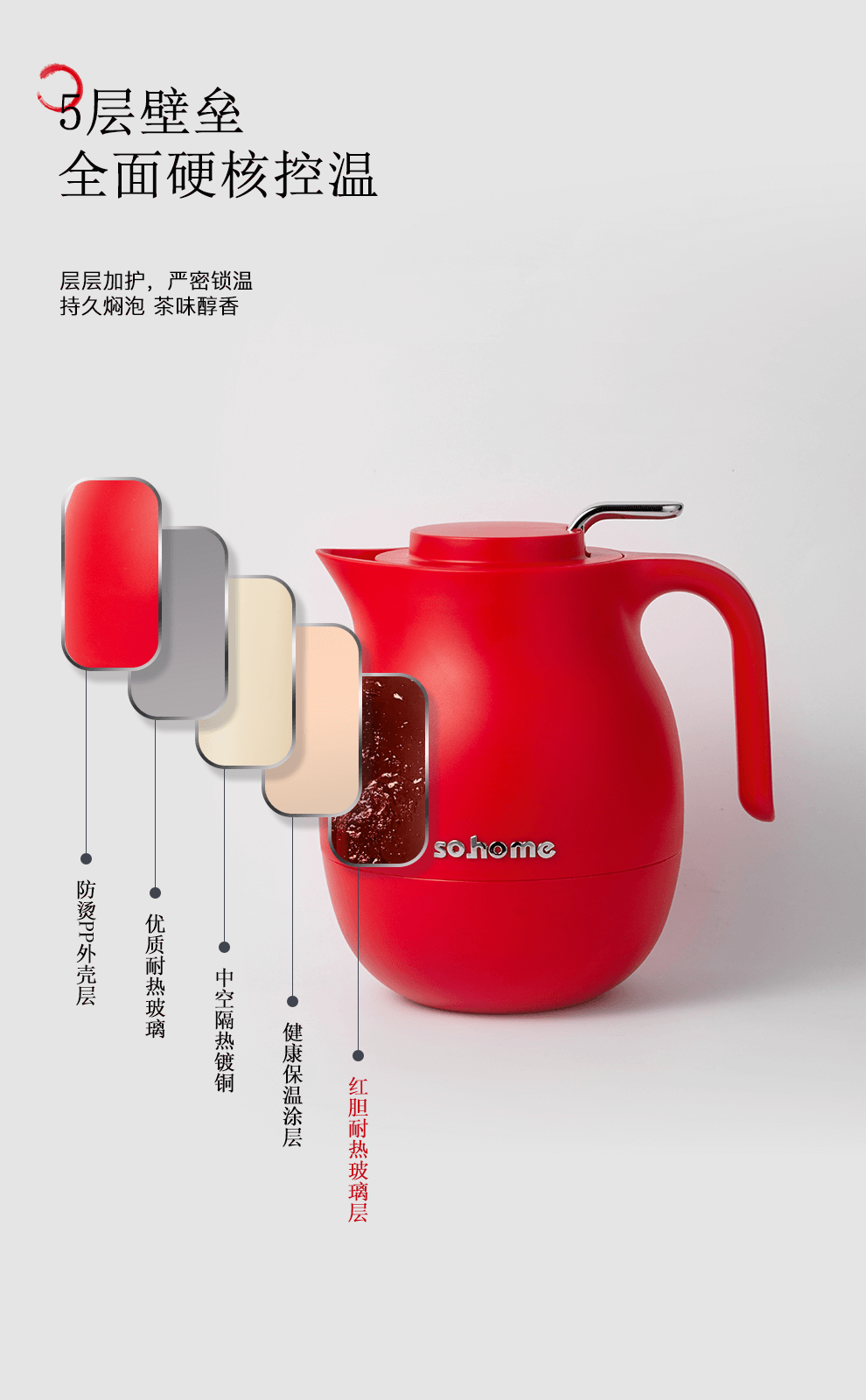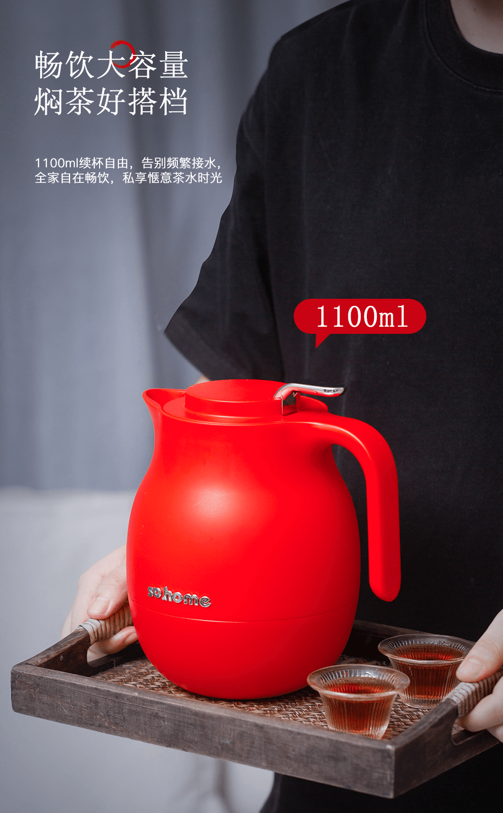 大容量316不锈钢茶仓,茶水分离,省心省力;一键按压式出水,单手操作很轻松,把手握持舒适;密封防漏,倾倒不漏水;一键按压出水,倒茶水流顺畅,不挂壁;红胆玻璃内胆,48小时保温,底部更耐压,材质更稳定