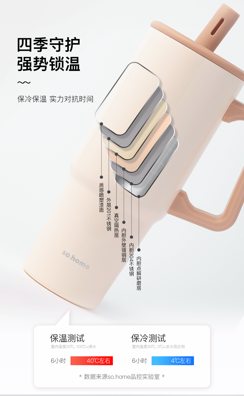 产品材质:杯身-内304不锈钢、外201不锈钢;吸管/把手-PP、杯盖组件-tritan、硅橡胶