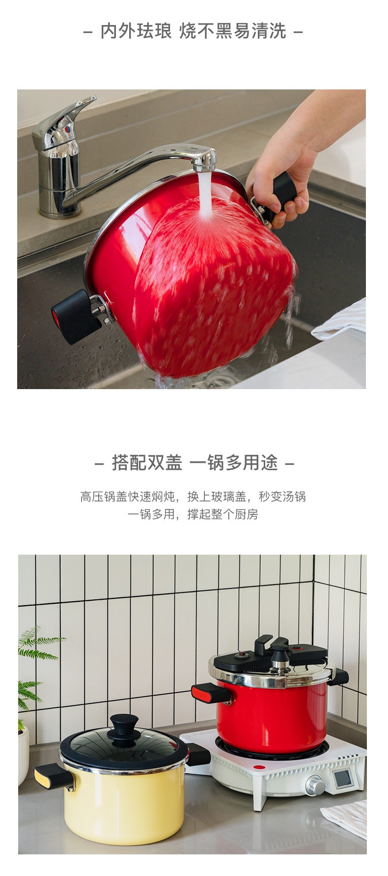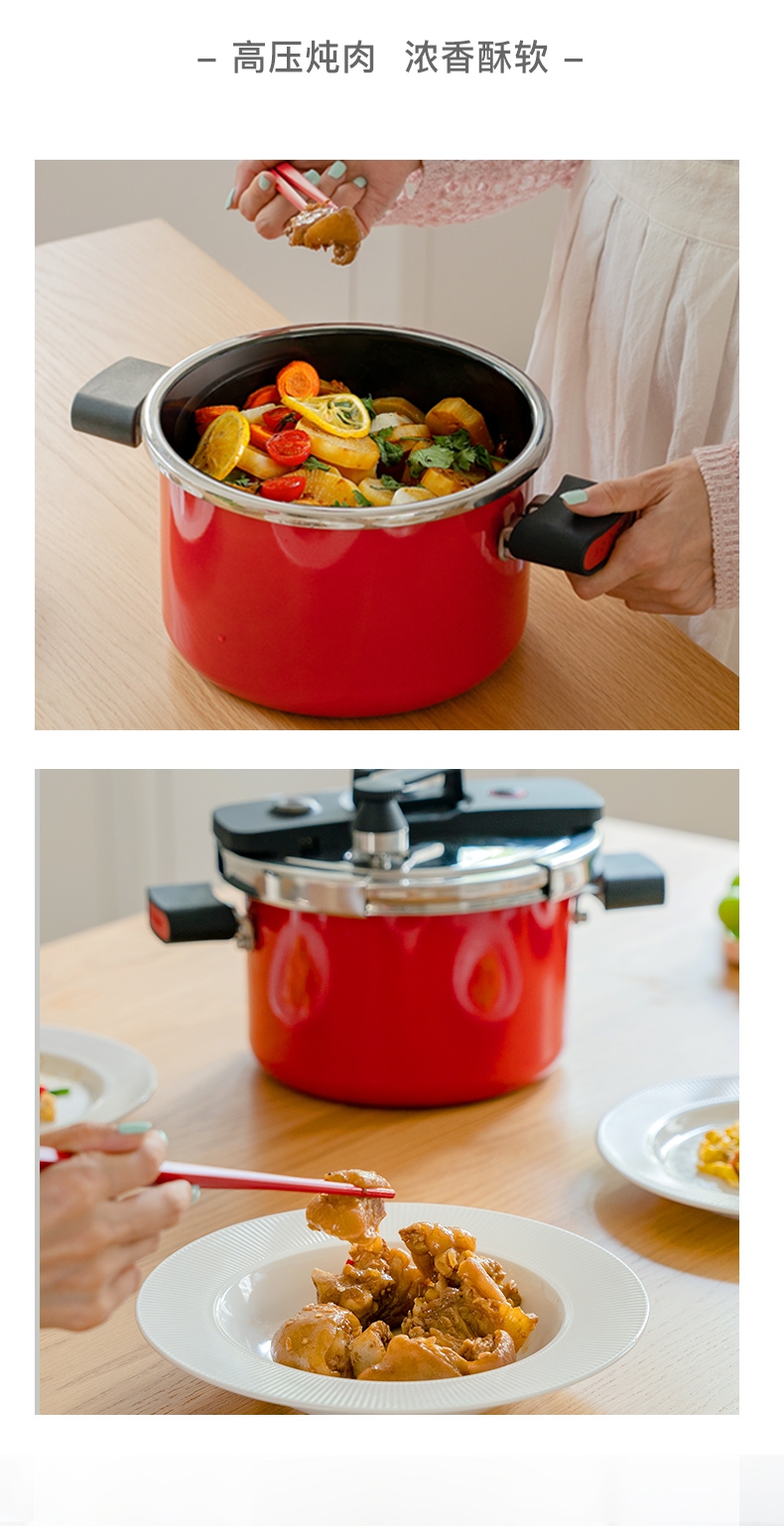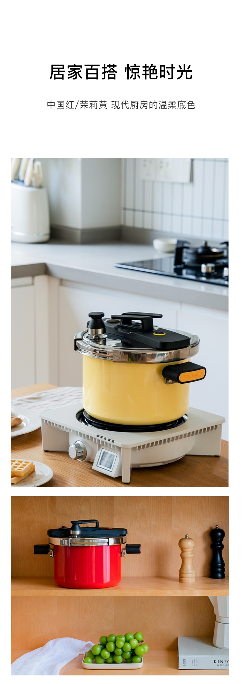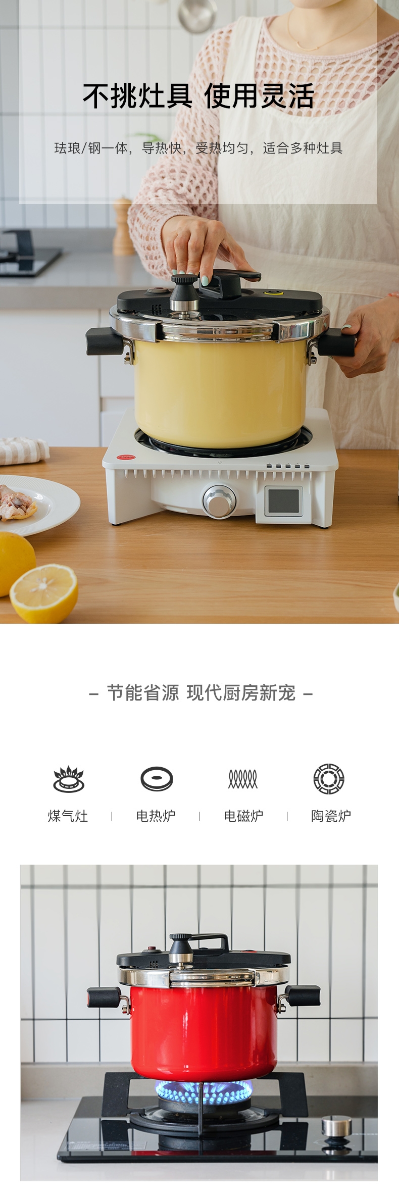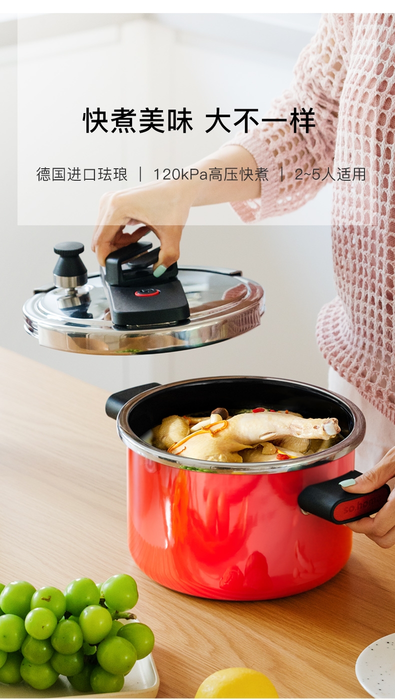 120kpa的压力,专利型旋转开关设计;一锅双盖,高压烹饪硬菜;430不锈钢锅体,用于煤气灶、电磁炉、电陶炉的烹饪;德国进口珐琅釉彩涂装,耐腐蚀抗酸碱;四重840℃高温窑炉烧制, 坚固耐用,久烧不黑