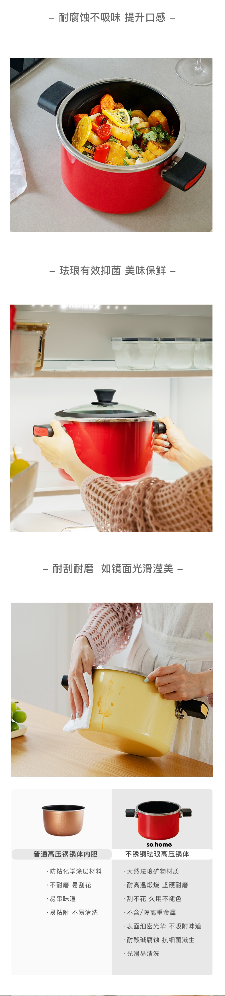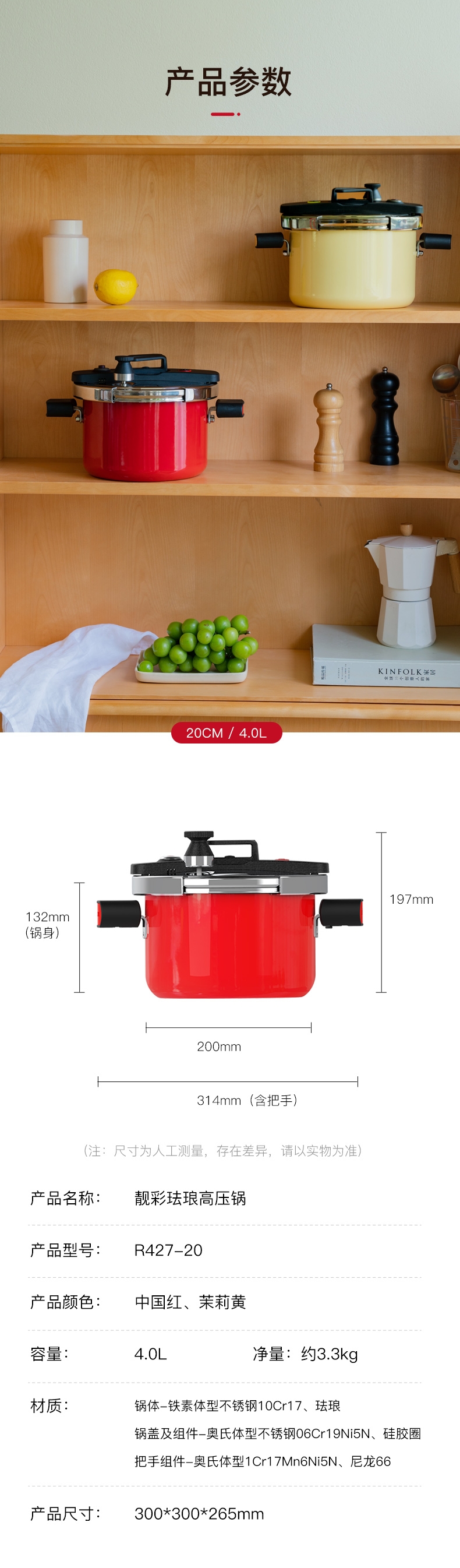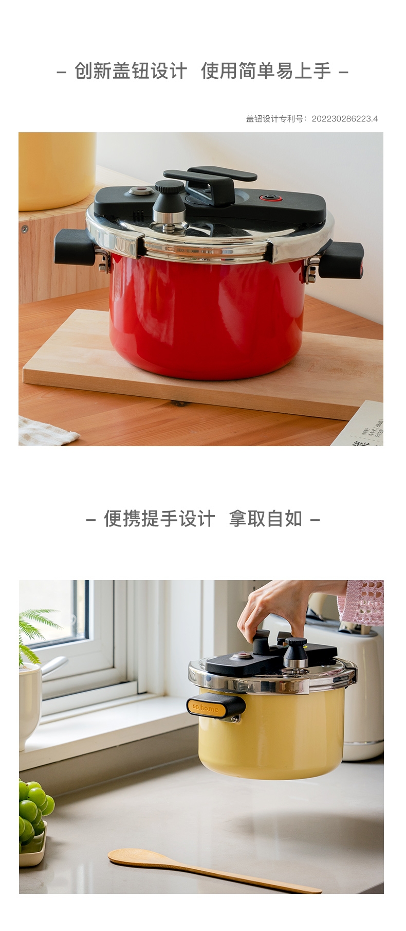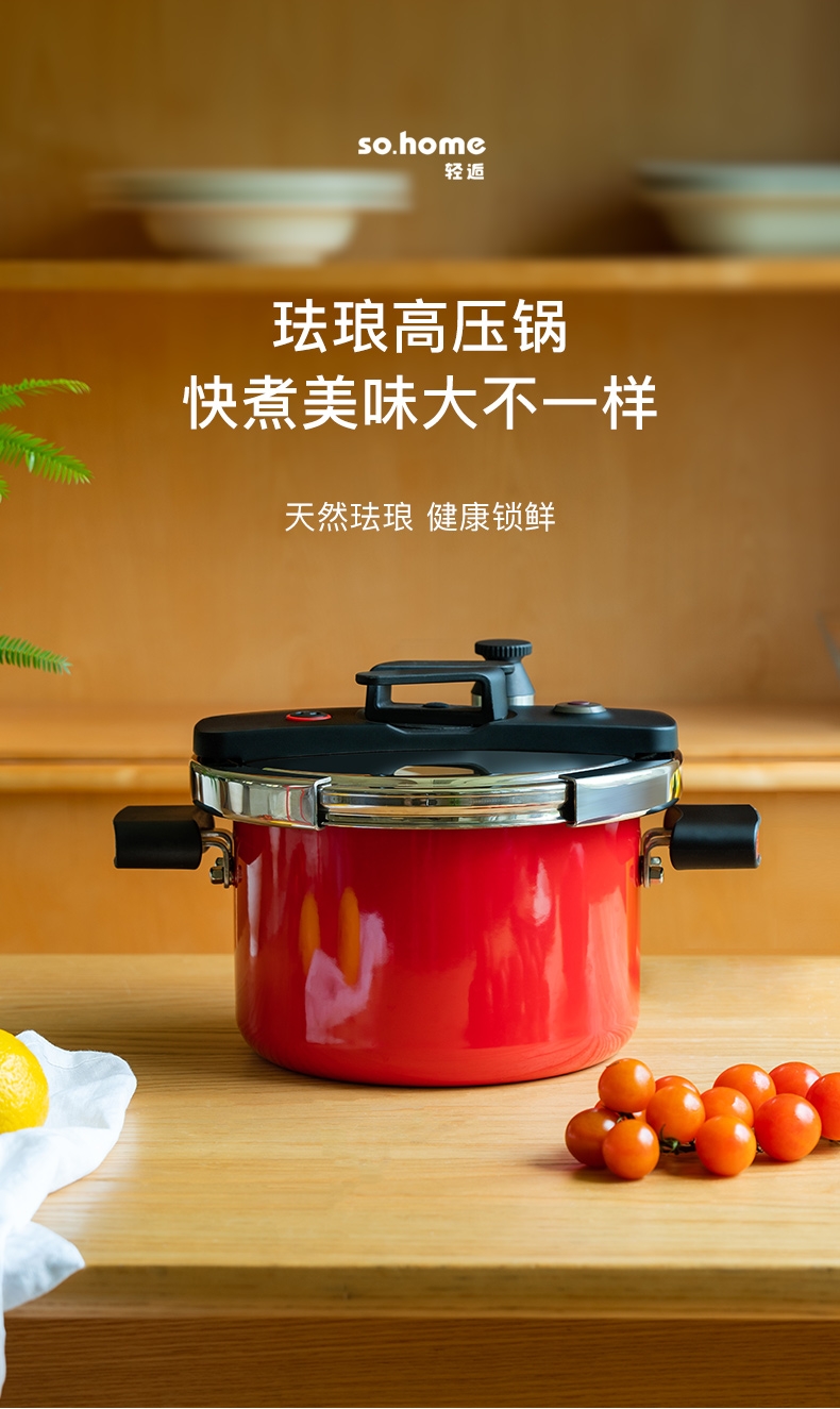 120kpa的压力,专利型旋转开关设计;一锅双盖,高压烹饪硬菜;430不锈钢锅体,用于煤气灶、电磁炉、电陶炉的烹饪;德国进口珐琅釉彩涂装,耐腐蚀抗酸碱;四重840℃高温窑炉烧制, 坚固耐用,久烧不黑