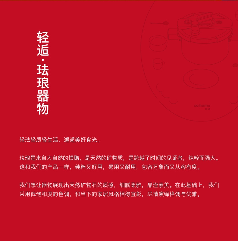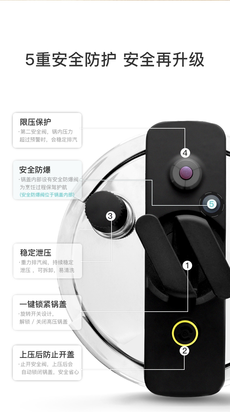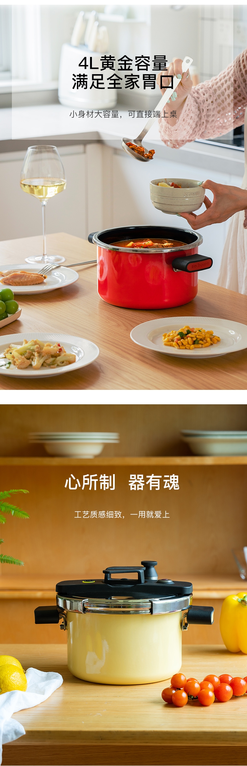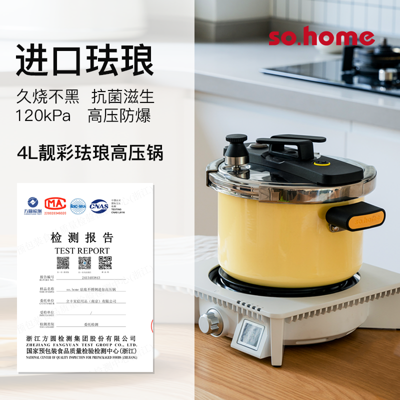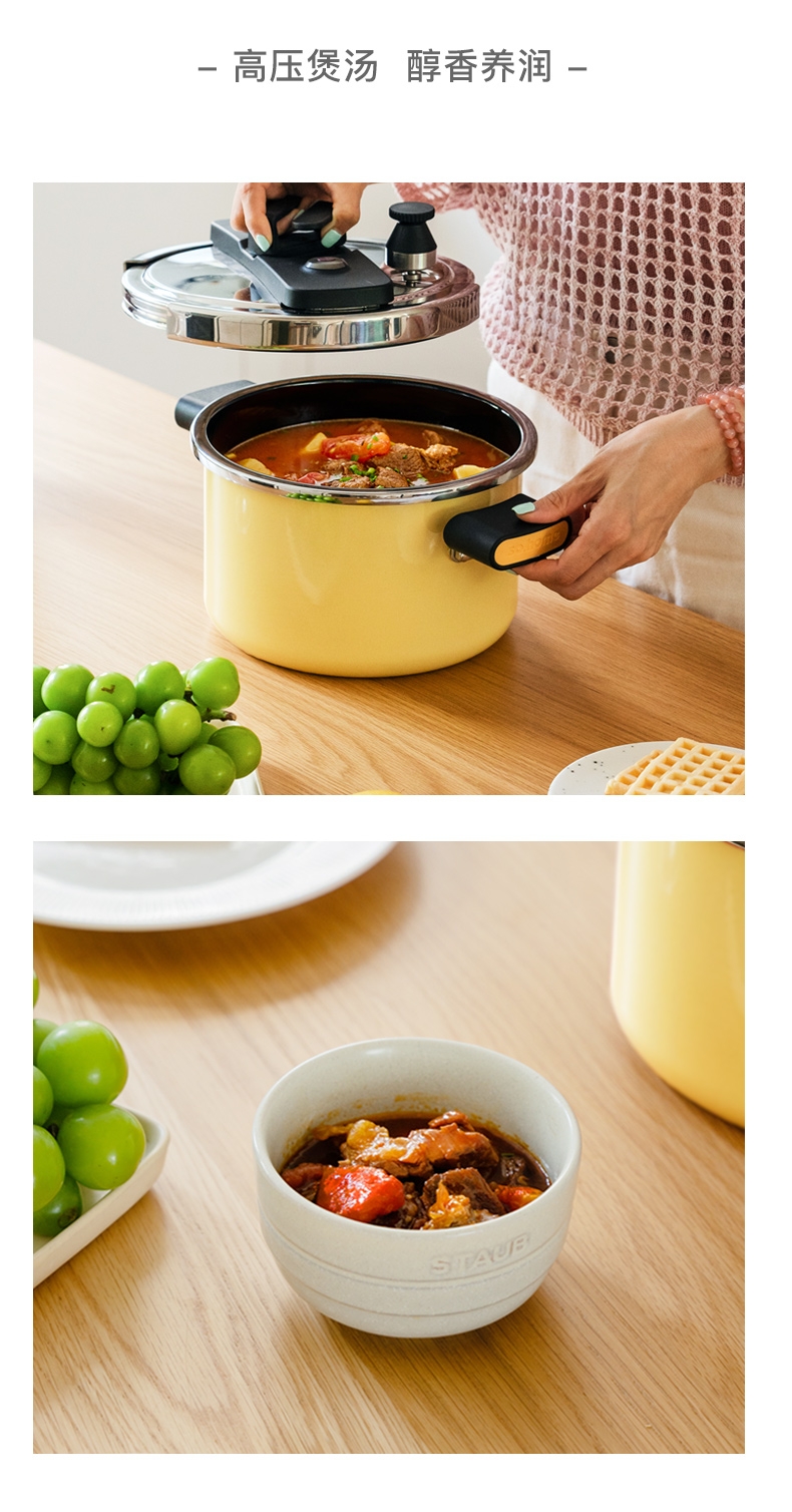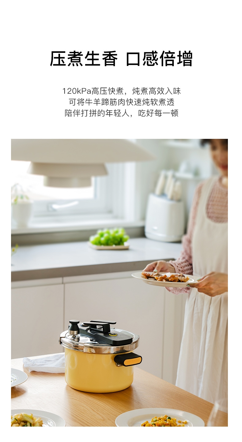 120kpa的压力,专利型旋转开关设计;一锅双盖,高压烹饪硬菜;430不锈钢锅体,用于煤气灶、电磁炉、电陶炉的烹饪;德国进口珐琅釉彩涂装,耐腐蚀抗酸碱;四重840℃高温窑炉烧制, 坚固耐用,久烧不黑