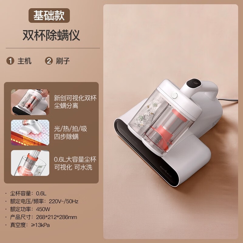 双杯除螨,尘气真分离;左分离右过滤,除螨倍快;不堵灰,吸力持久常用如新;0.6L大容量,无需频繁倒尘