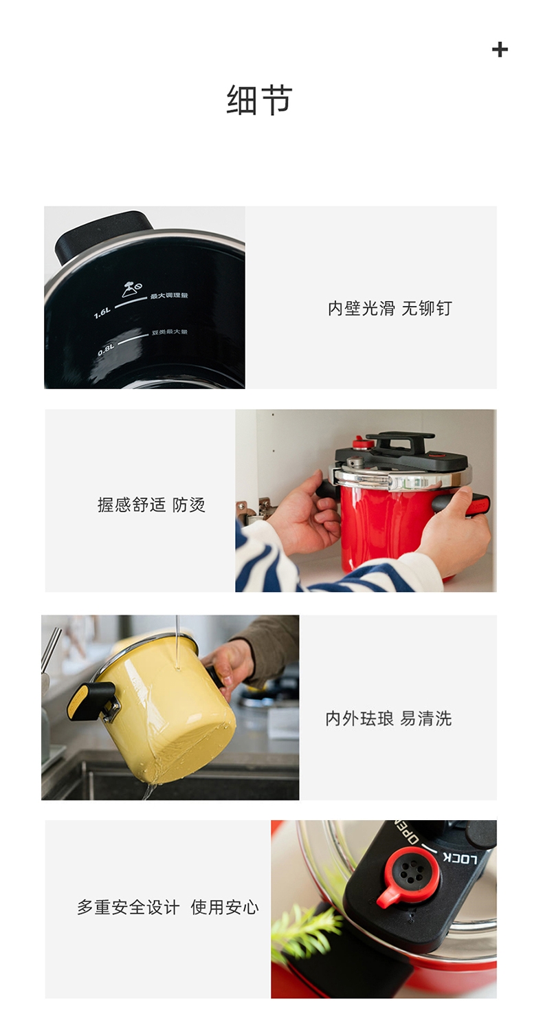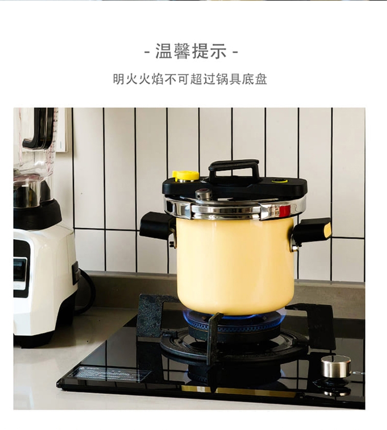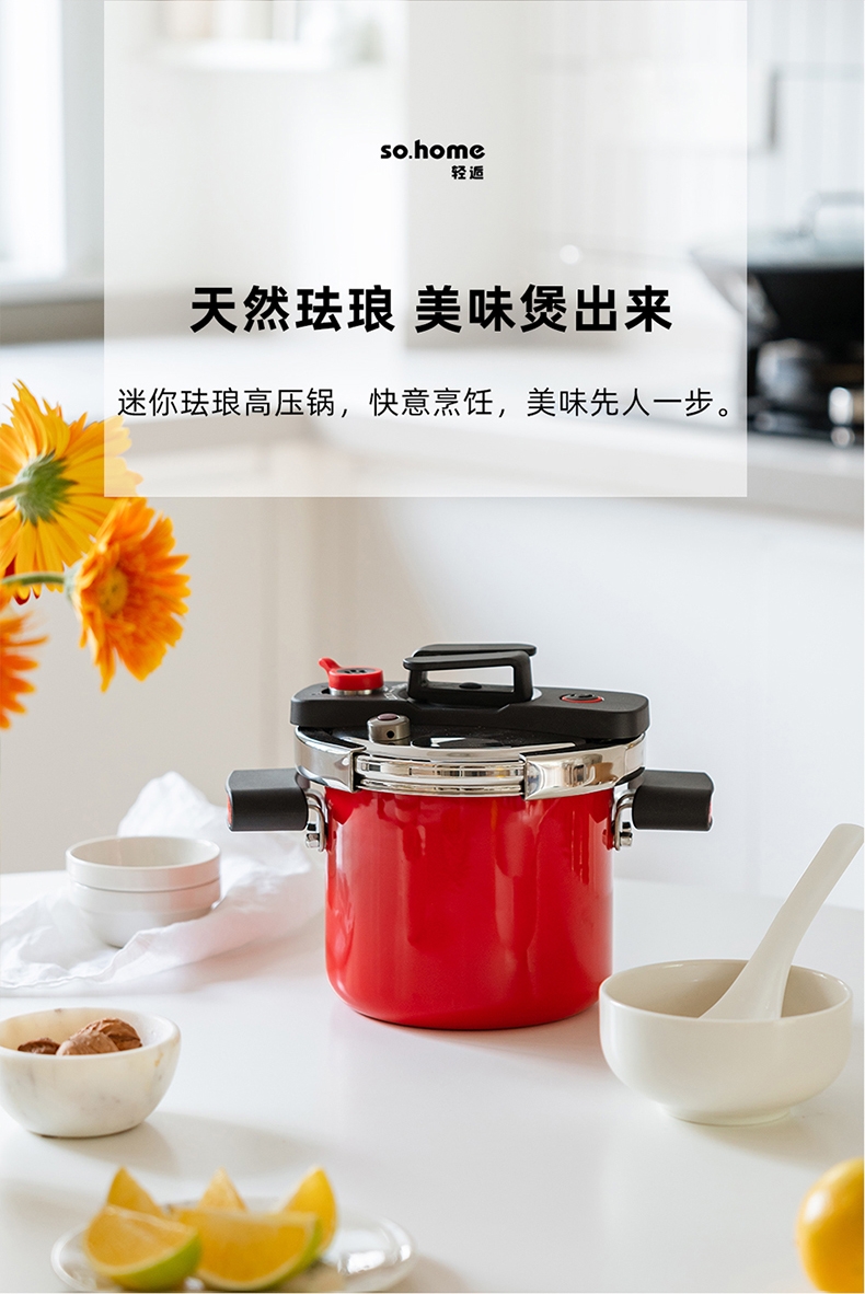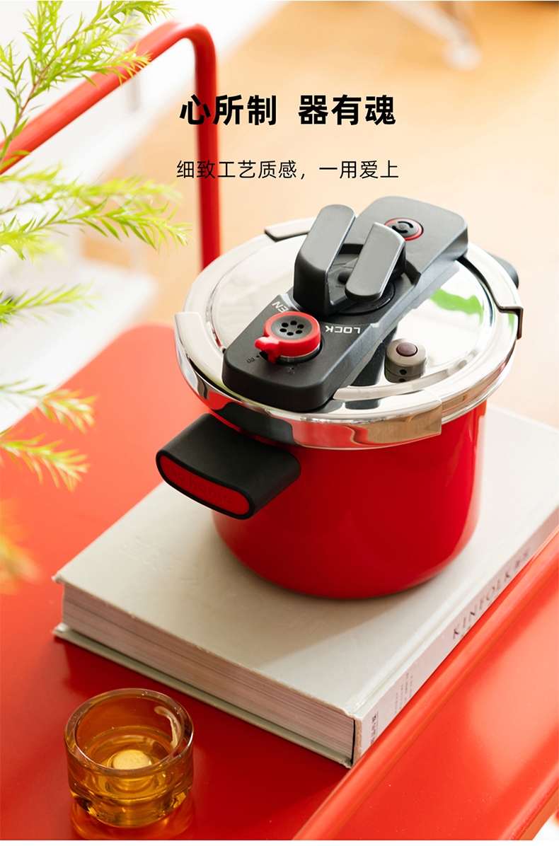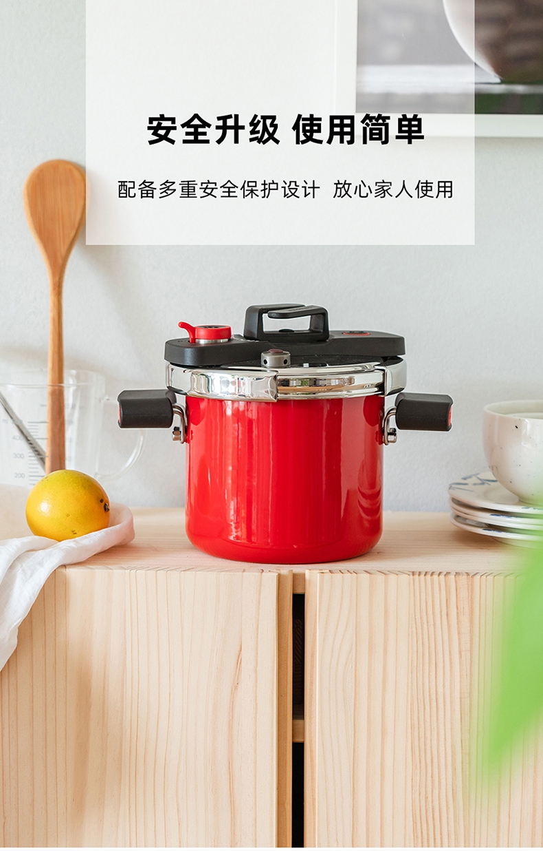 小肚子大能量,80kpa的压力,专利型旋转开关设计;一锅双盖,高压烹饪硬菜;430不锈钢锅体,可用于煤气灶、电磁炉、电陶炉;德国进口珐琅釉彩涂装,耐腐蚀抗酸碱;四重840℃高温窑炉烧制, 坚固耐用,久烧不黑