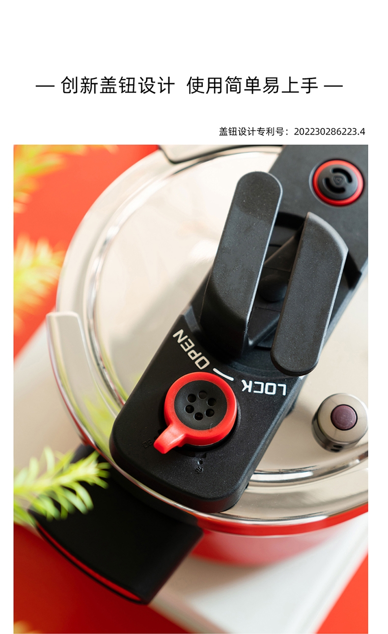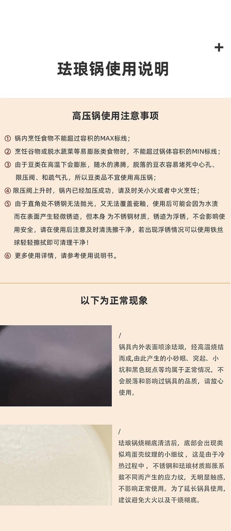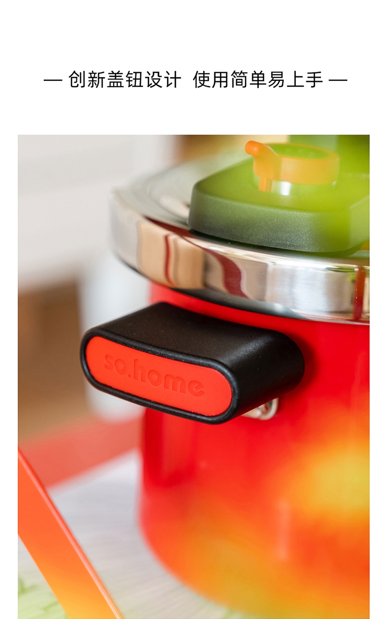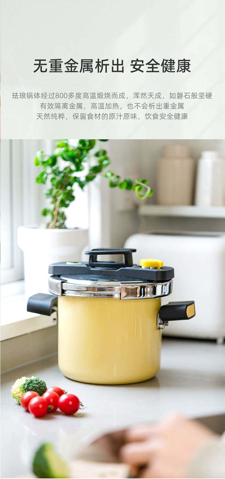 小肚子大能量,80kpa的压力,专利型旋转开关设计;一锅双盖,高压烹饪硬菜;430不锈钢锅体,可用于煤气灶、电磁炉、电陶炉;德国进口珐琅釉彩涂装,耐腐蚀抗酸碱;四重840℃高温窑炉烧制, 坚固耐用,久烧不黑