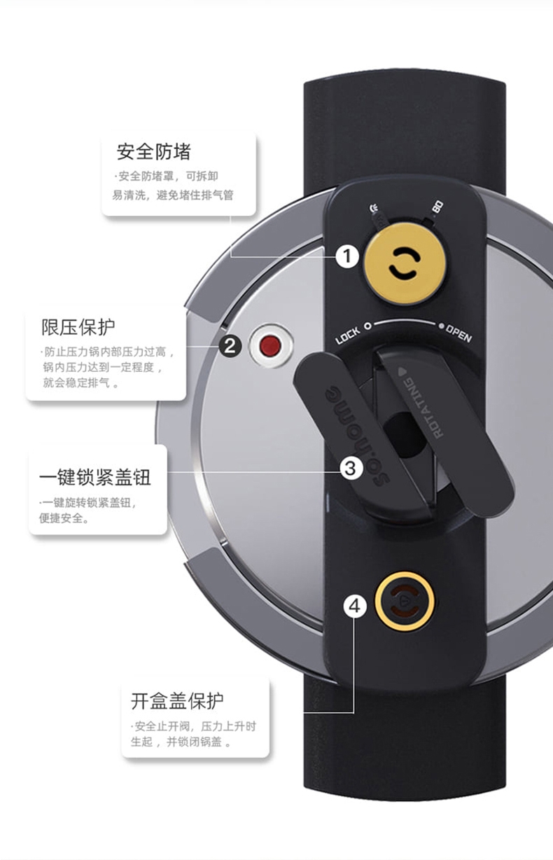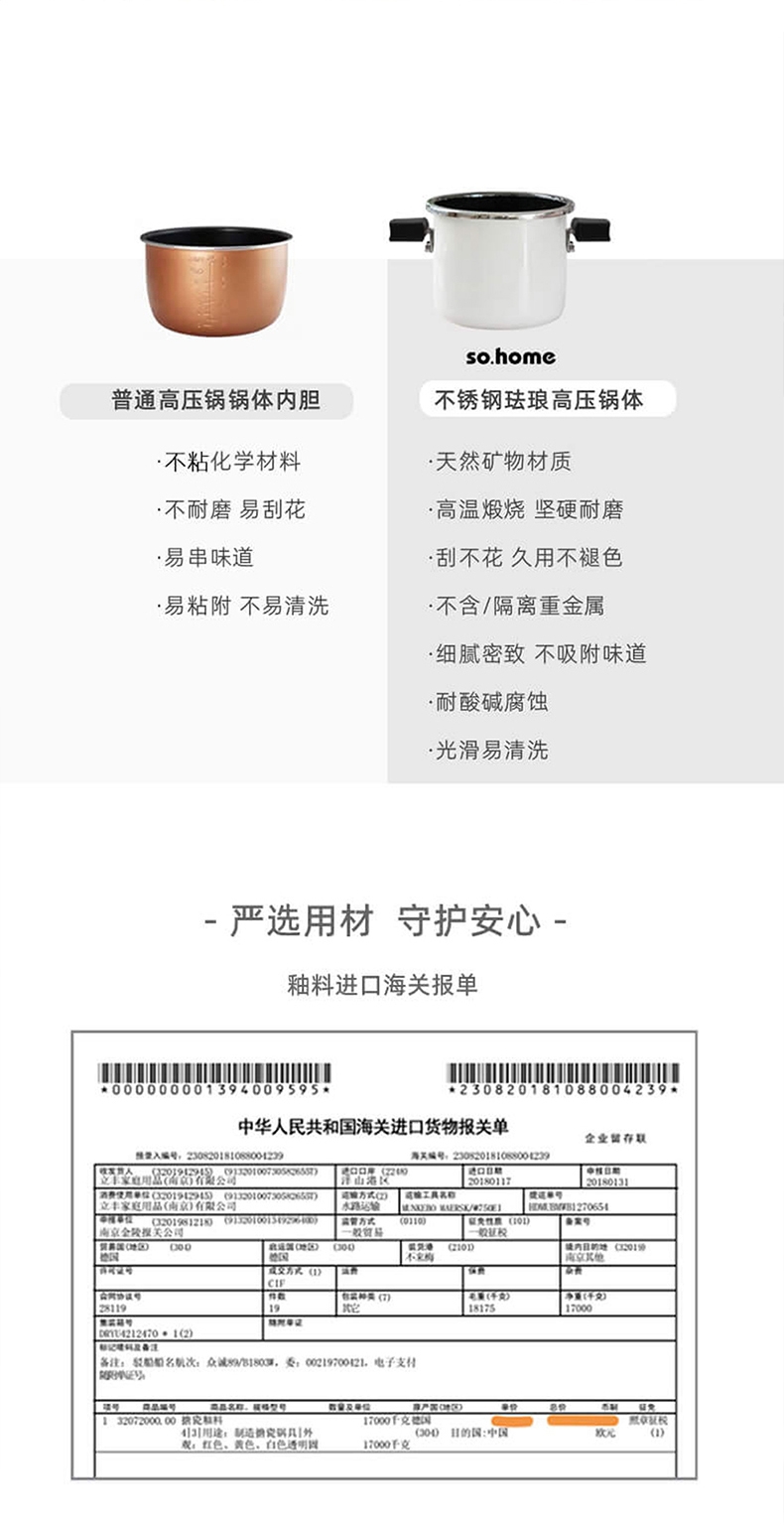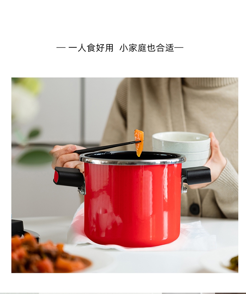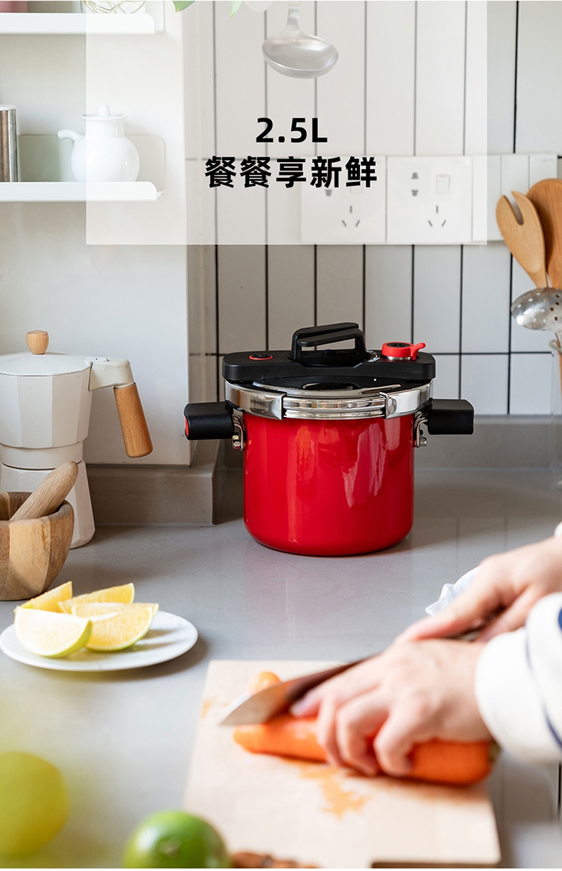 小肚子大能量,80kpa的压力,专利型旋转开关设计;一锅双盖,高压烹饪硬菜;430不锈钢锅体,可用于煤气灶、电磁炉、电陶炉;德国进口珐琅釉彩涂装,耐腐蚀抗酸碱;四重840℃高温窑炉烧制, 坚固耐用,久烧不黑