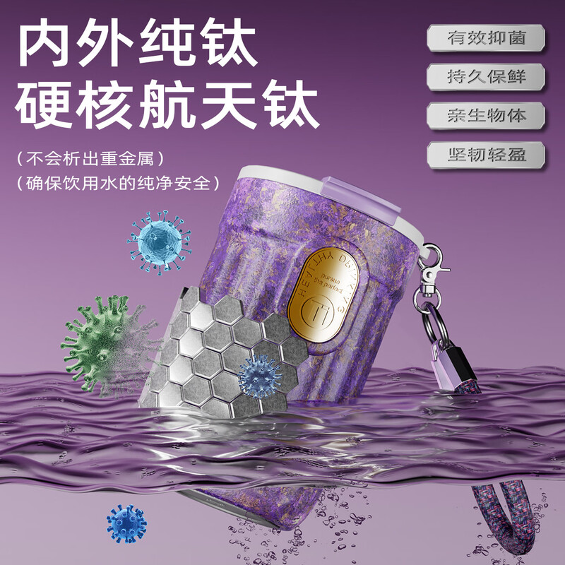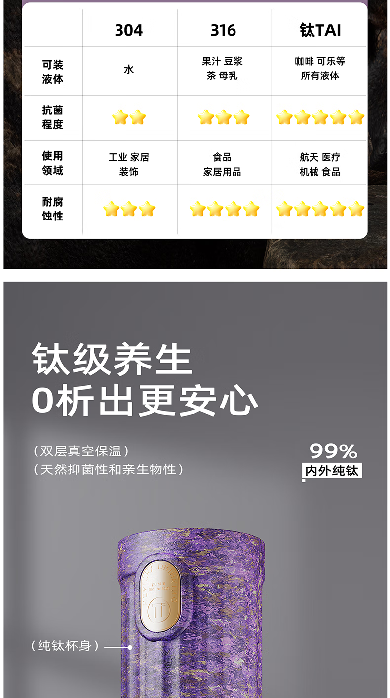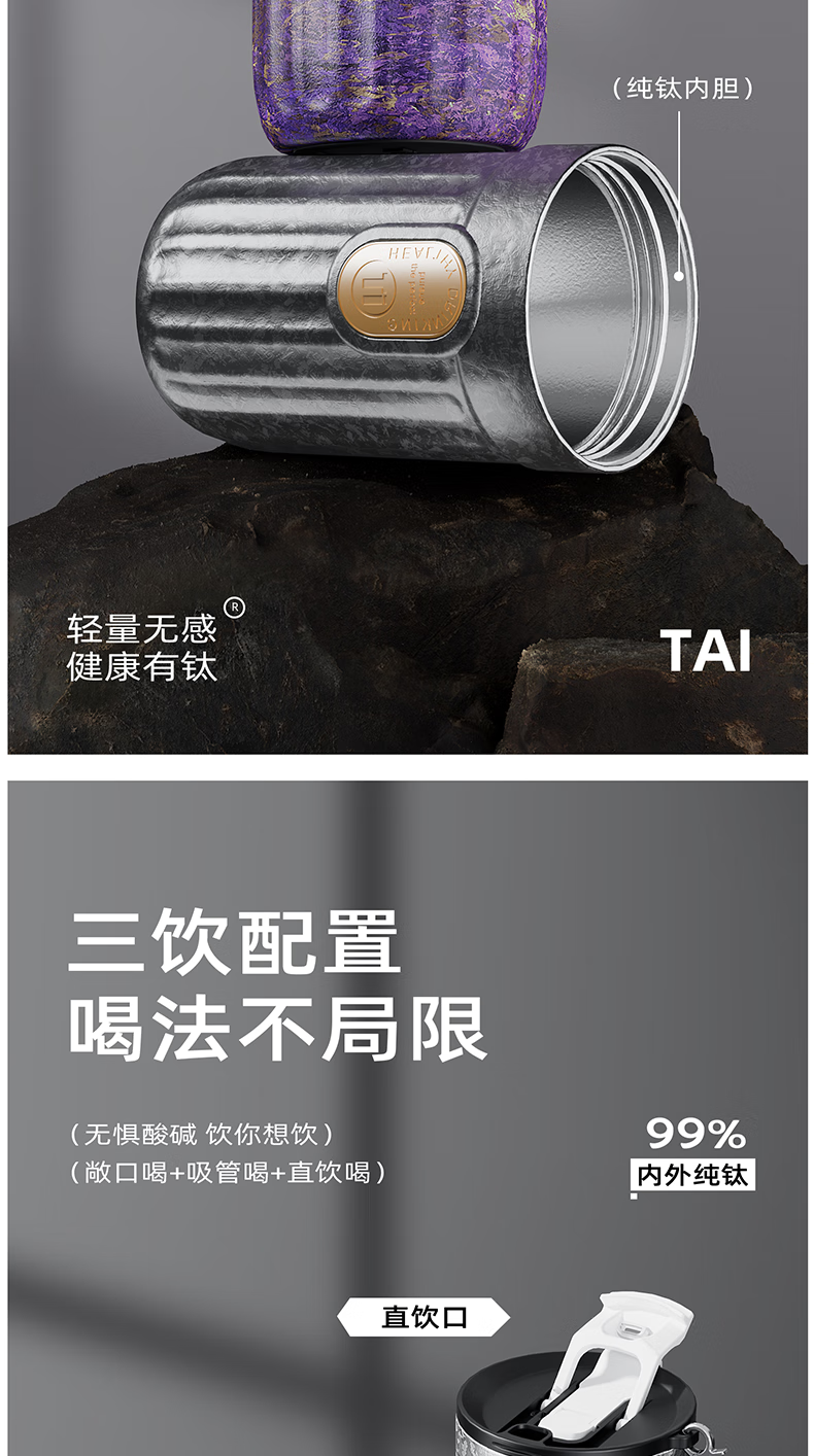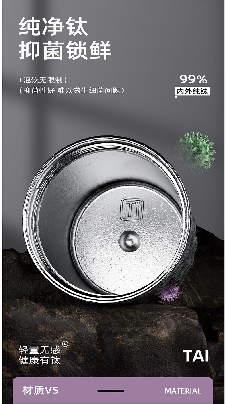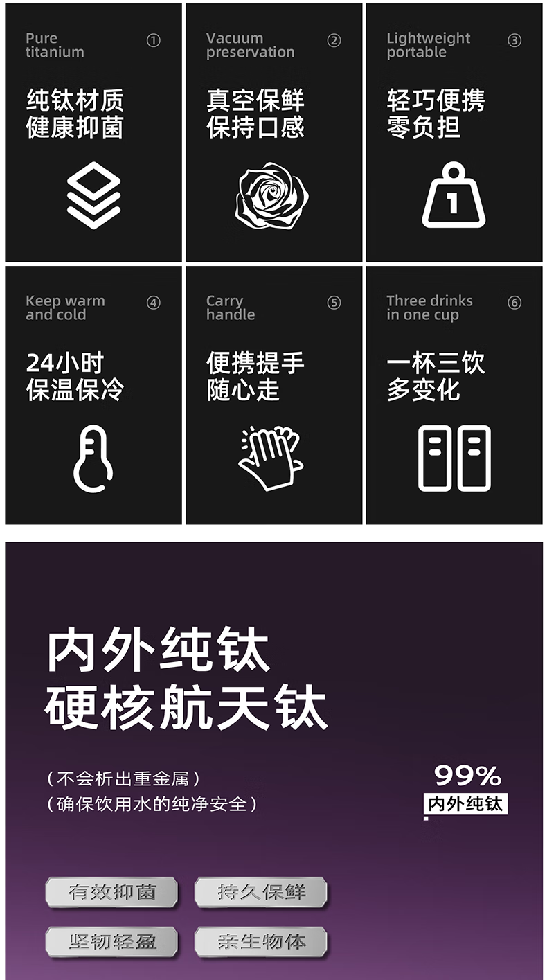 内外99.8%纯钛、健康有保障;保鲜饮品、抑制多种细菌滋生;双层真空、保温&保冷、坚韧轻盈;不含重金属、亲和人体、耐酸碱抗腐蚀;吸饮/直饮/敞口三种饮水模式