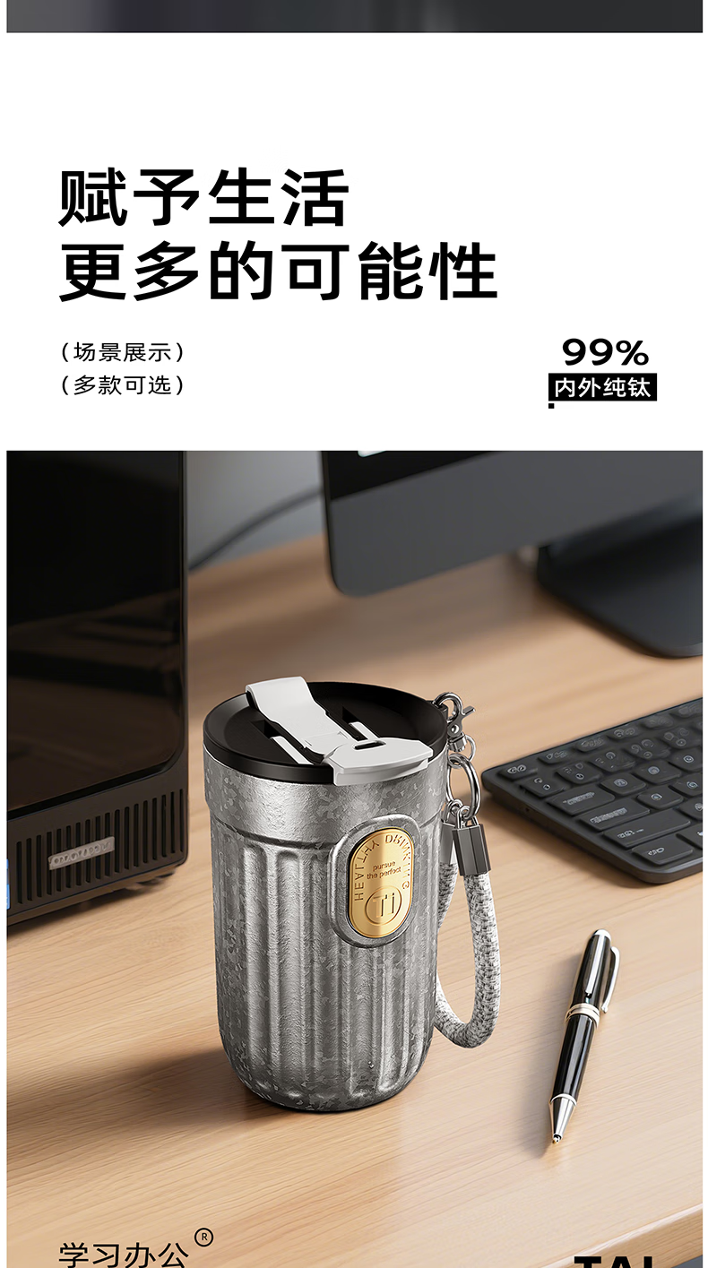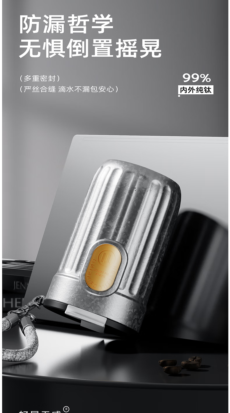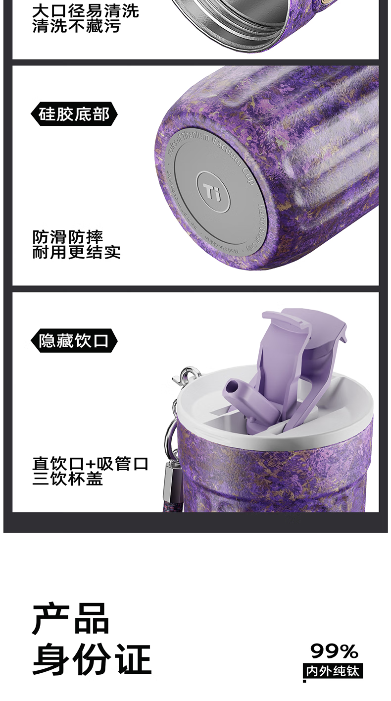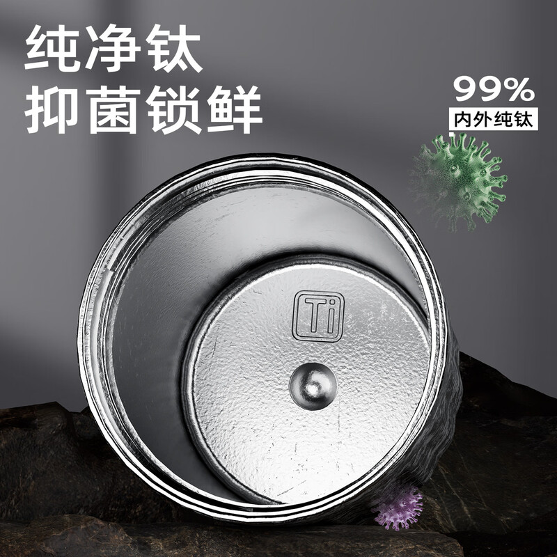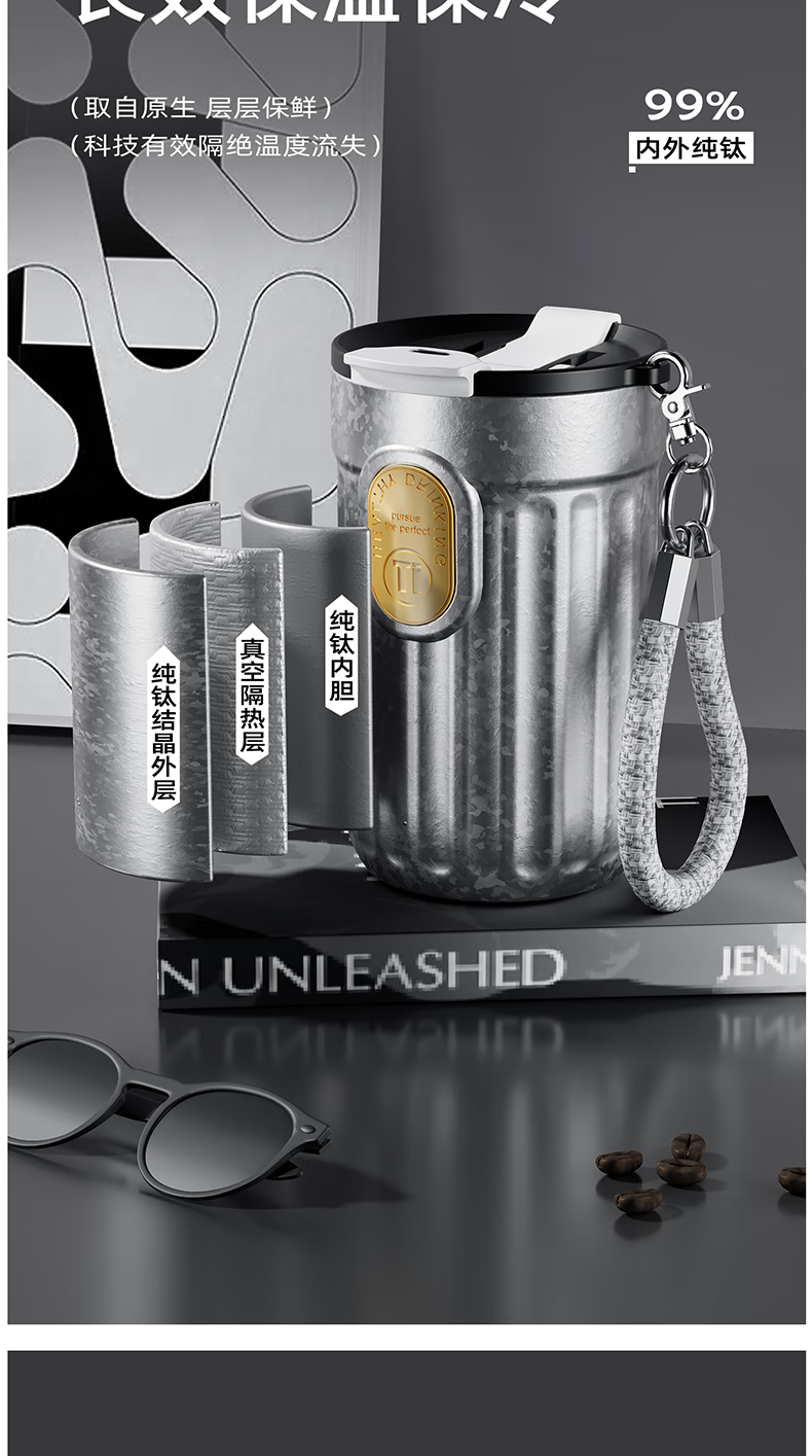 内外99.8%纯钛、健康有保障;保鲜饮品、抑制多种细菌滋生;双层真空、保温&保冷、坚韧轻盈;不含重金属、亲和人体、耐酸碱抗腐蚀;吸饮/直饮/敞口三种饮水模式