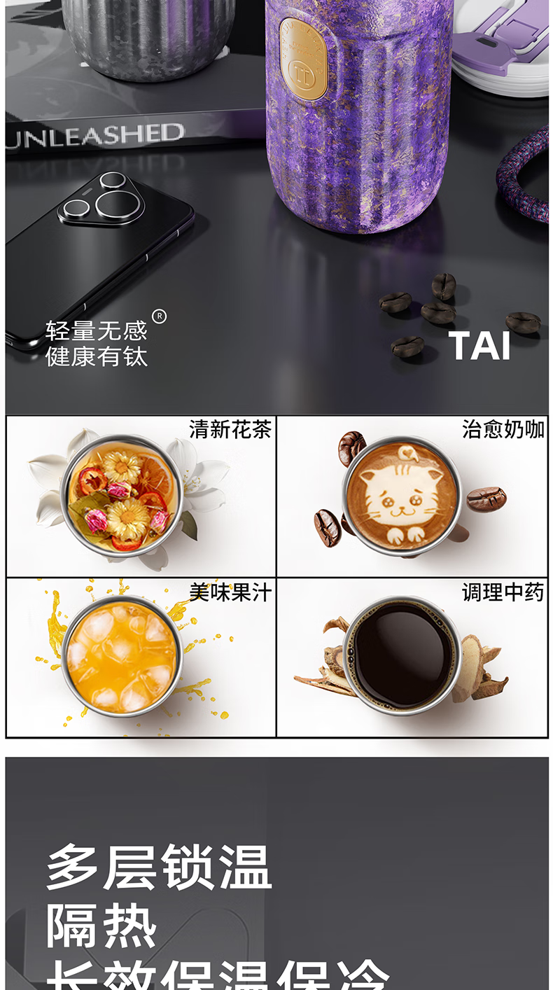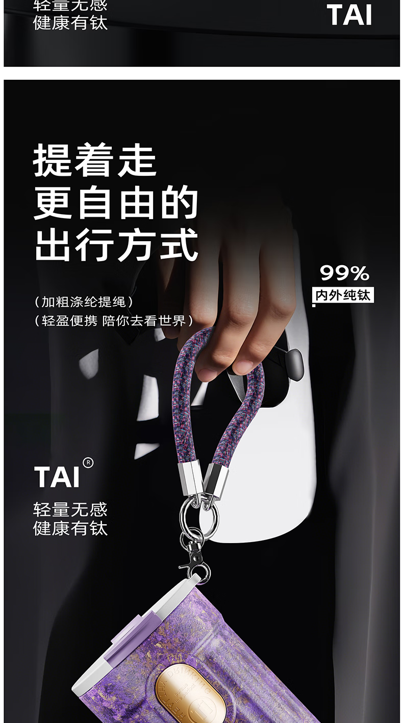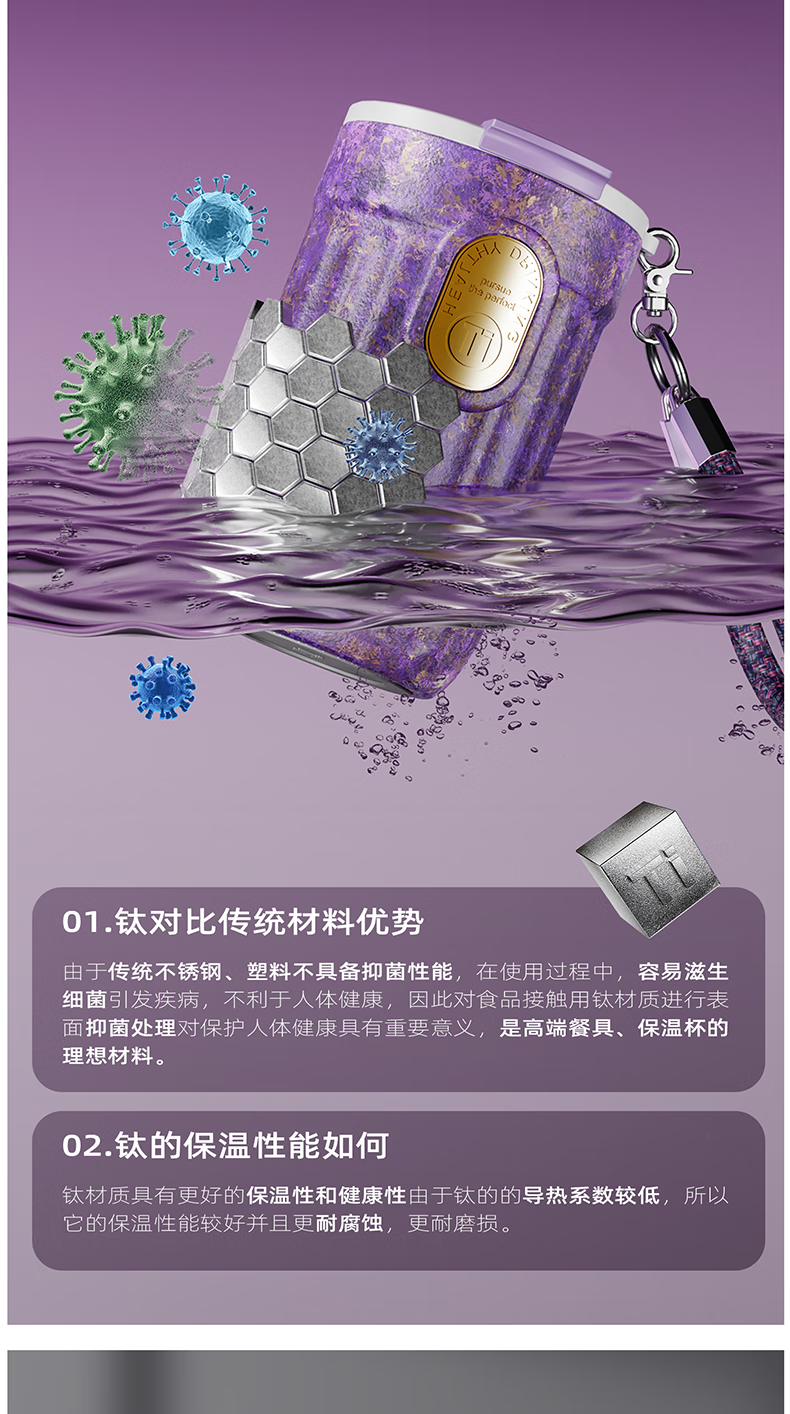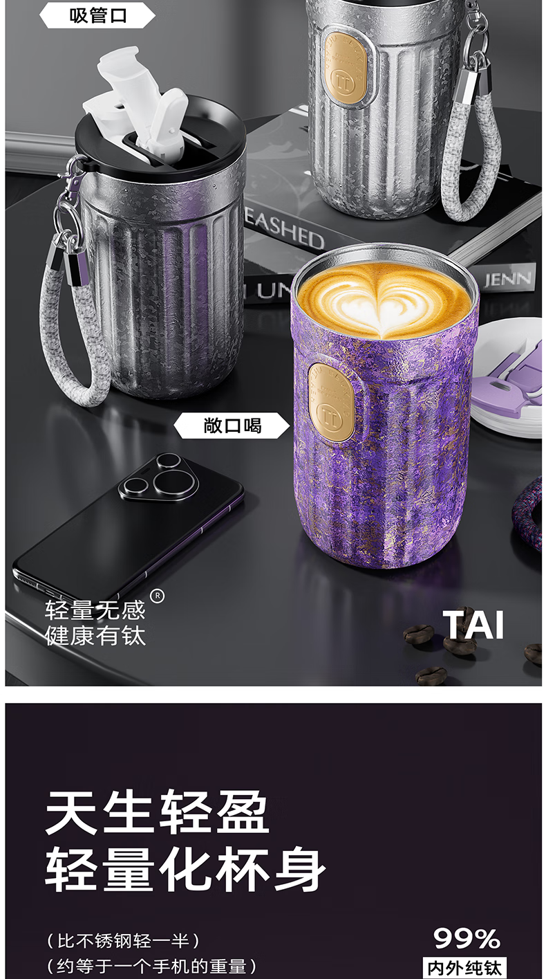 内外99.8%纯钛、健康有保障;保鲜饮品、抑制多种细菌滋生;双层真空、保温&保冷、坚韧轻盈;不含重金属、亲和人体、耐酸碱抗腐蚀;吸饮/直饮/敞口三种饮水模式