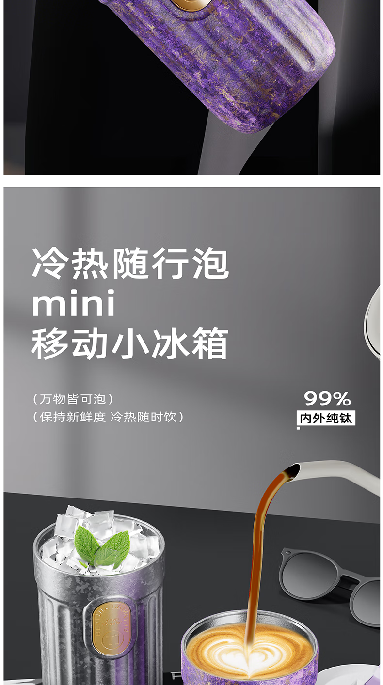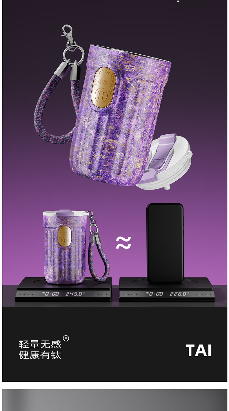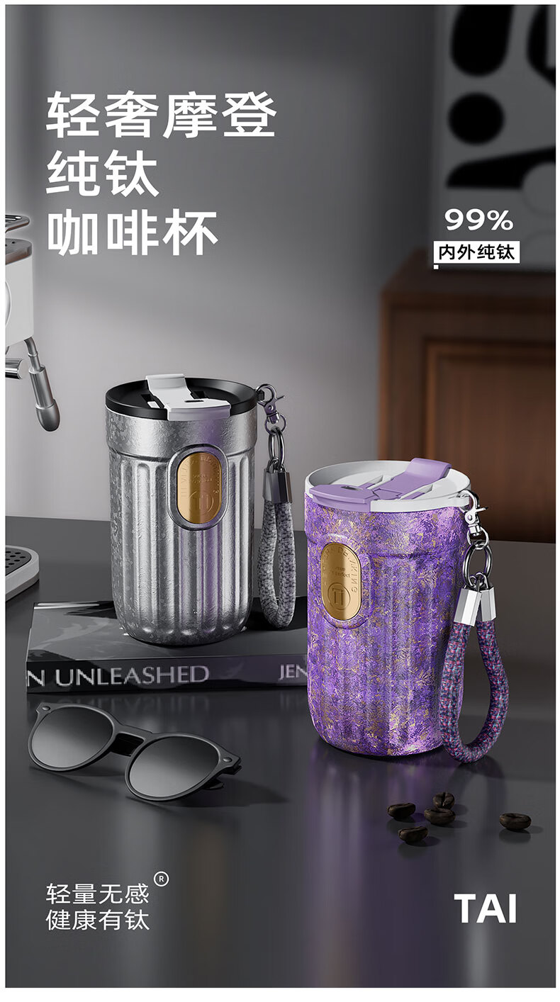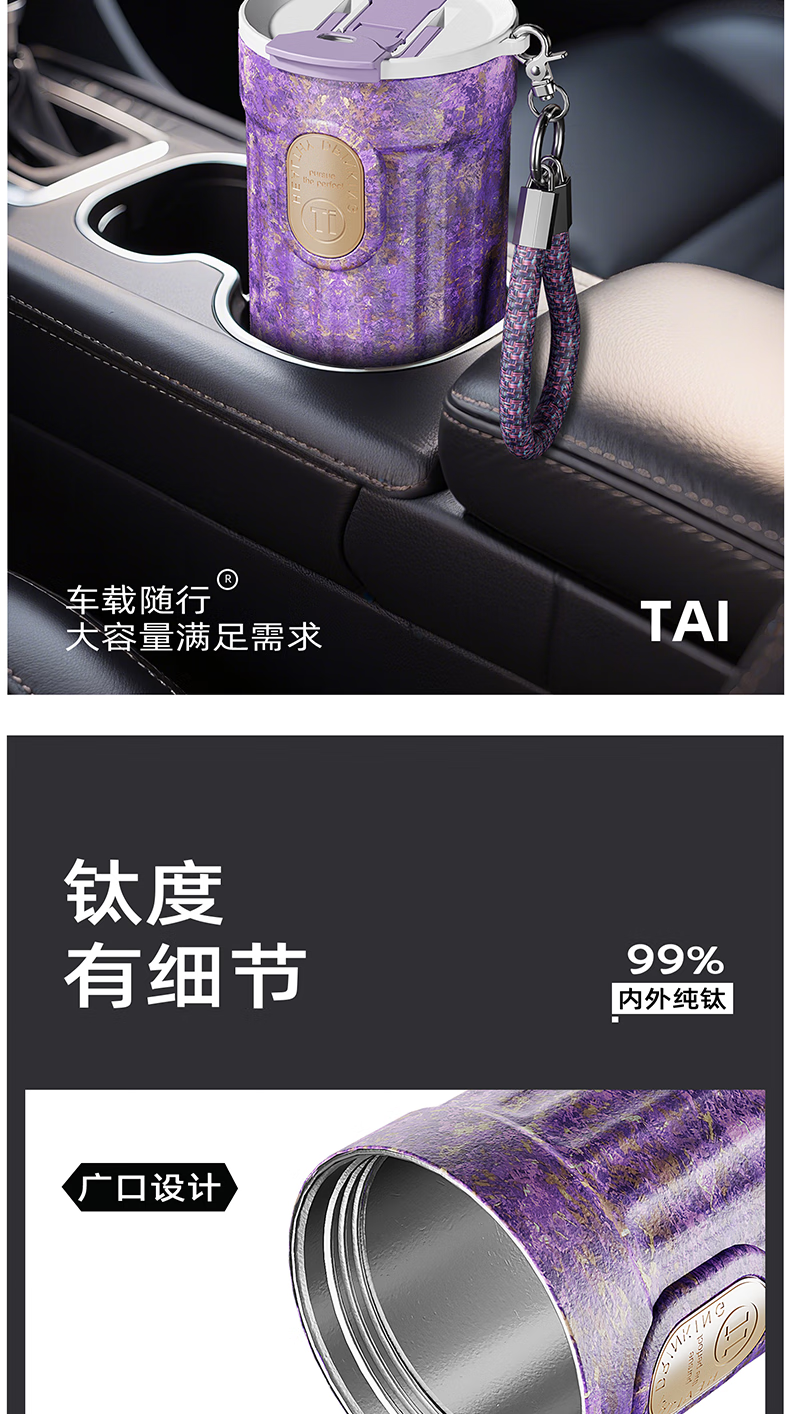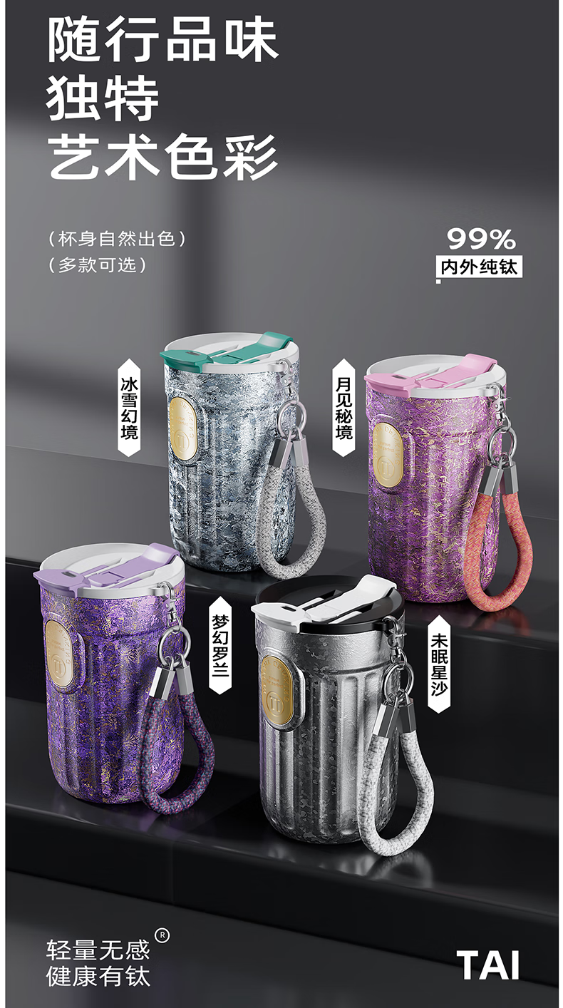 内外99.8%纯钛、健康有保障;保鲜饮品、抑制多种细菌滋生;双层真空、保温&保冷、坚韧轻盈;不含重金属、亲和人体、耐酸碱抗腐蚀;吸饮/直饮/敞口三种饮水模式