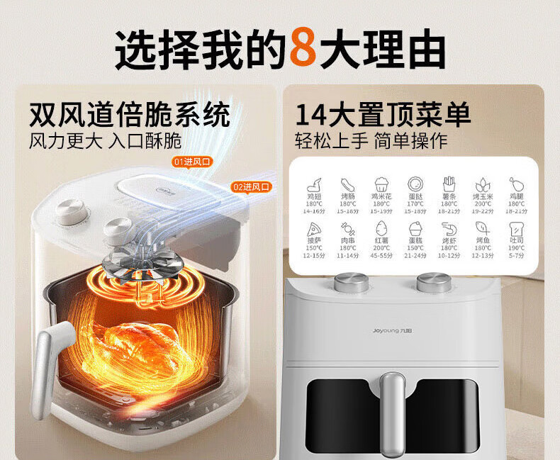 双风道脆烤,6L大容量;14大丝印机械双旋钮;11叶风叶强风均匀覆盖