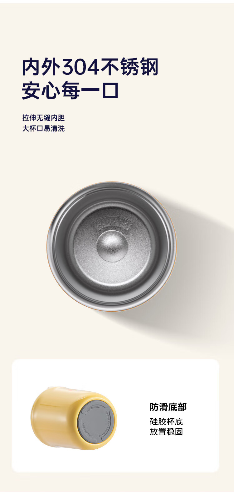 杯身内外壁采用304不锈钢,健康环保;杯底硅胶防滑设计;采用拉伸无缝内胆设计,美观大方,保温时效长