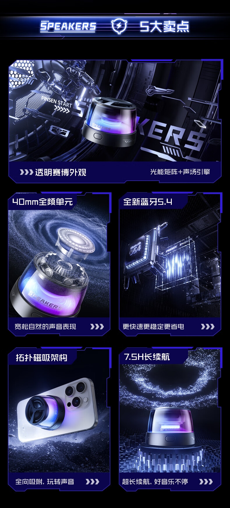 小巧圆润,轻量便携,净重68g,一手可握;最新蓝牙5.4芯片,稳定不断,7.5H超长续航;高能磁吸模块,全向拓扑磁吸,可充当手机支架