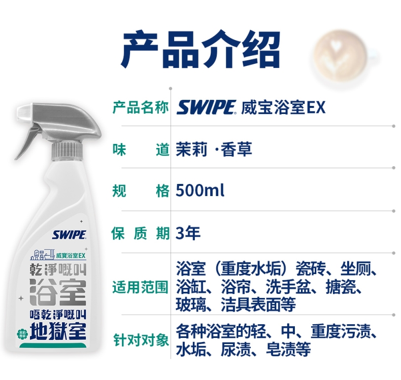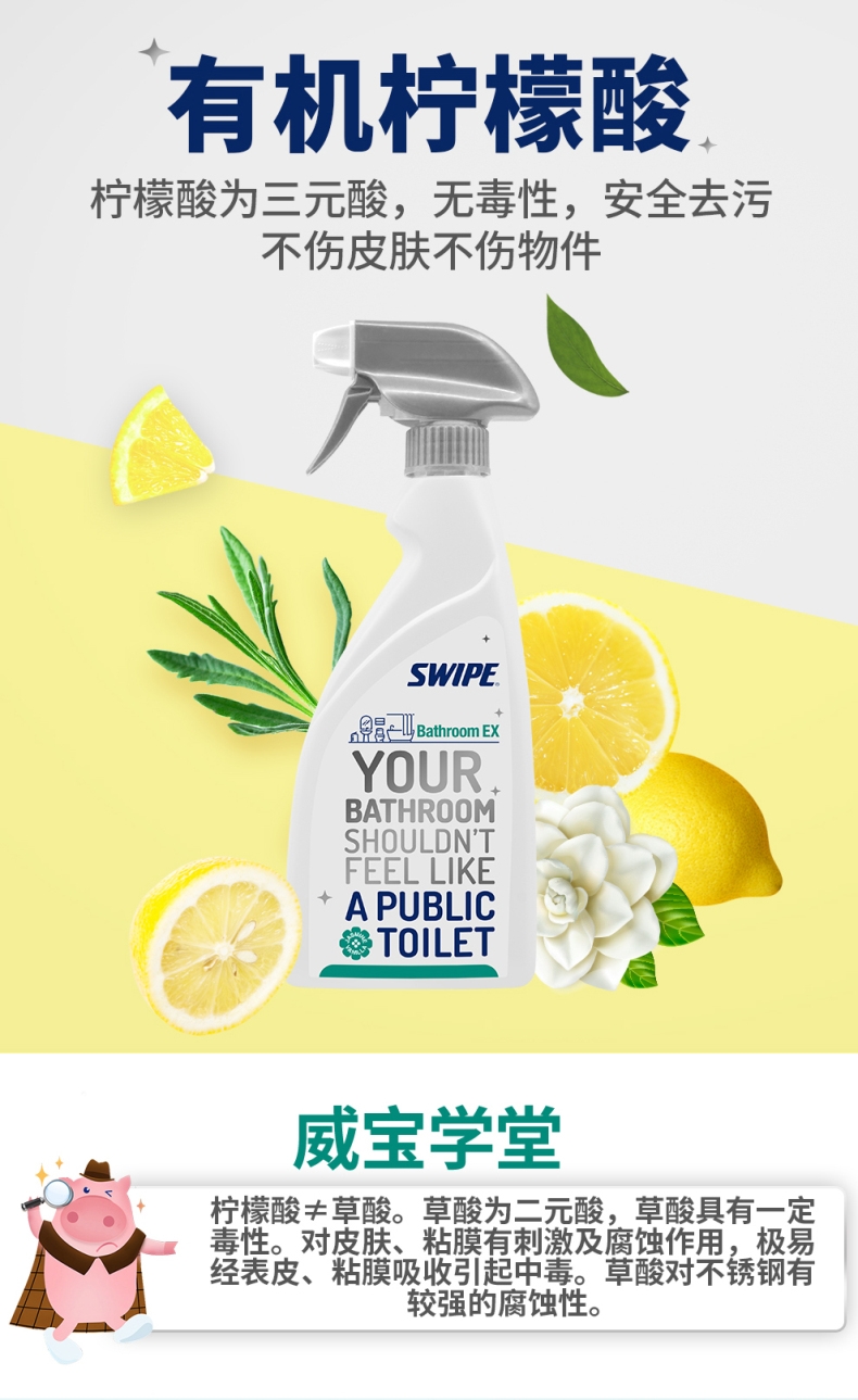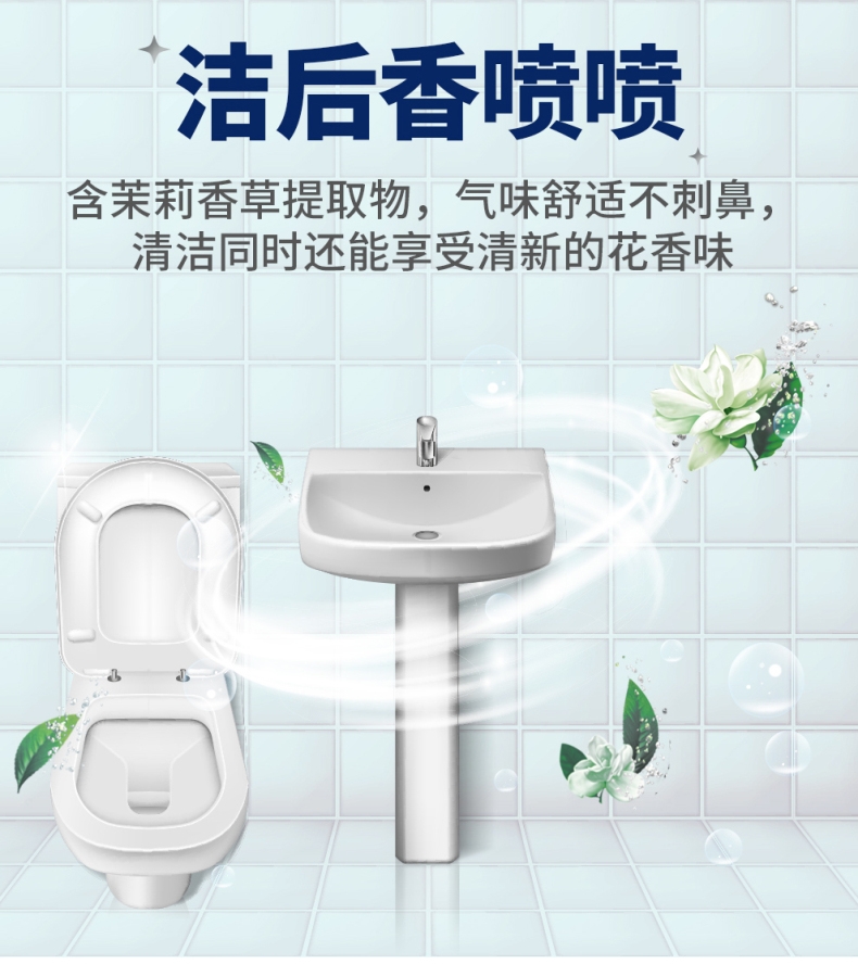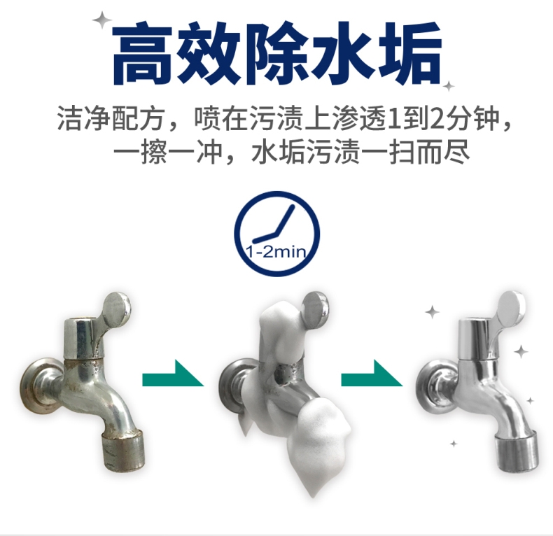 清除各种浴室污渍、水垢、尿渍、皂渍等;杀菌达99.99%确保浴室清洁卫生;无磷植物性配方不损害浴室物件表面