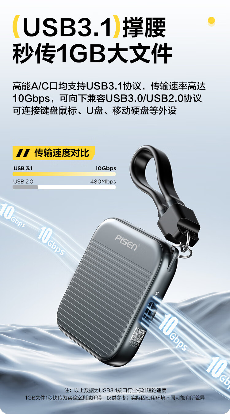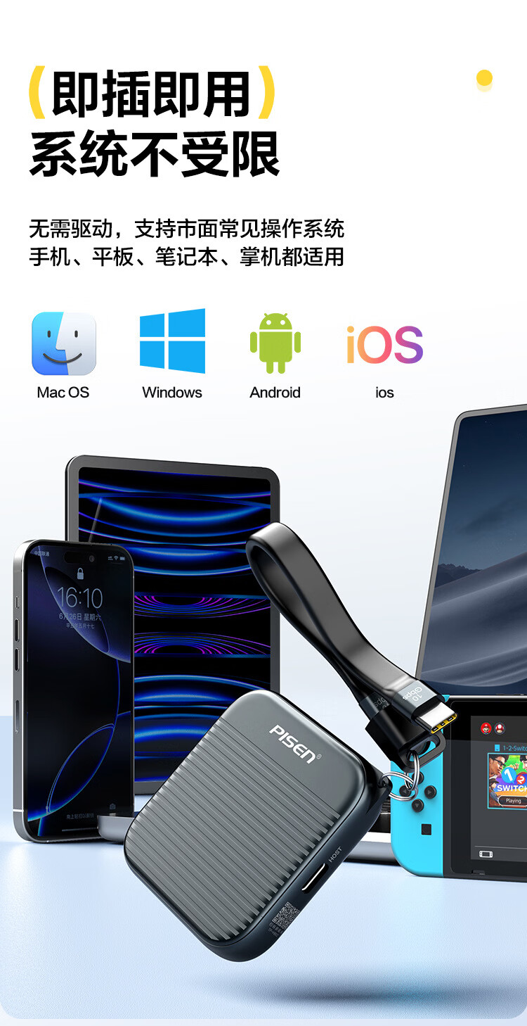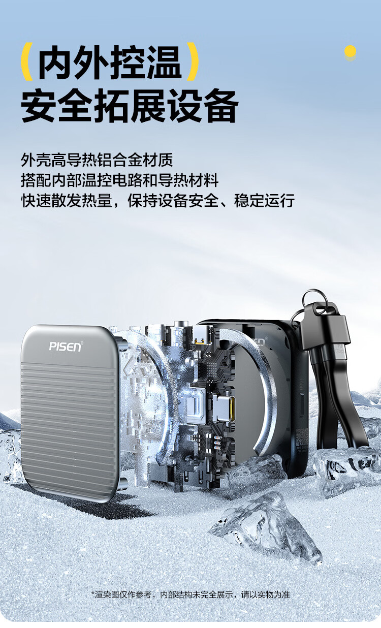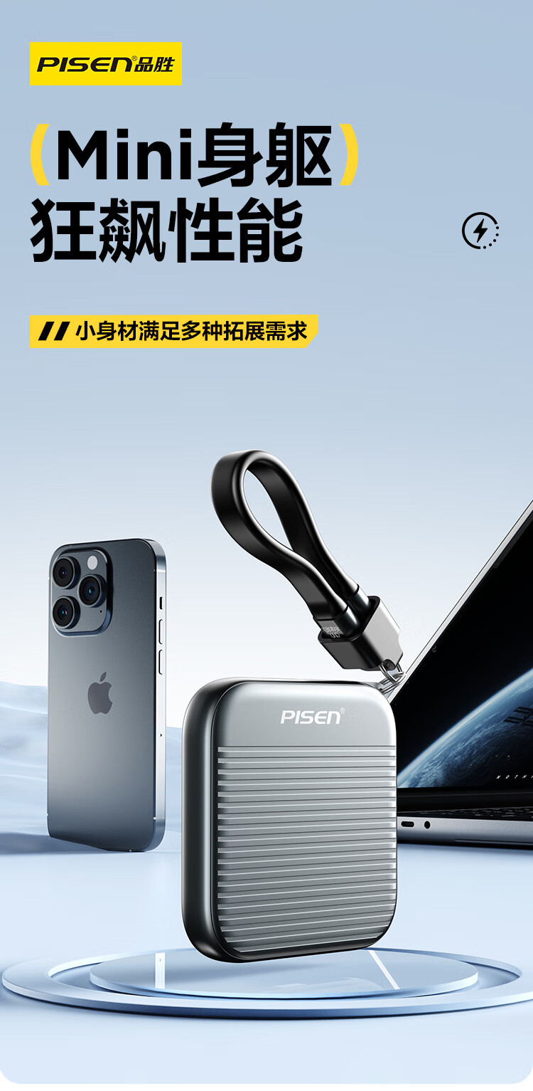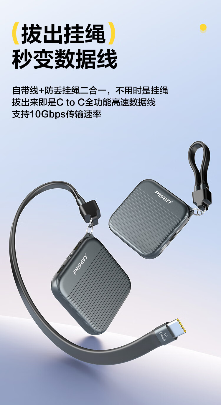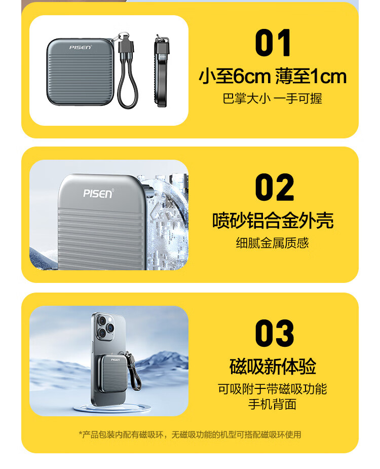 自带线+防丢挂绳二合一;喷砂铝合金外壳,细腻金属质感,高颜值兼顾散热;强力磁吸,吸附于带磁吸功能手机背面