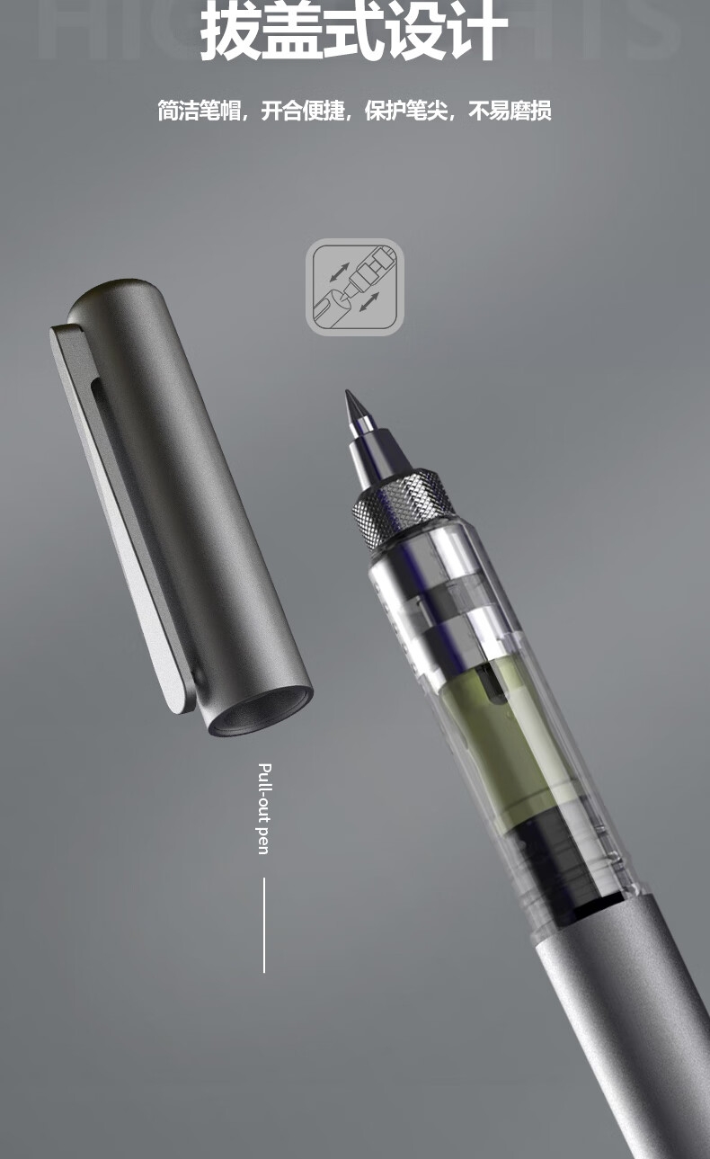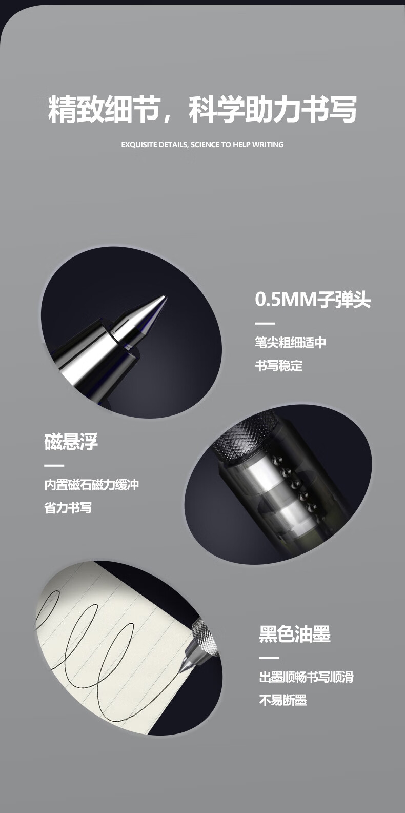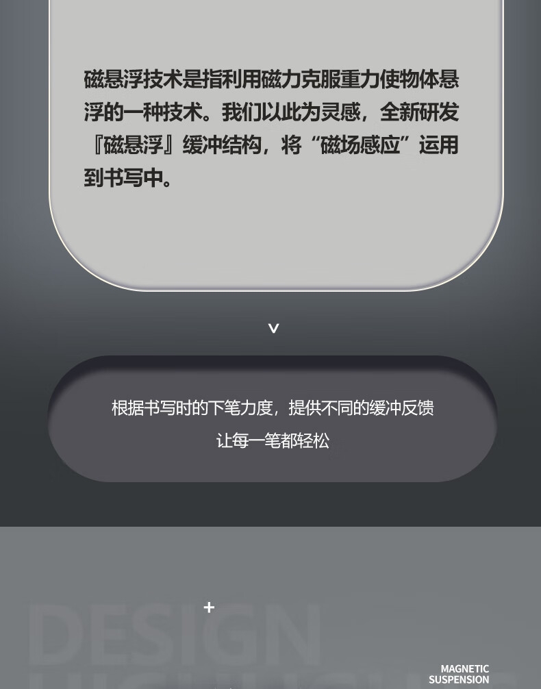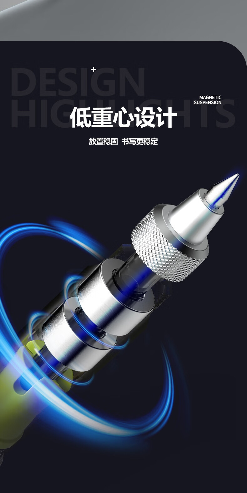 高颜值,精工艺,低调不失品质;低重心设计,放置稳固,书写更稳定;内置磁石磁力书写省力