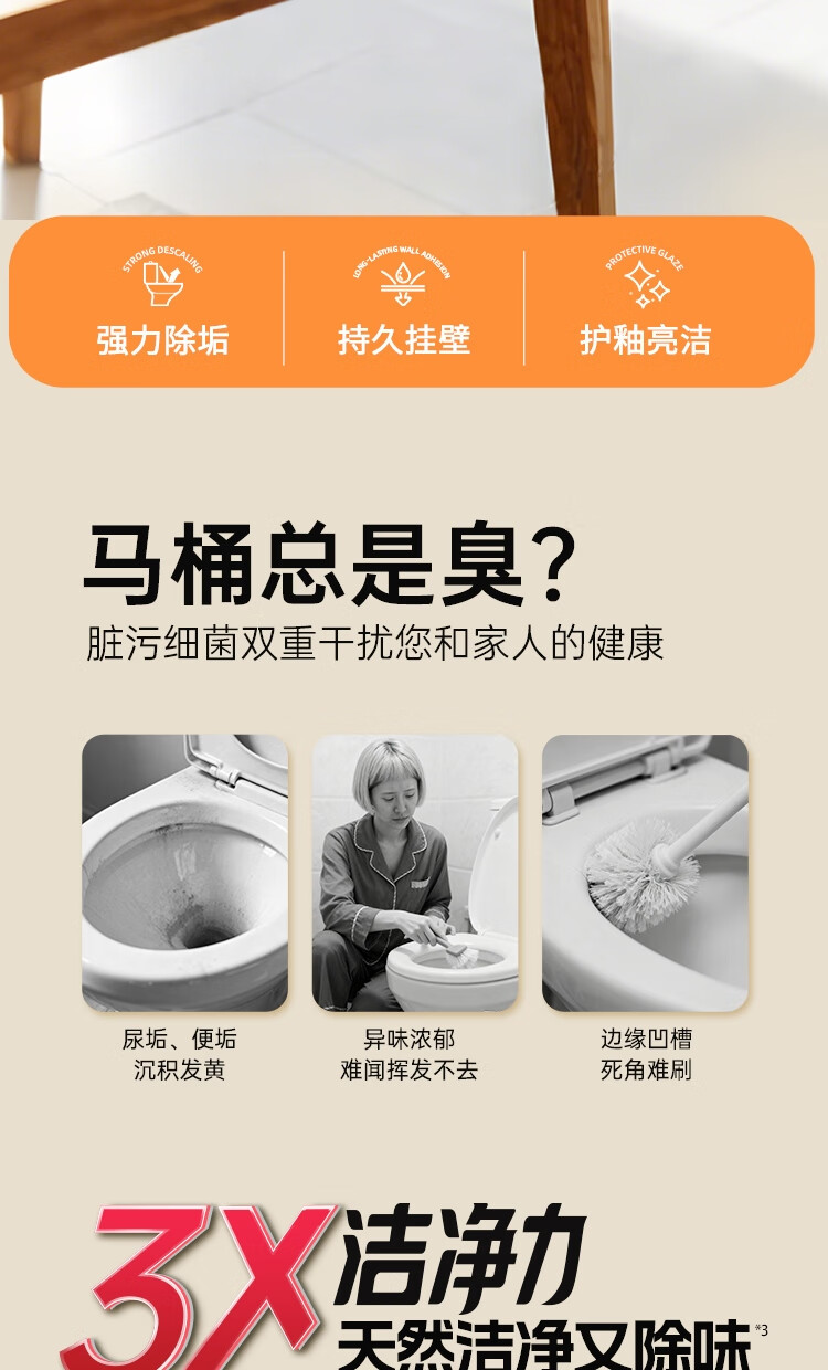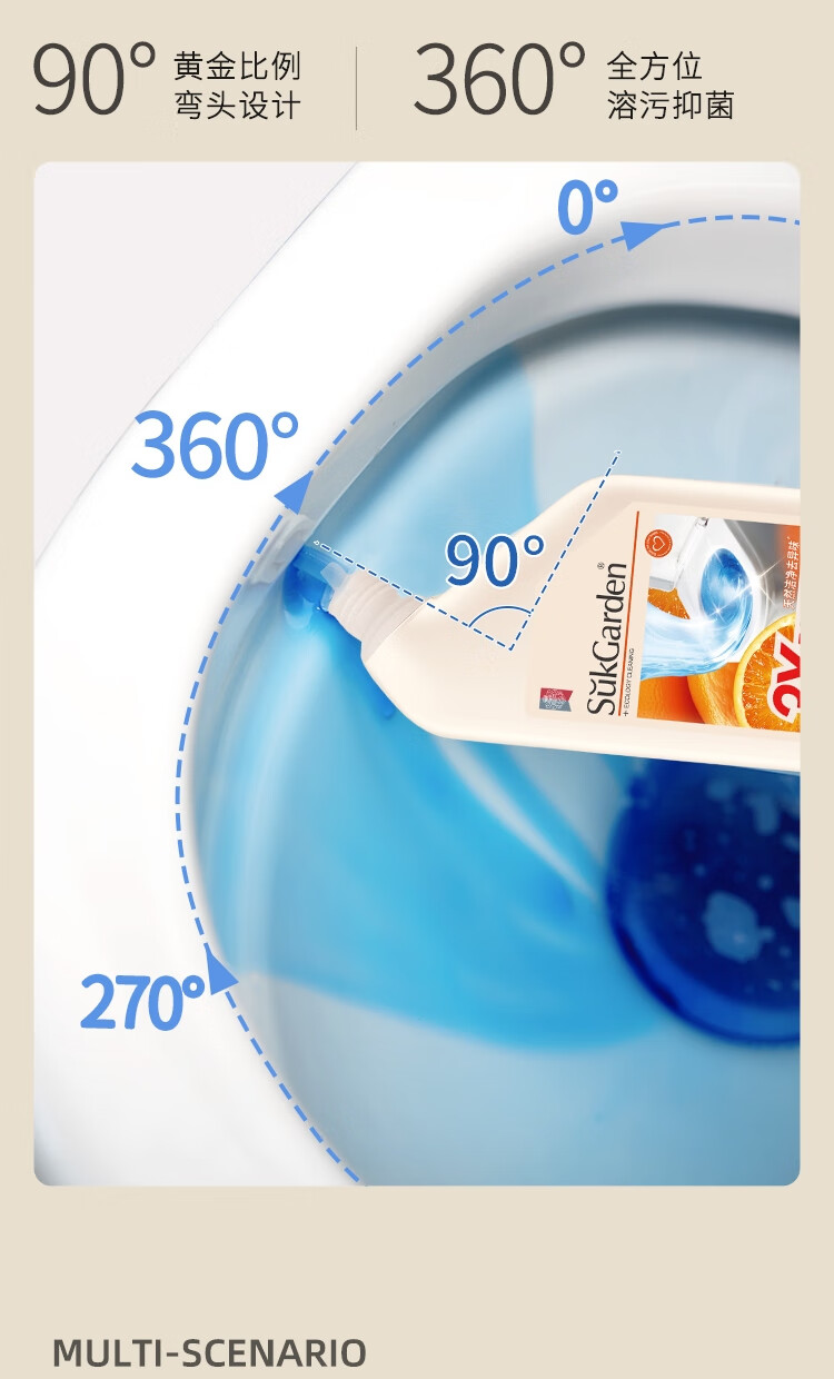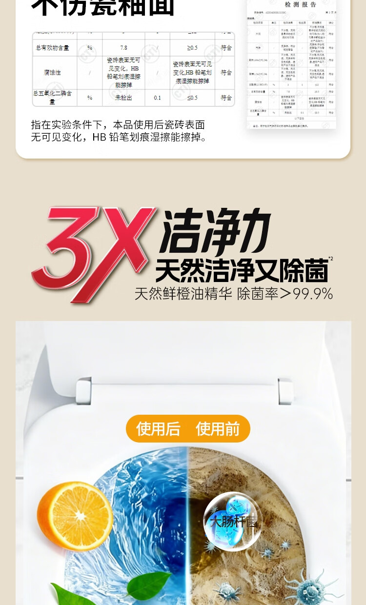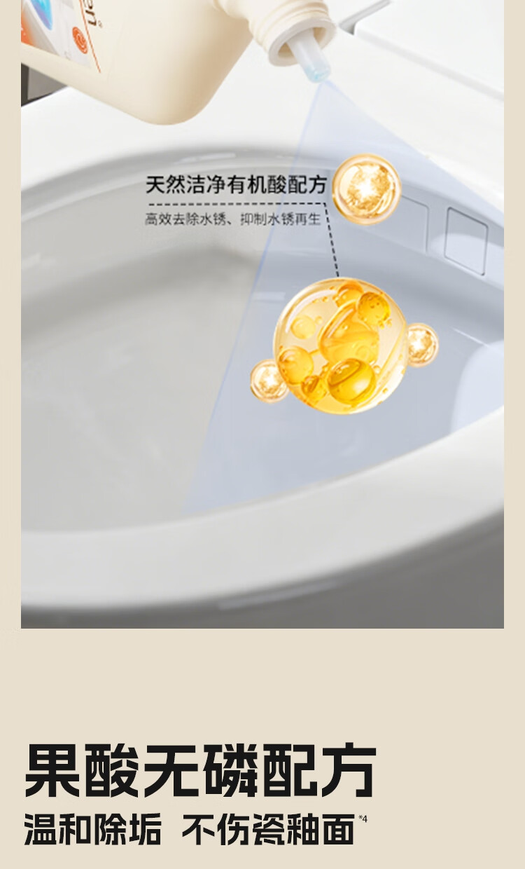 果酸无磷配方,温和除重垢,不伤瓷釉面;天然鲜橙油精华;弯嘴设计,凹槽死角全覆盖