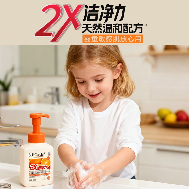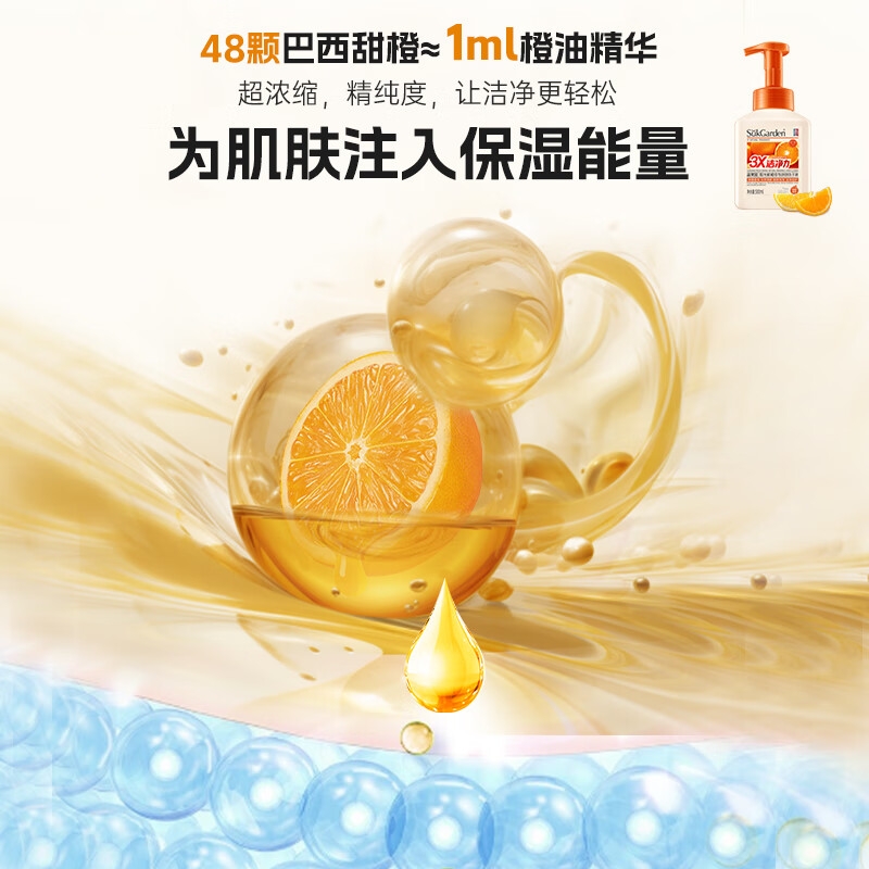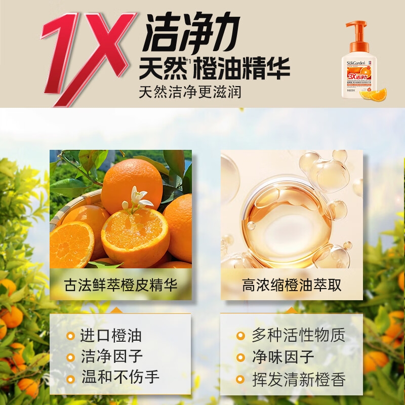 天然橙油精华和保湿因子;椰油复配,弱酸配方,洗手更护手;洁净更滋润