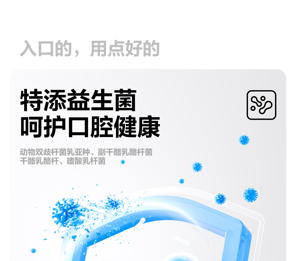呵护口腔健康;绵密泡沫深入洁净齿缝;成人清新口气