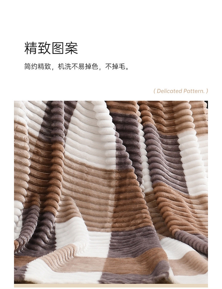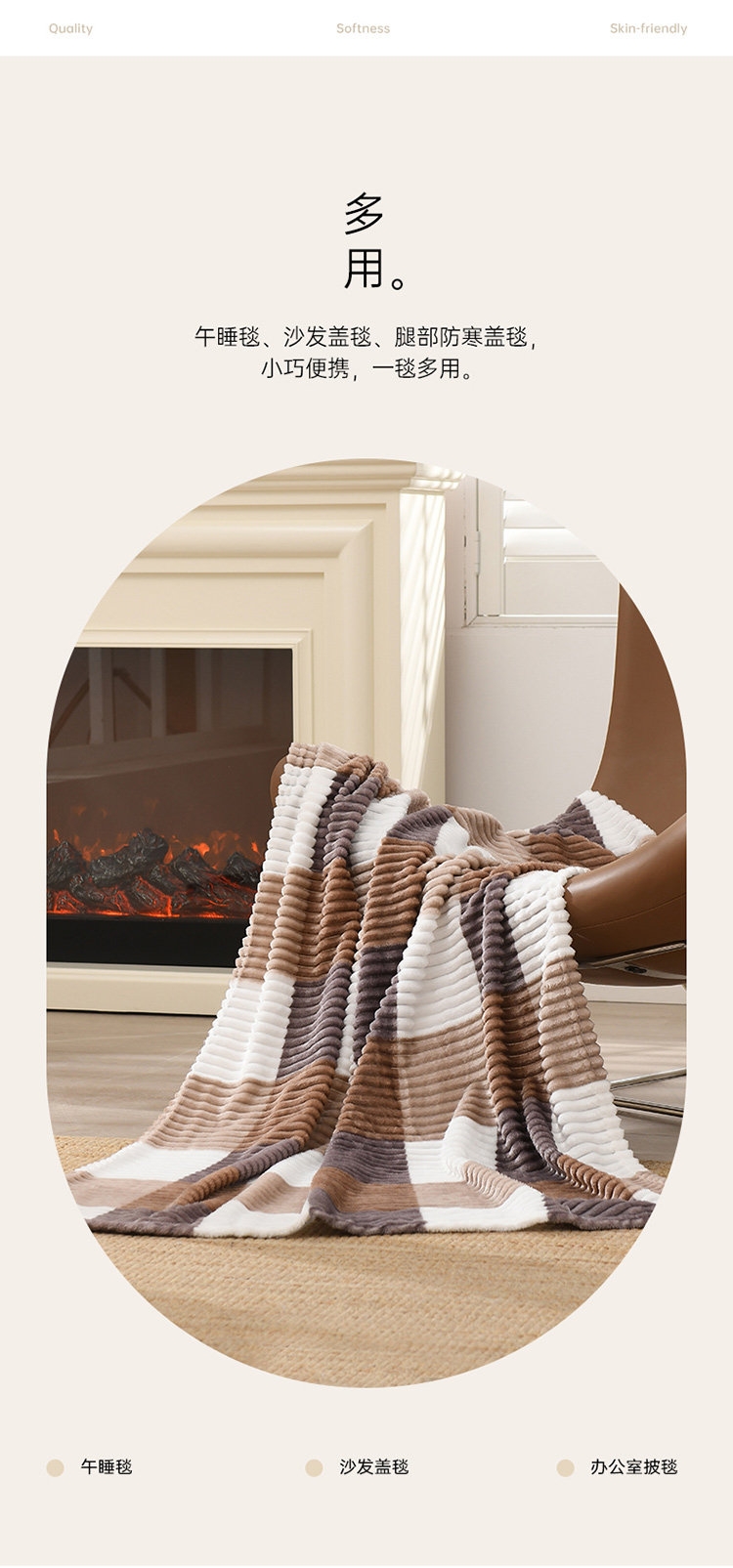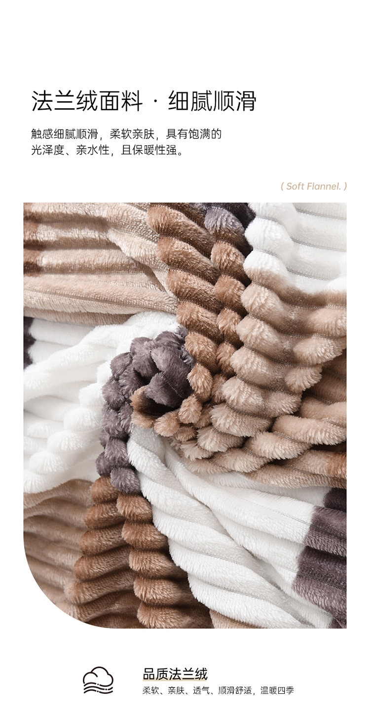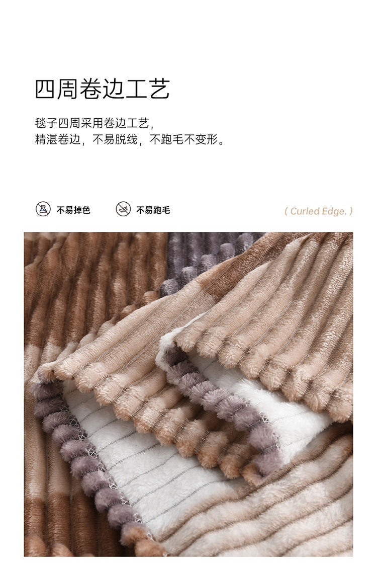 工艺精湛,卷边工艺,针距适中,美观耐看;;实用性强。可做披肩,可做午休毯,可做膝盖毯;采用法兰绒面料,触感细腻顺滑,柔软亲肤