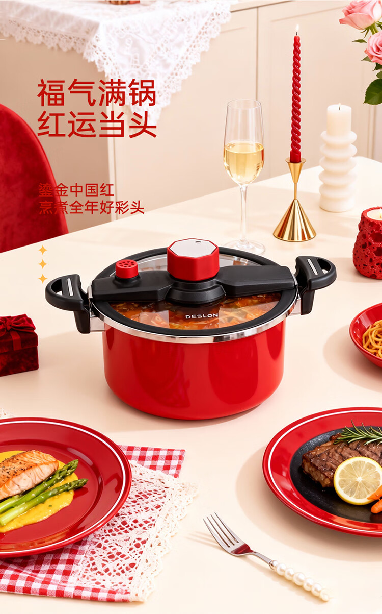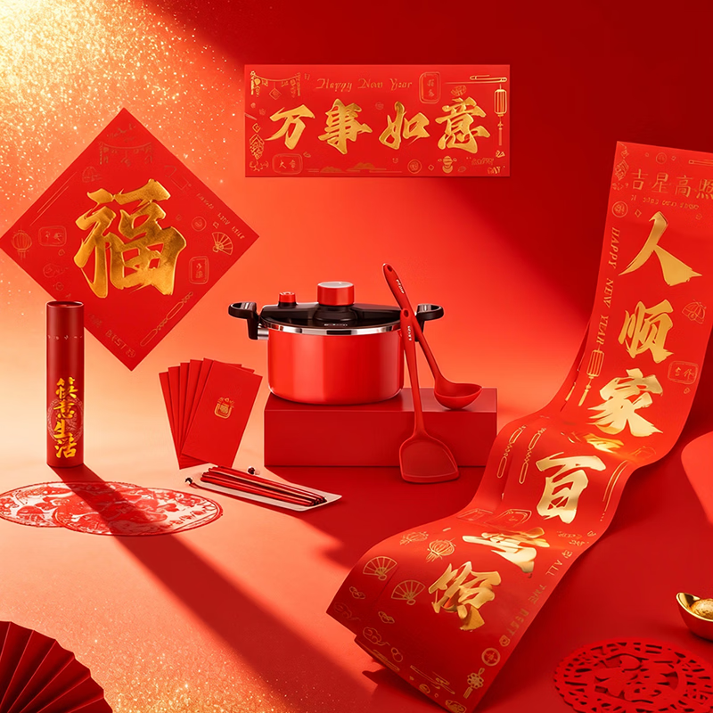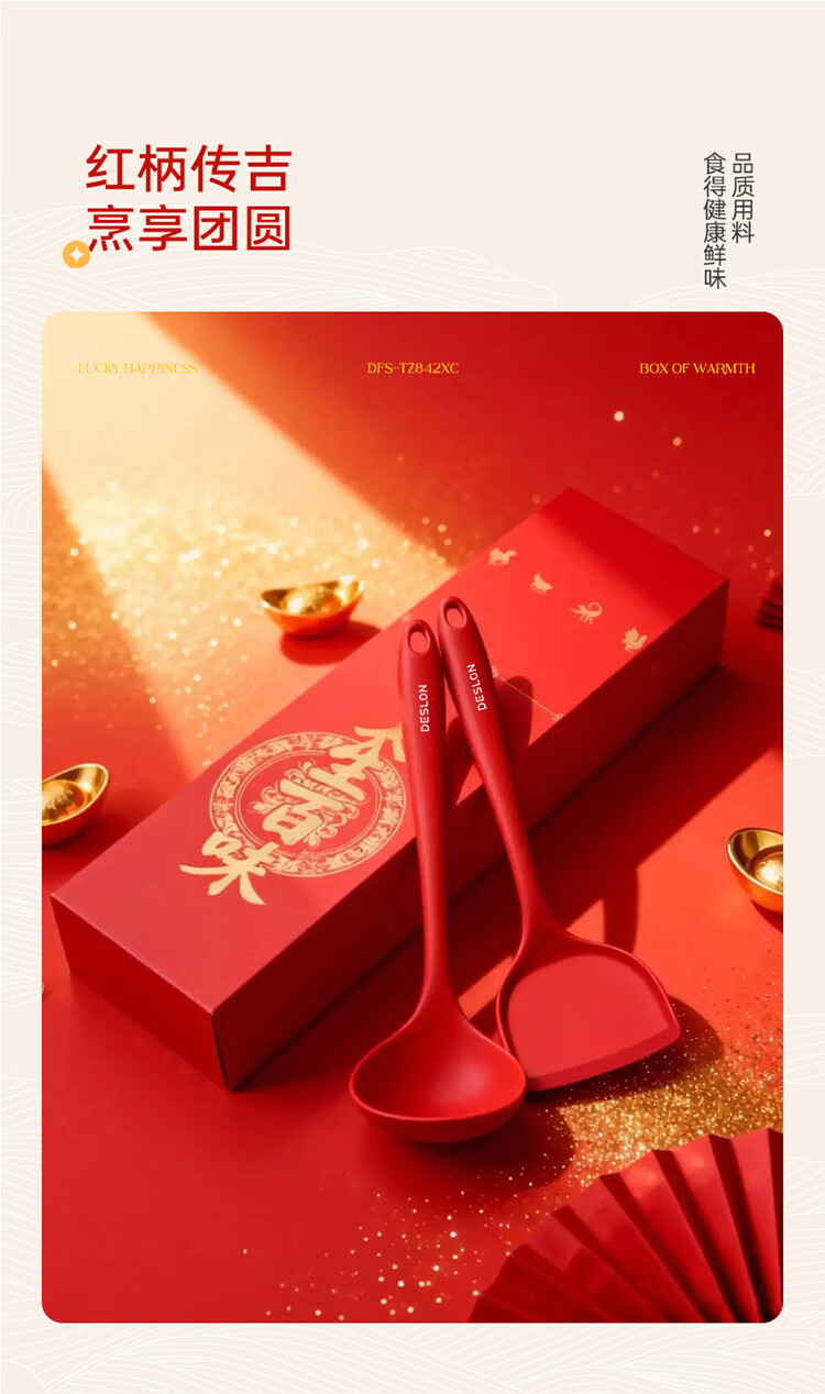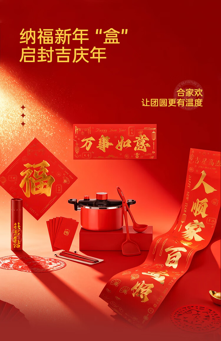 红包装福,福纳吉祥;一旋就开,单手自由操作;红柄传吉,烹享团圆