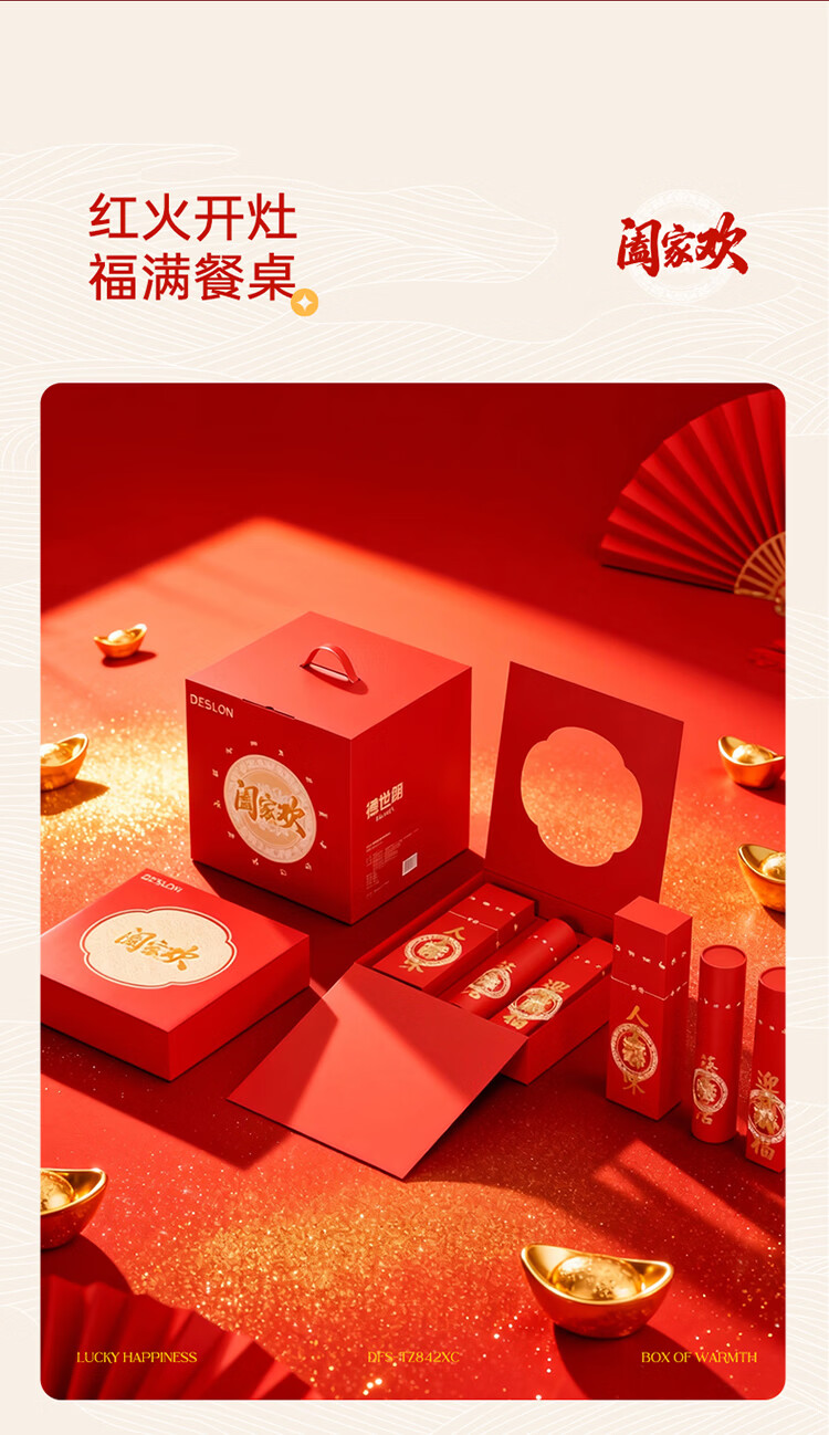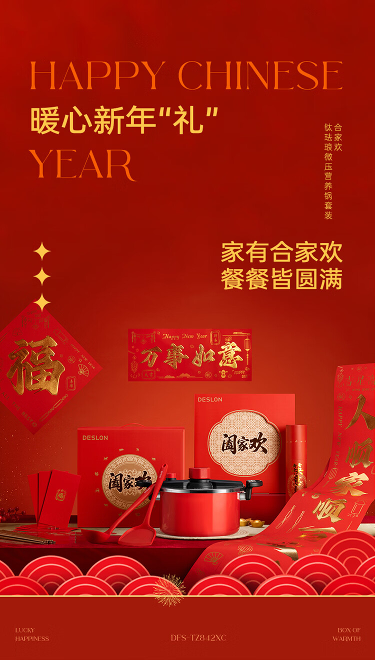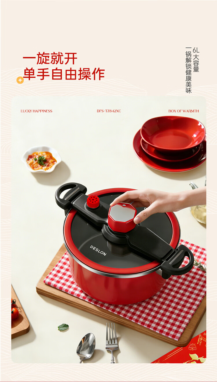 红包装福,福纳吉祥;一旋就开,单手自由操作;红柄传吉,烹享团圆
