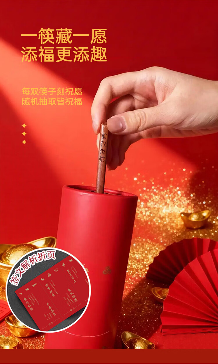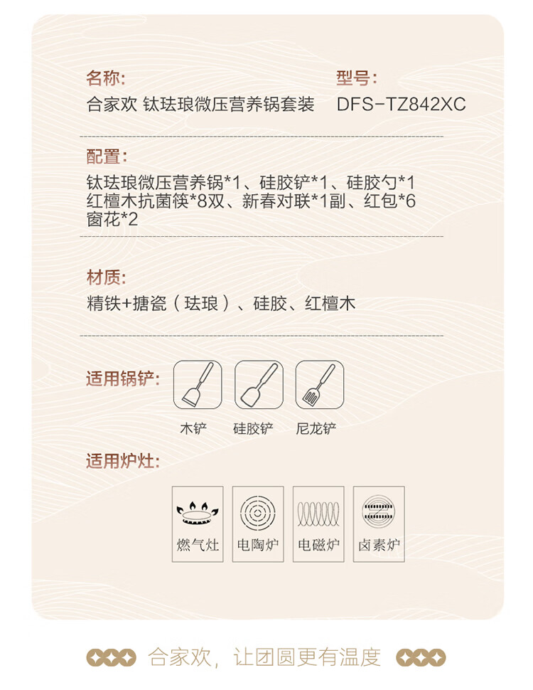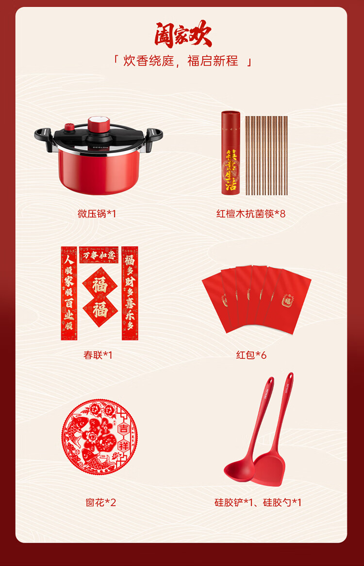配置清单:钛珐琅微压营养锅*1、硅胶铲*1、硅胶勺*1、红檀木抗菌筷*8双、新春对联*1副、红包*6、窗花*2