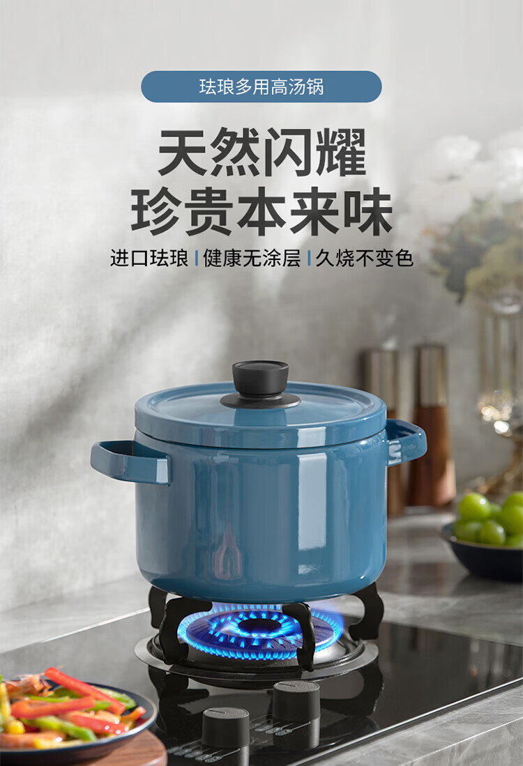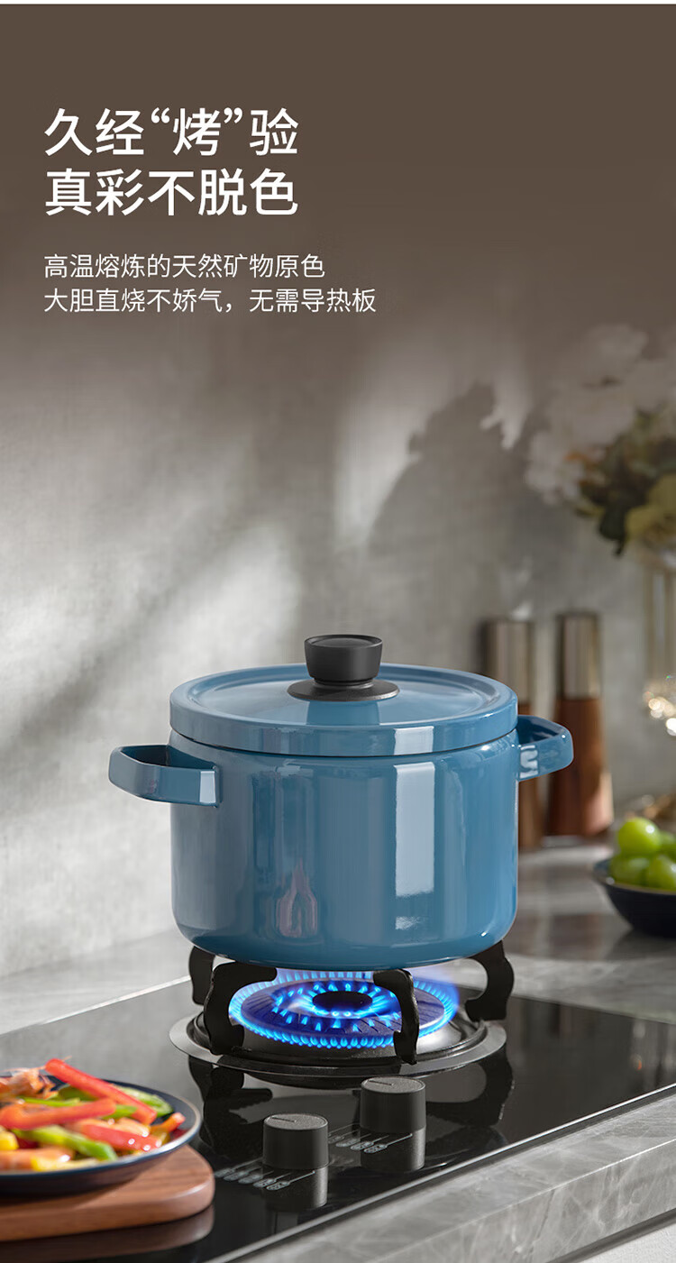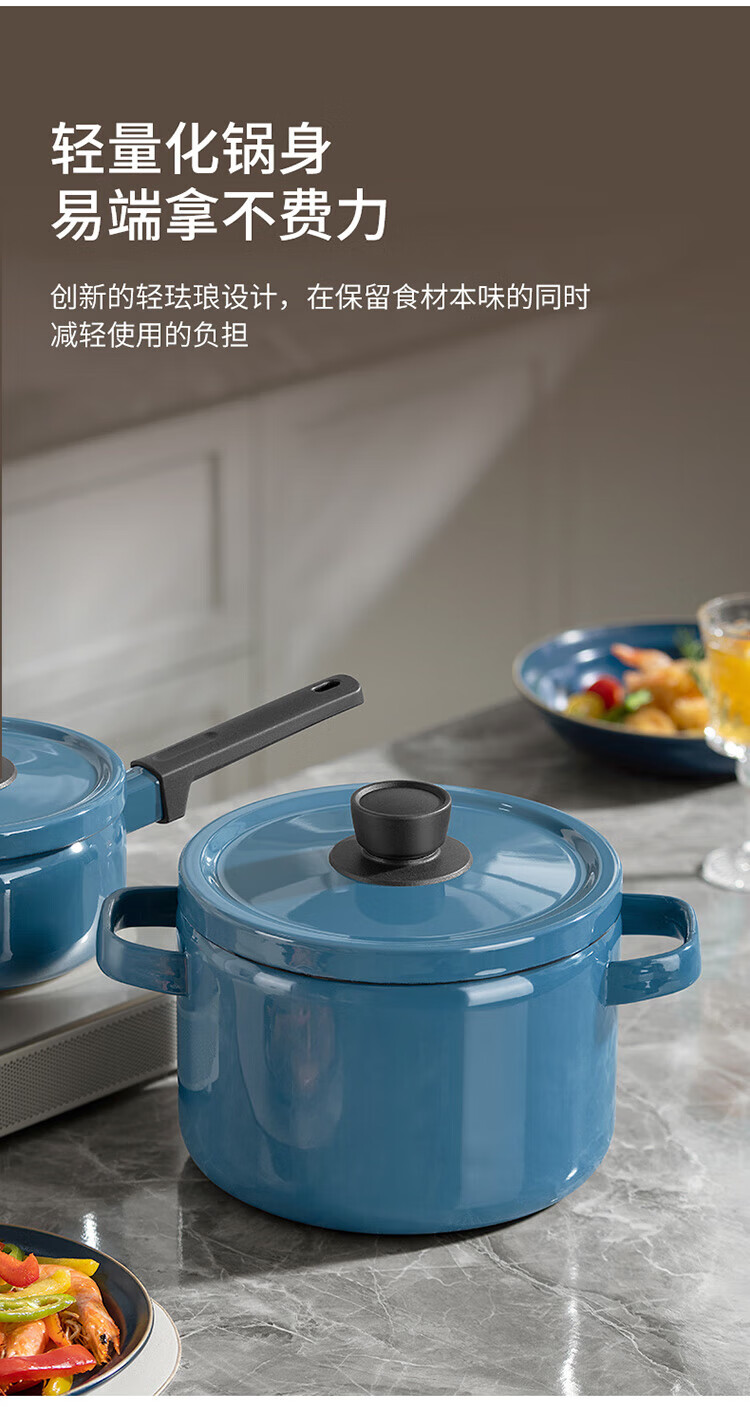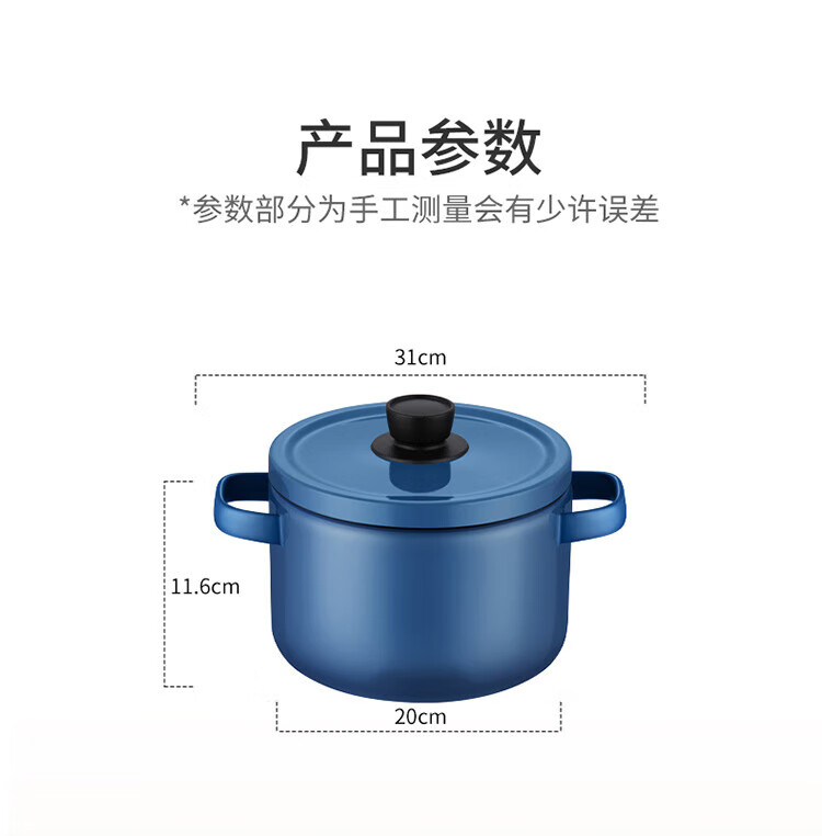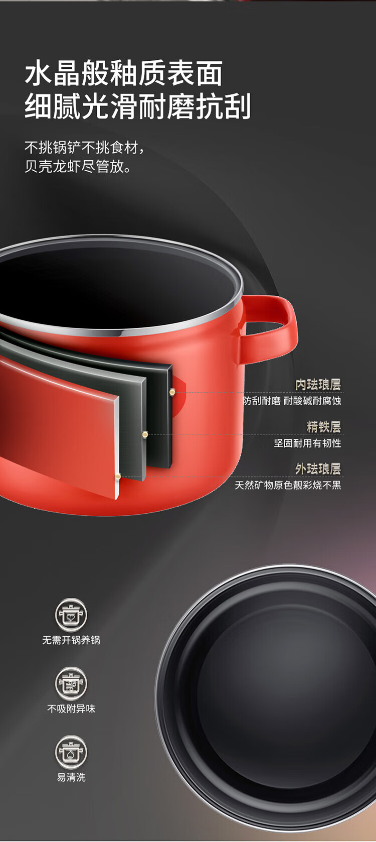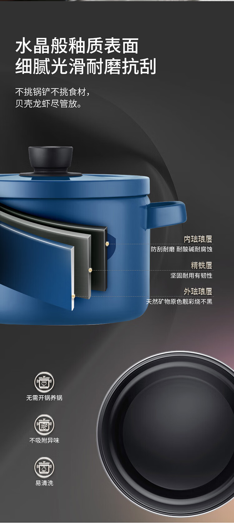 金属珐琅锅盖设计,密封性能好,持久耐用;;精铁材质制造,传热更快,受热均匀;;隔热防烫手柄,符合人体工程学,使用手适自然