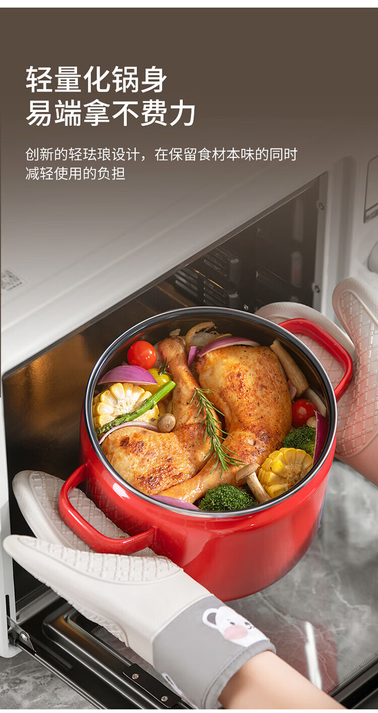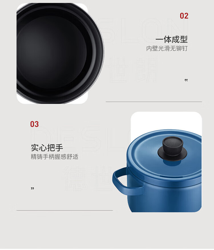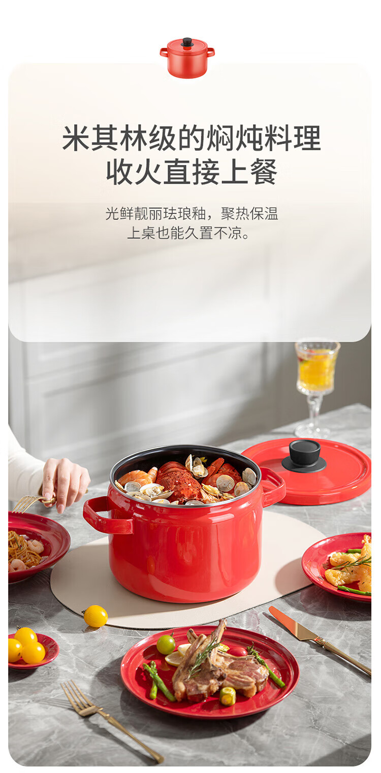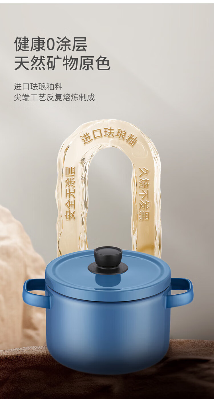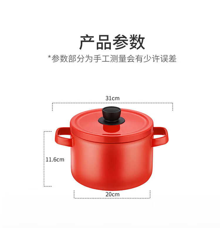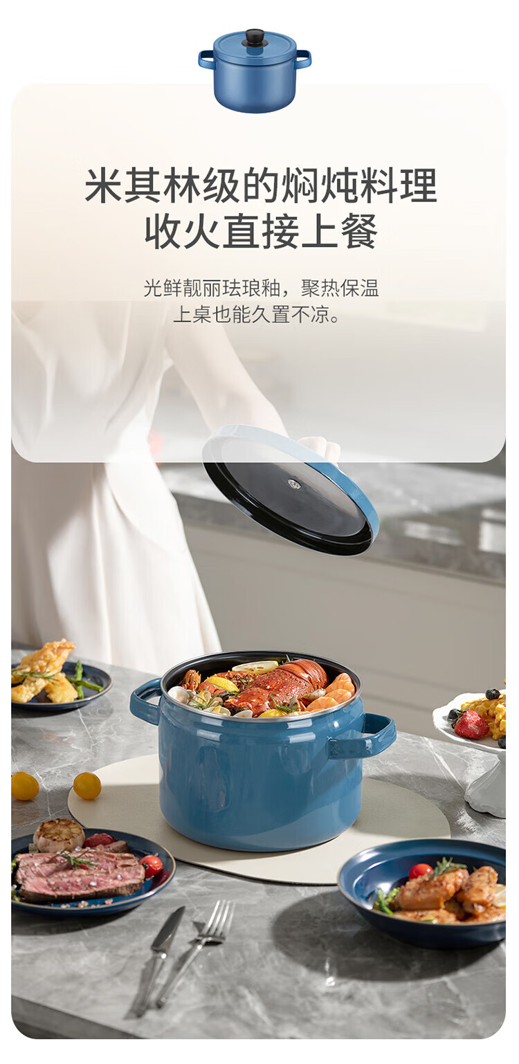 金属珐琅锅盖设计,密封性能好,持久耐用;;精铁材质制造,传热更快,受热均匀;;隔热防烫手柄,符合人体工程学,使用手适自然