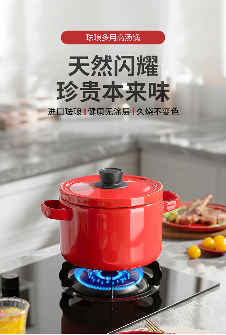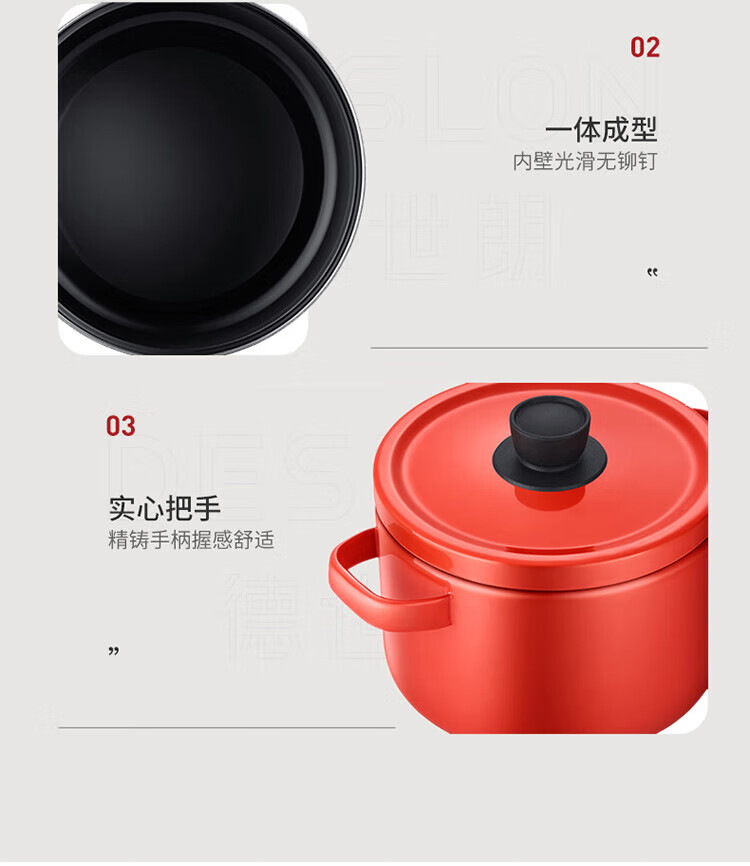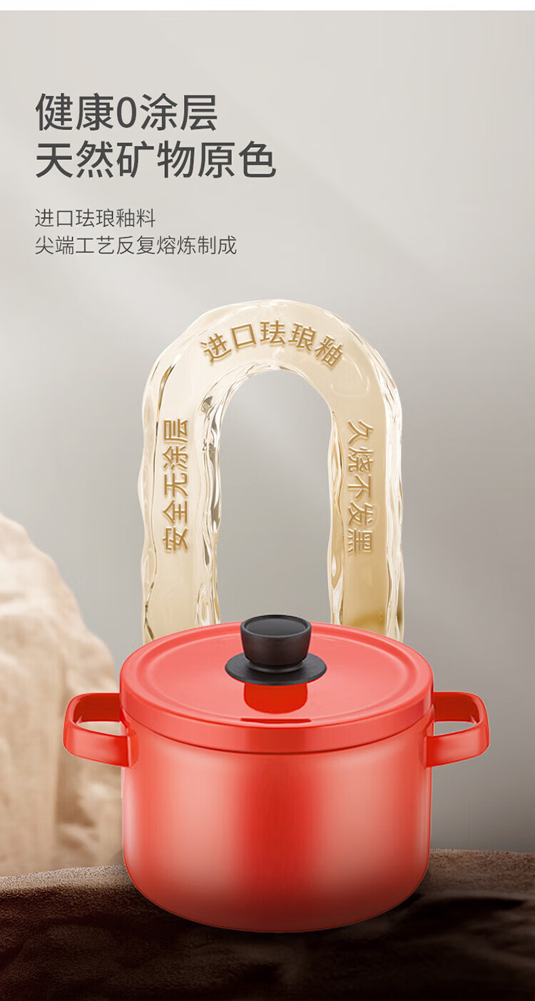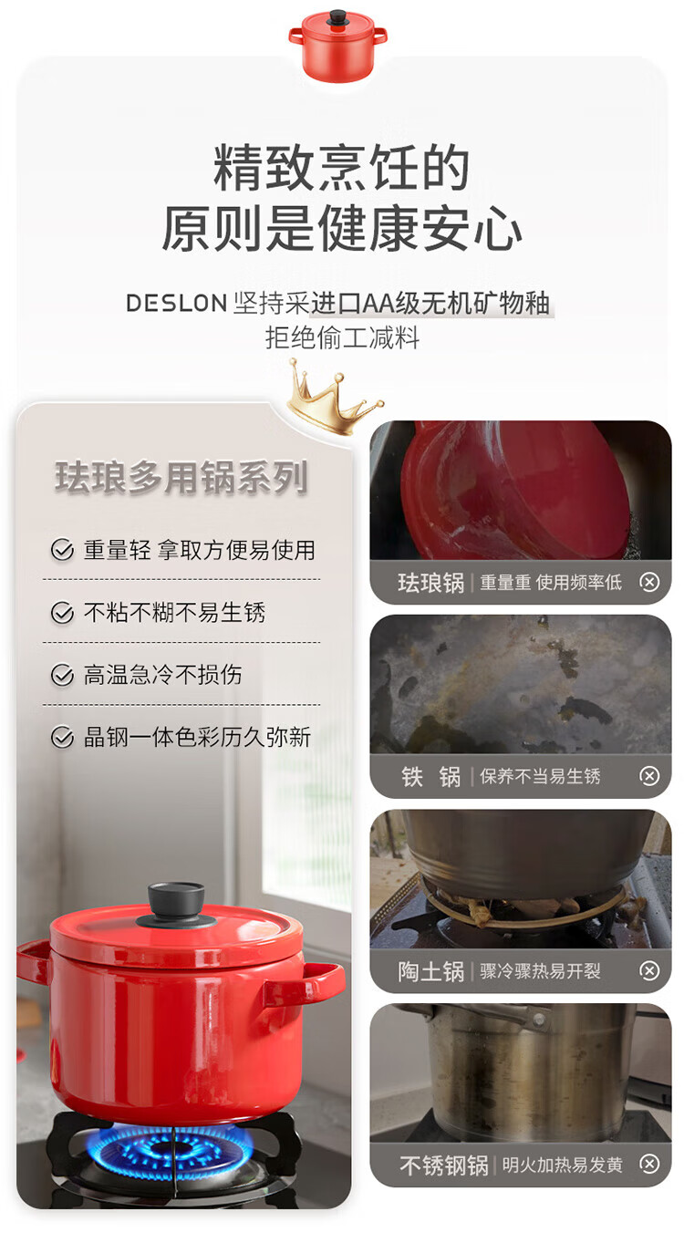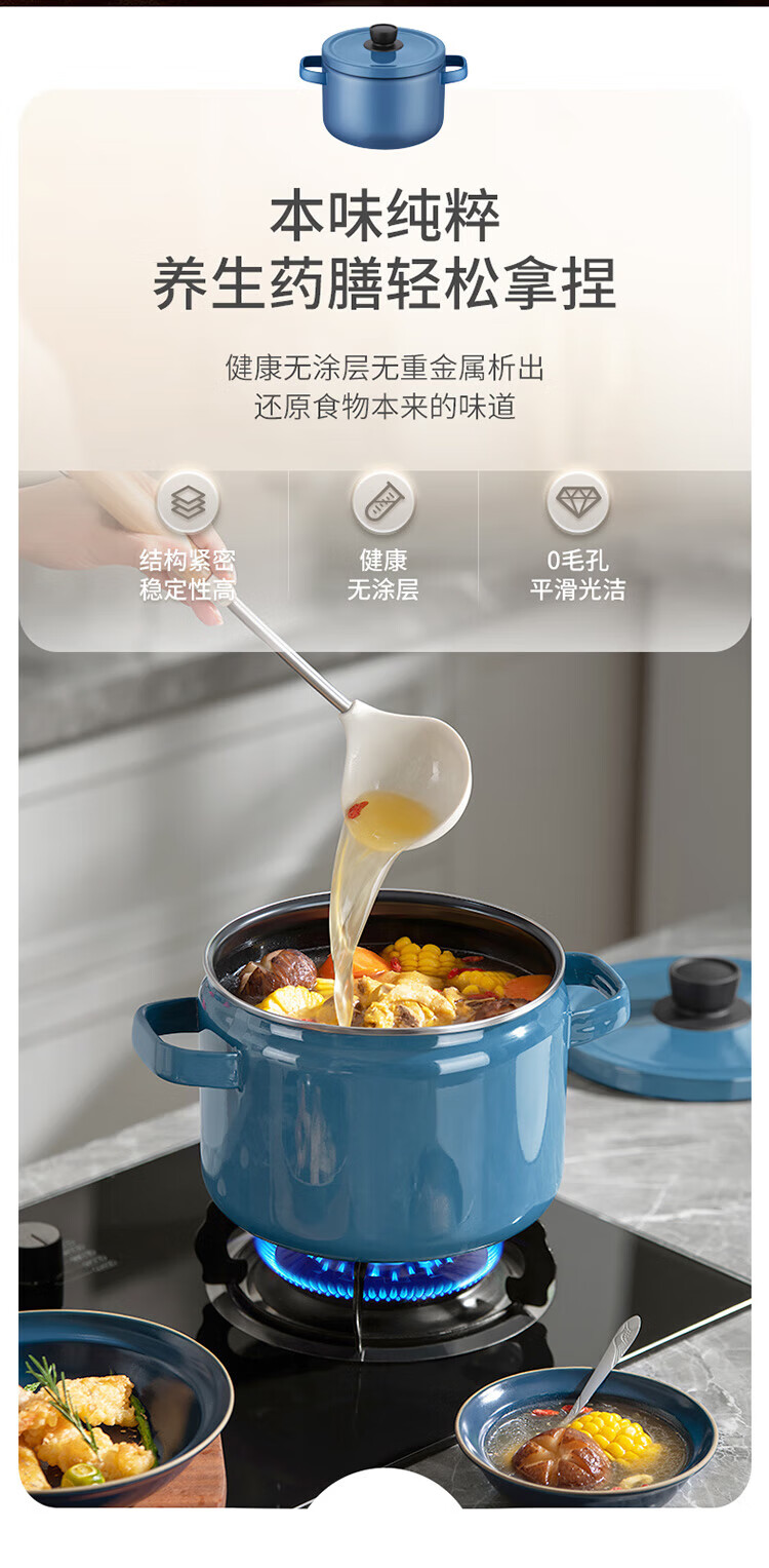 金属珐琅锅盖设计,密封性能好,持久耐用;;精铁材质制造,传热更快,受热均匀;;隔热防烫手柄,符合人体工程学,使用手适自然