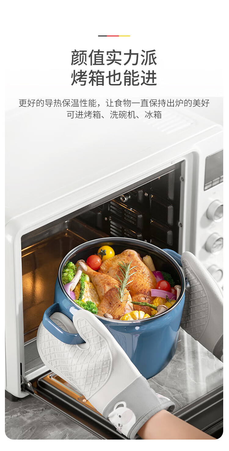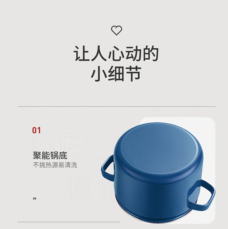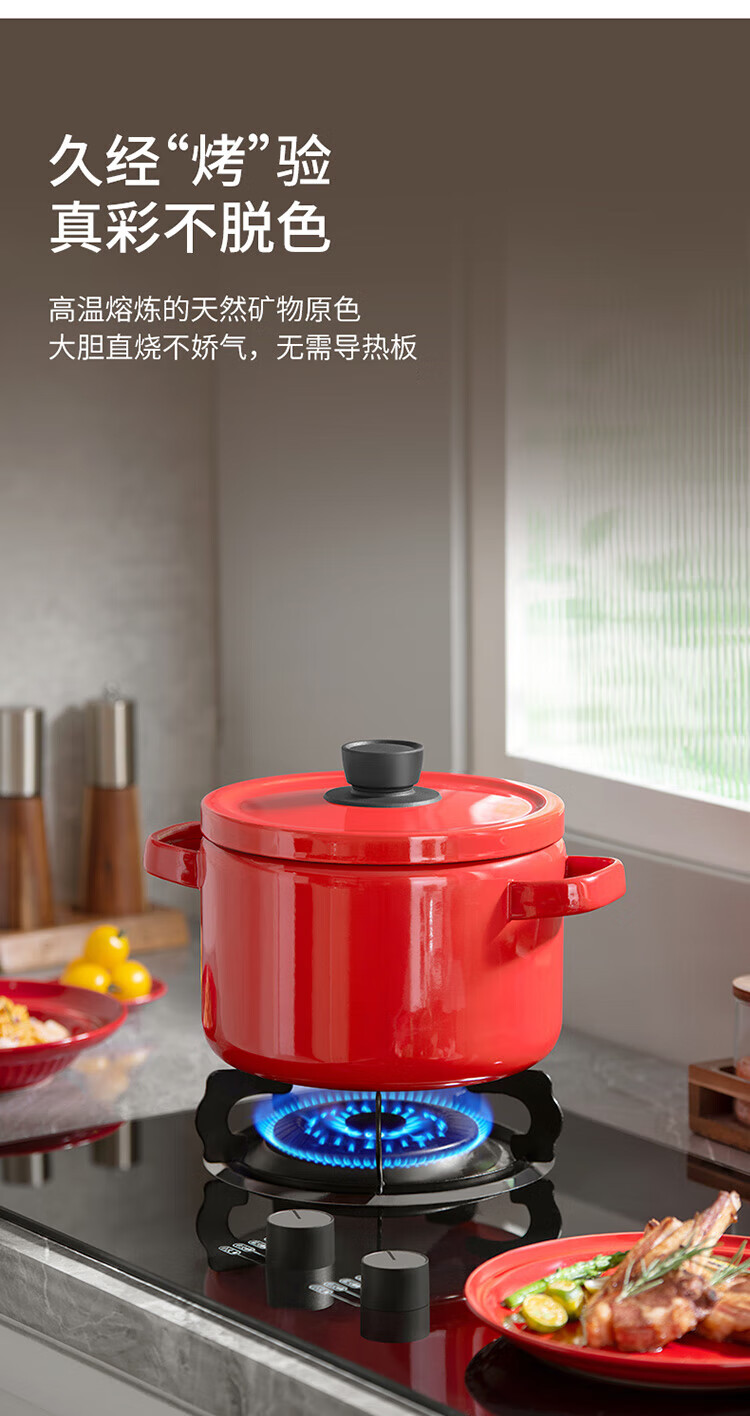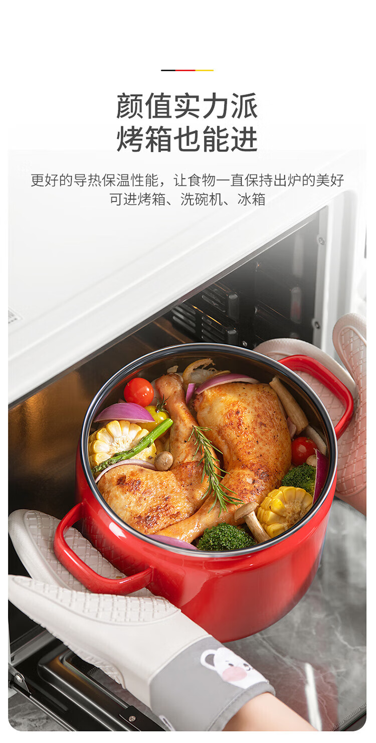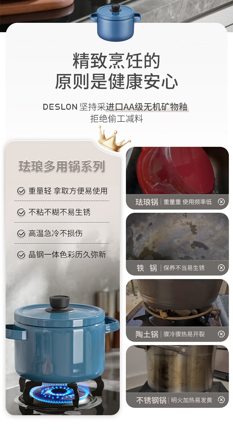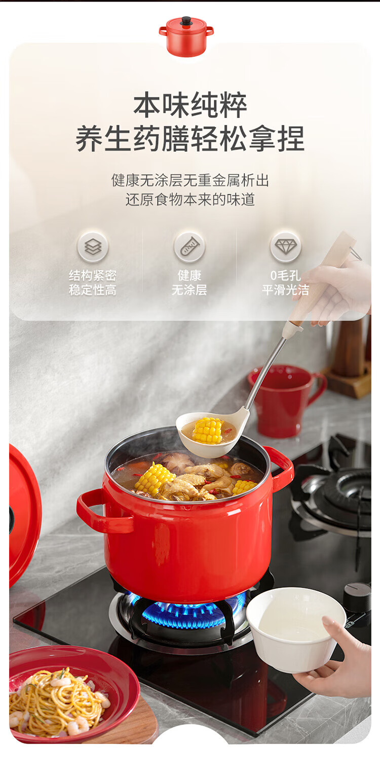 金属珐琅锅盖设计,密封性能好,持久耐用;;精铁材质制造,传热更快,受热均匀;;隔热防烫手柄,符合人体工程学,使用手适自然