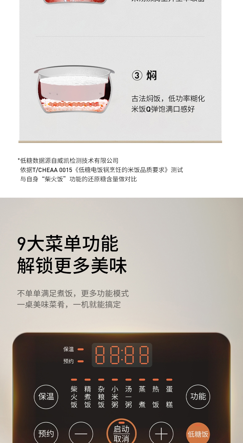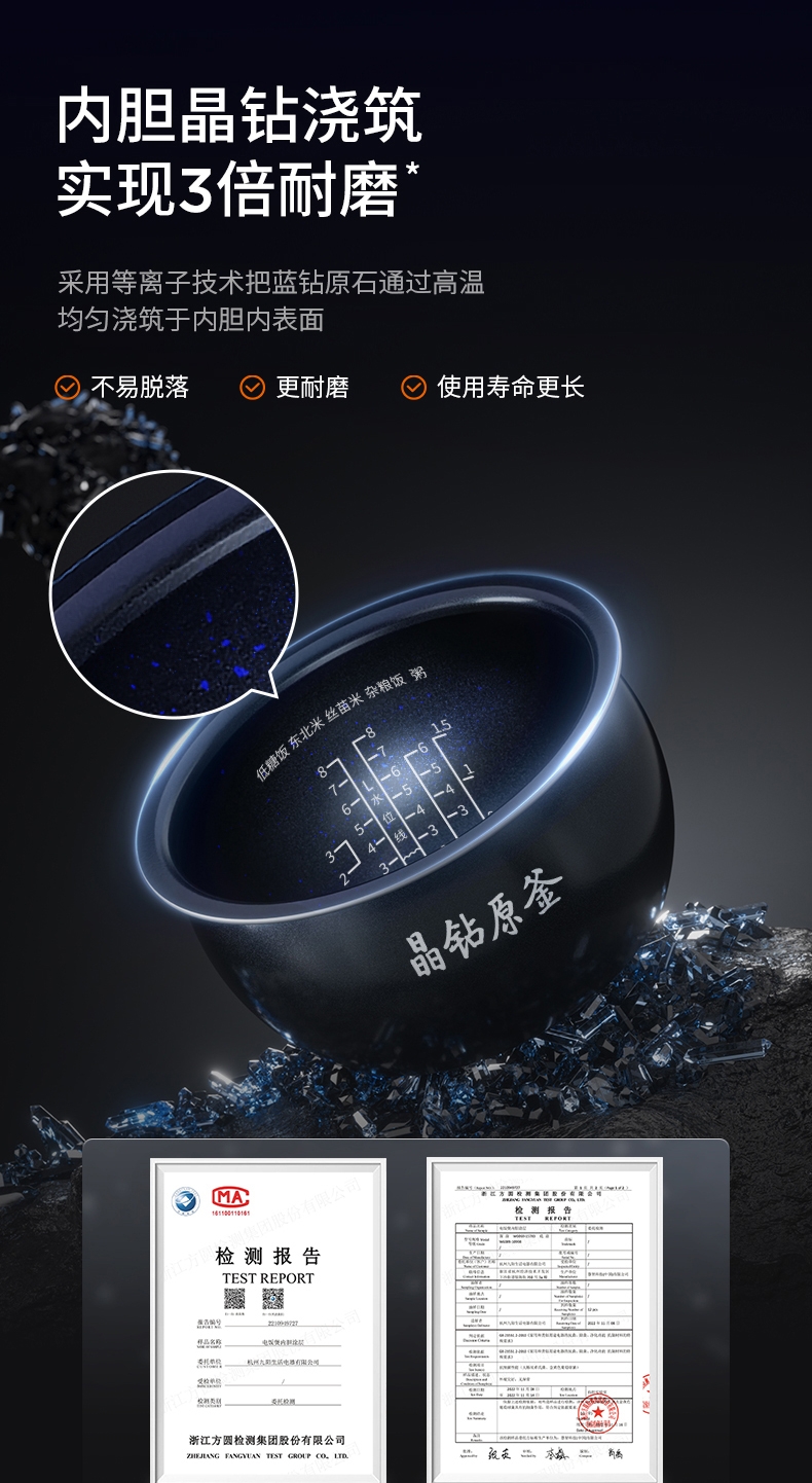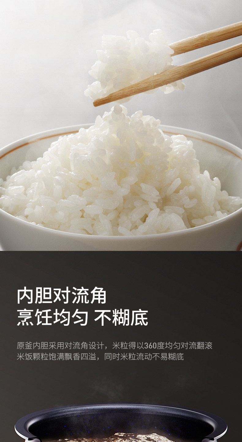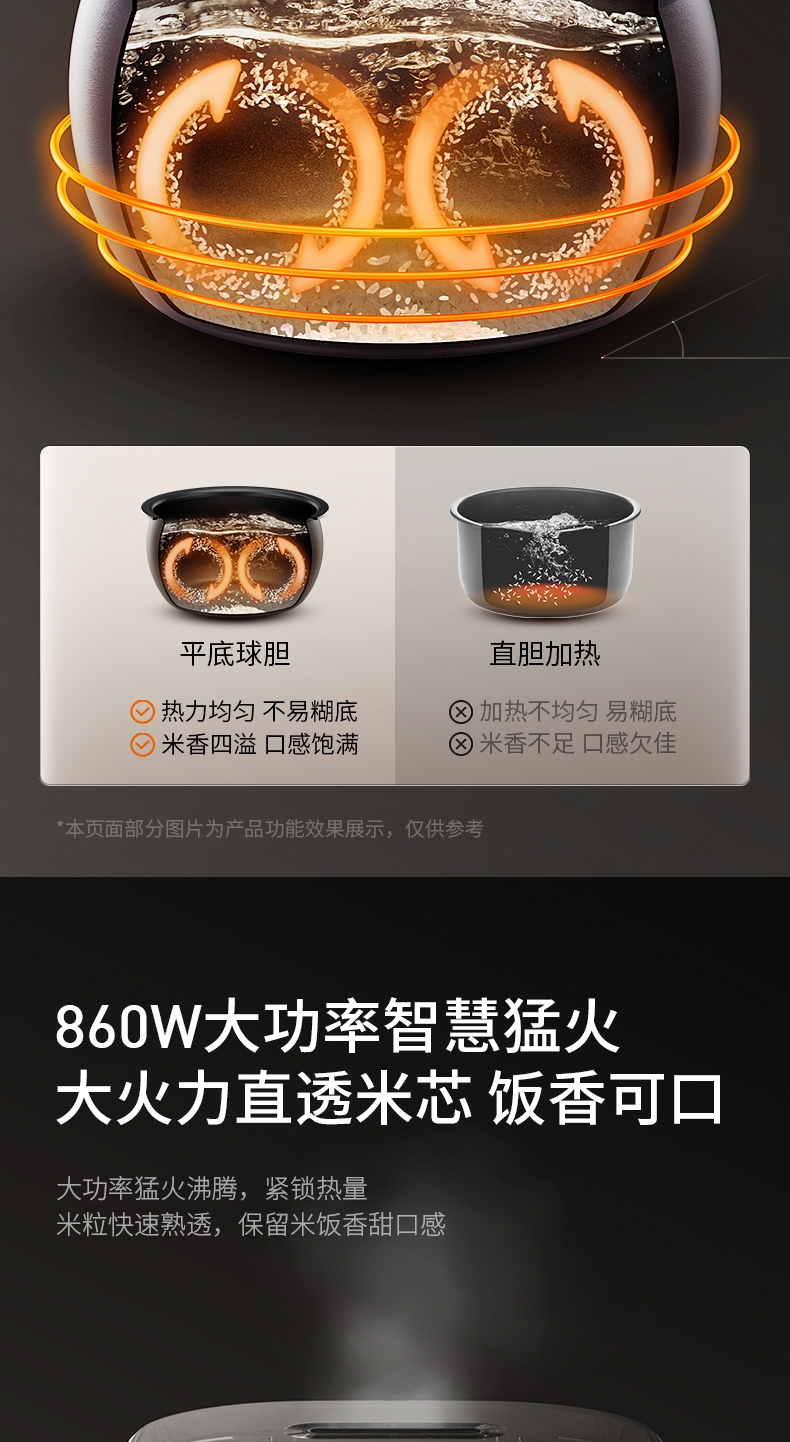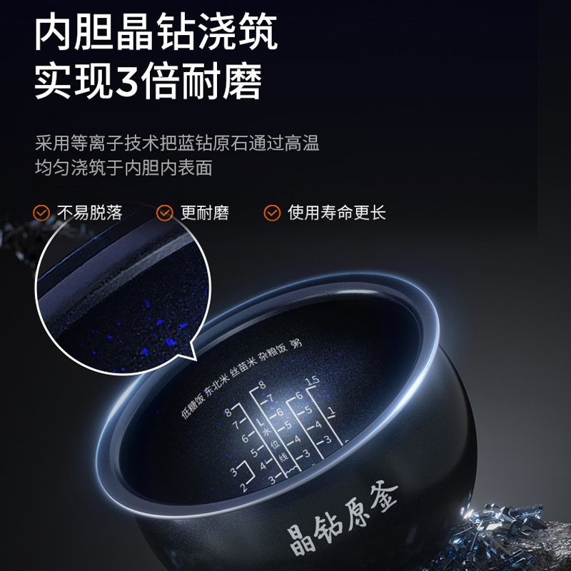 特色低糖饭,减糖不减饭香;晶钻抗菌球胆,抗菌率;860W猛火加热,高效聚能导热