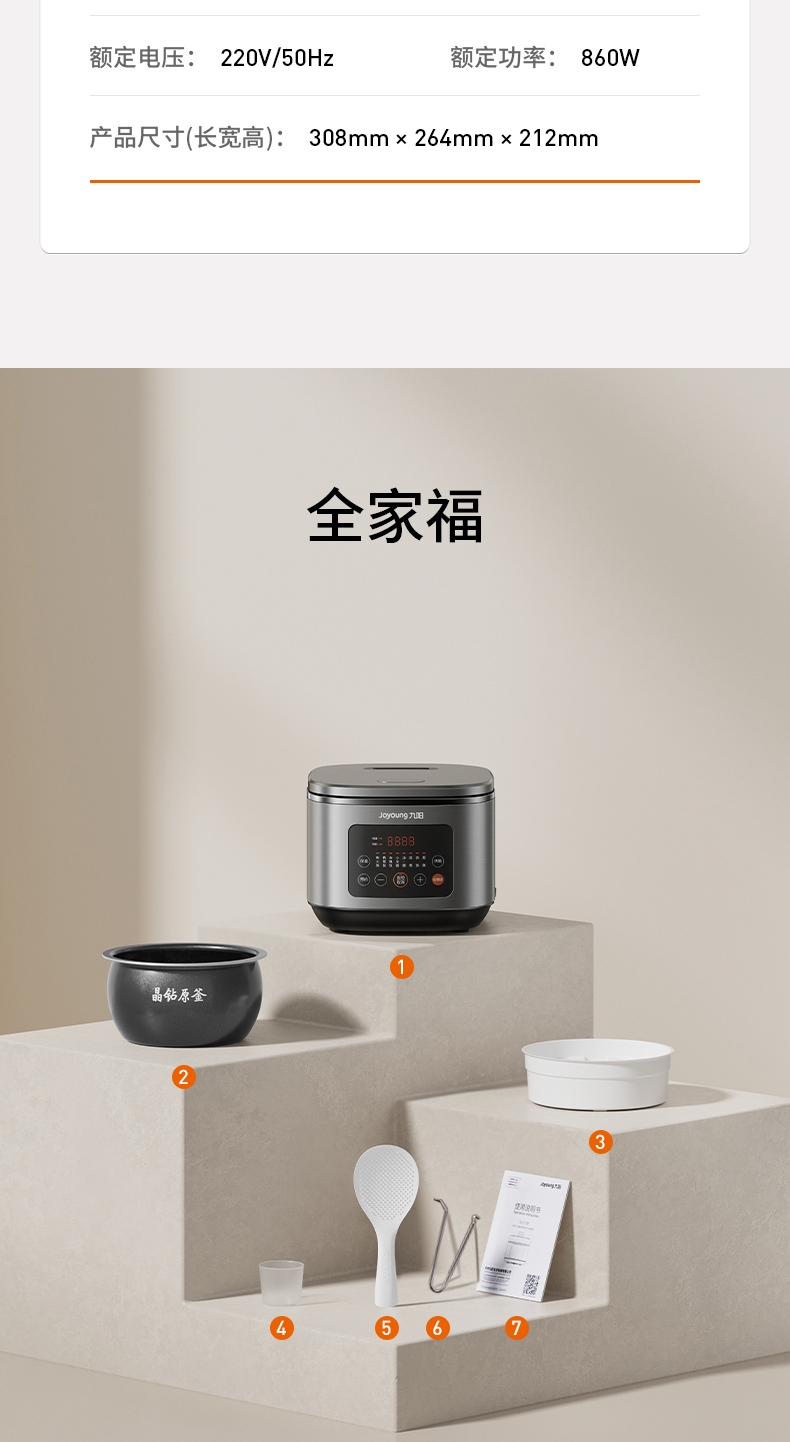 配置清单:主机、内胆、饭勺、量杯、蒸笼、不锈钢把手、电源线、说明书