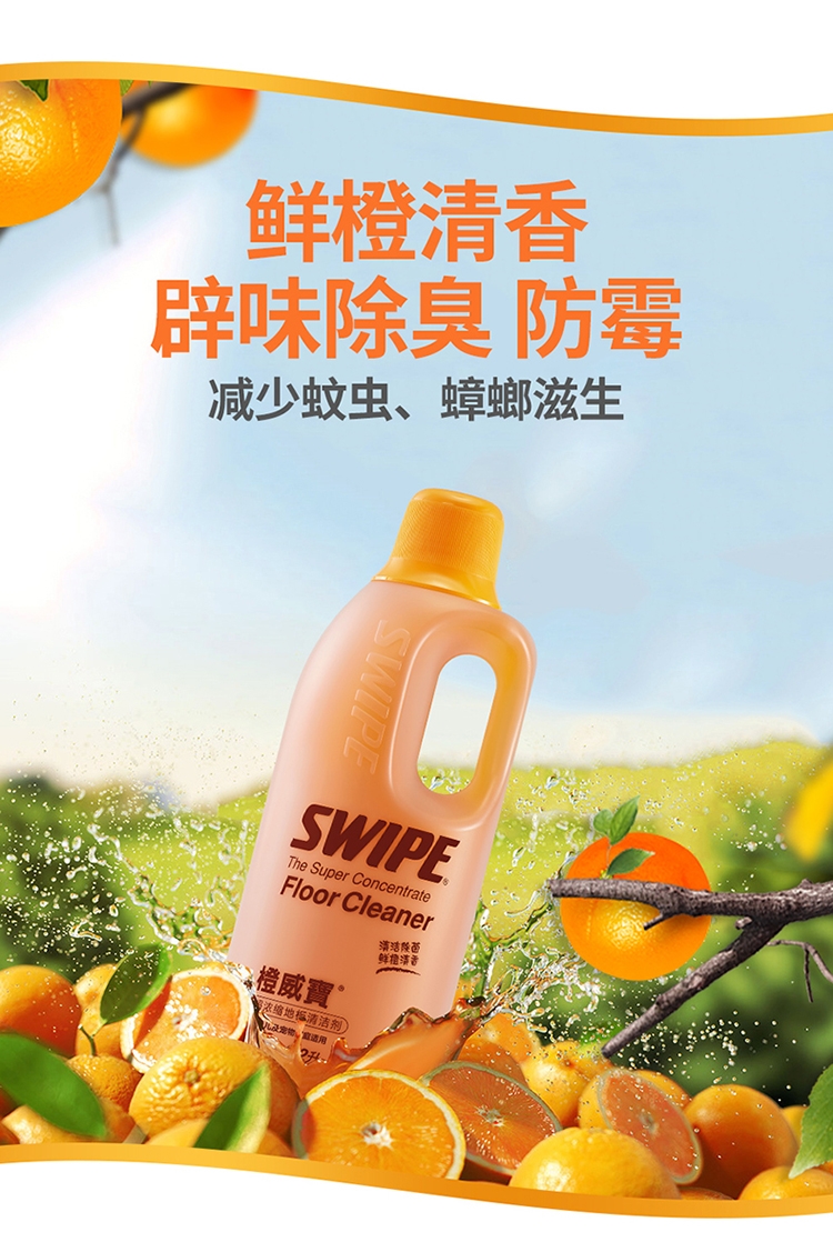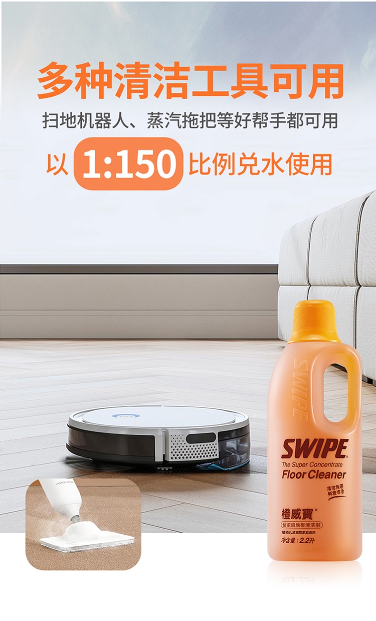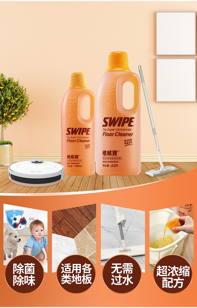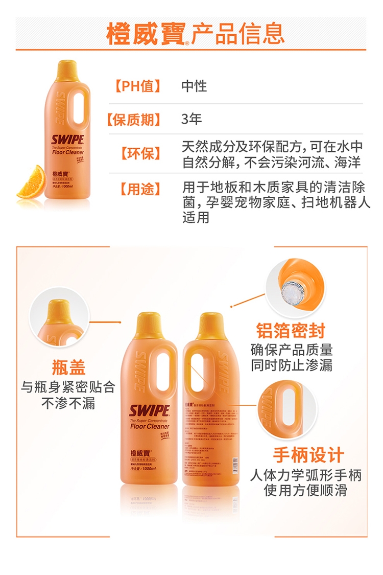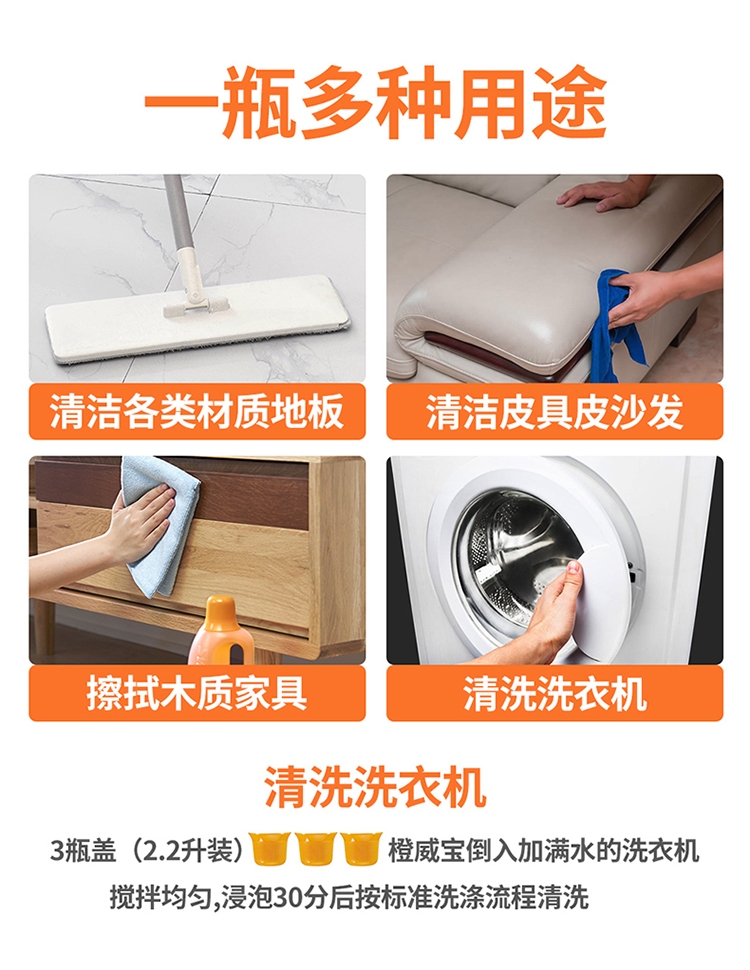 各类地板适用:橙威宝适合任何性质的地板;有效杀菌及流感病毒;鲜橙清香,辟味除臭