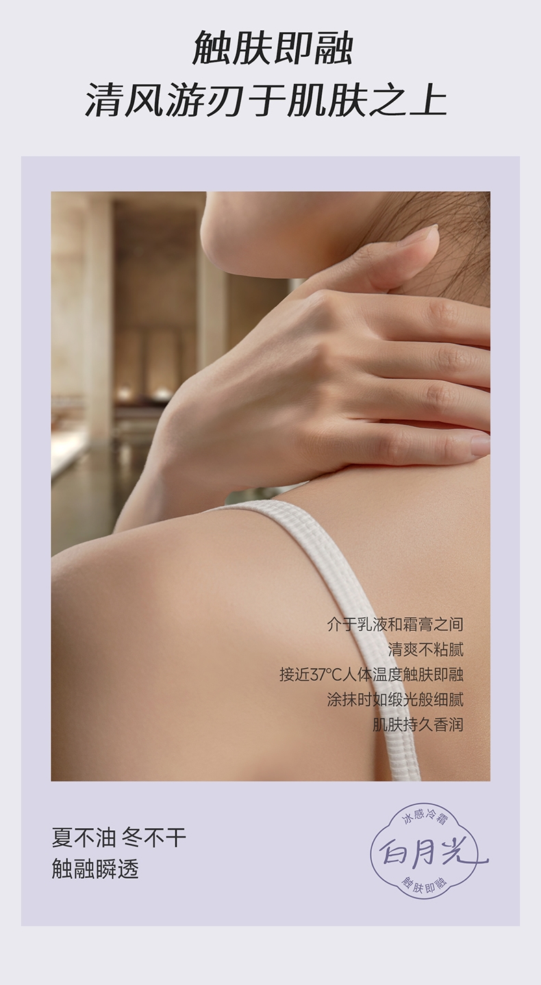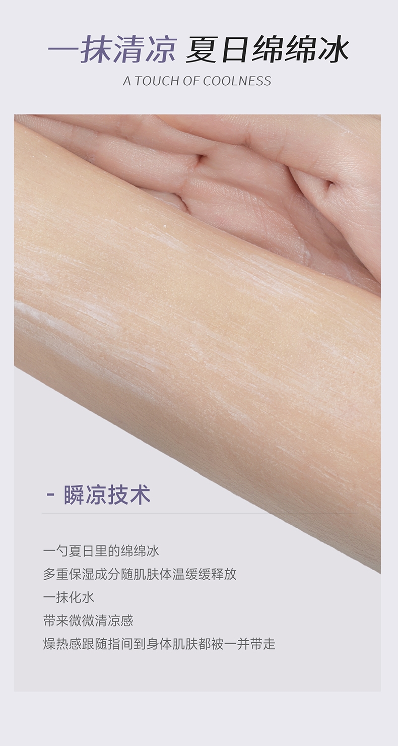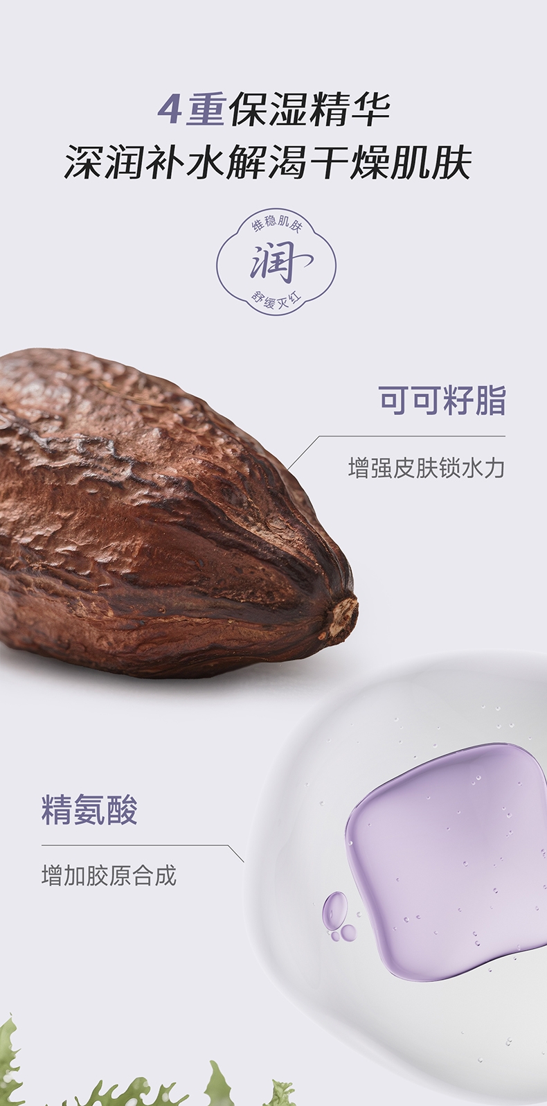 冰淇淋质地 触肤即融;4重保湿精华 深润补水解渴干燥肌肤;先舒缓后保湿 肌肤轻饮每一分舒润
