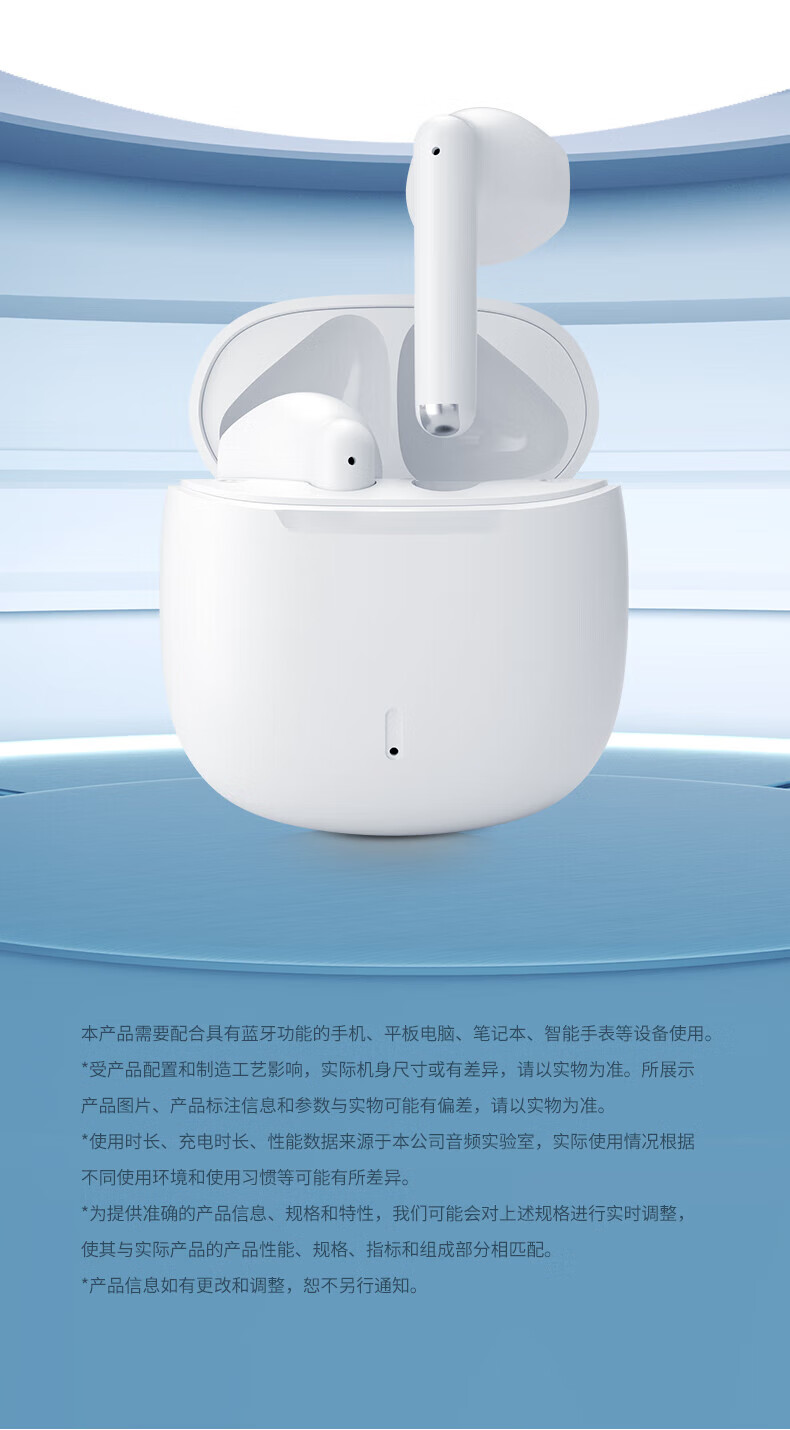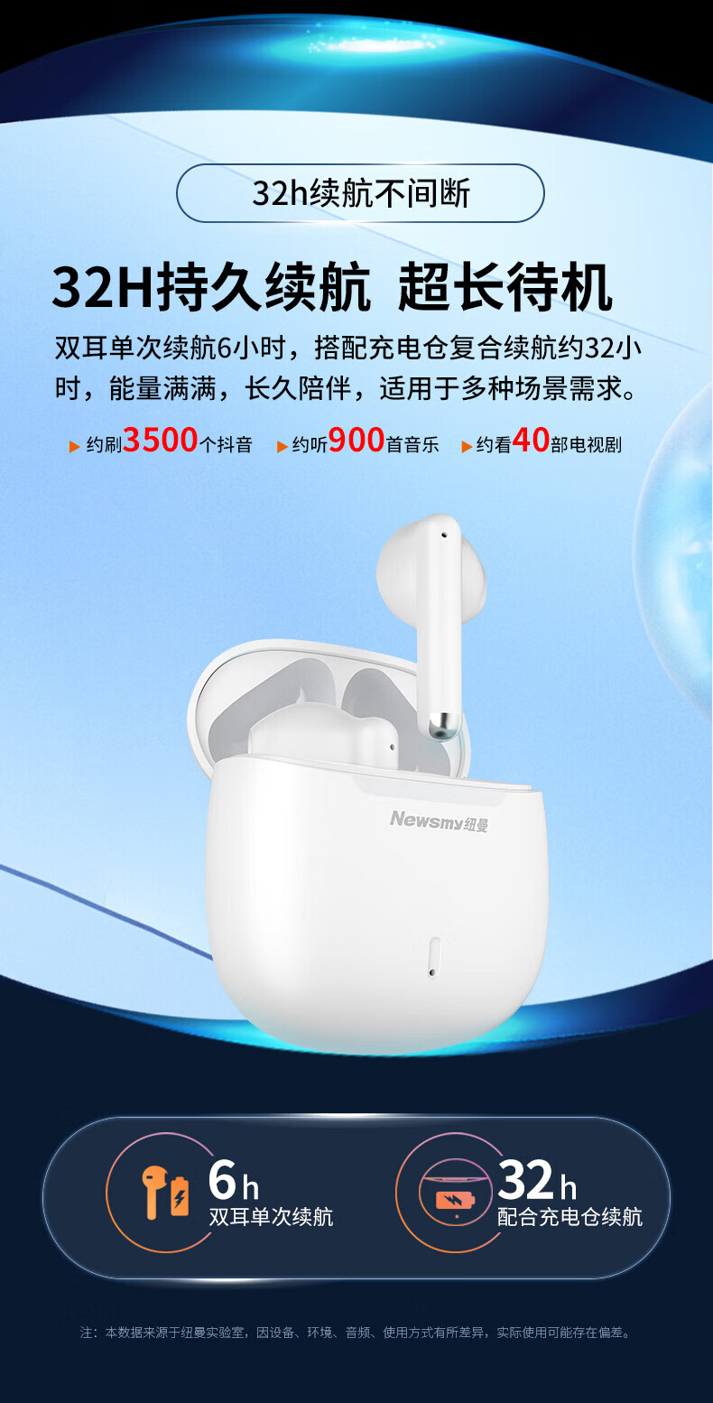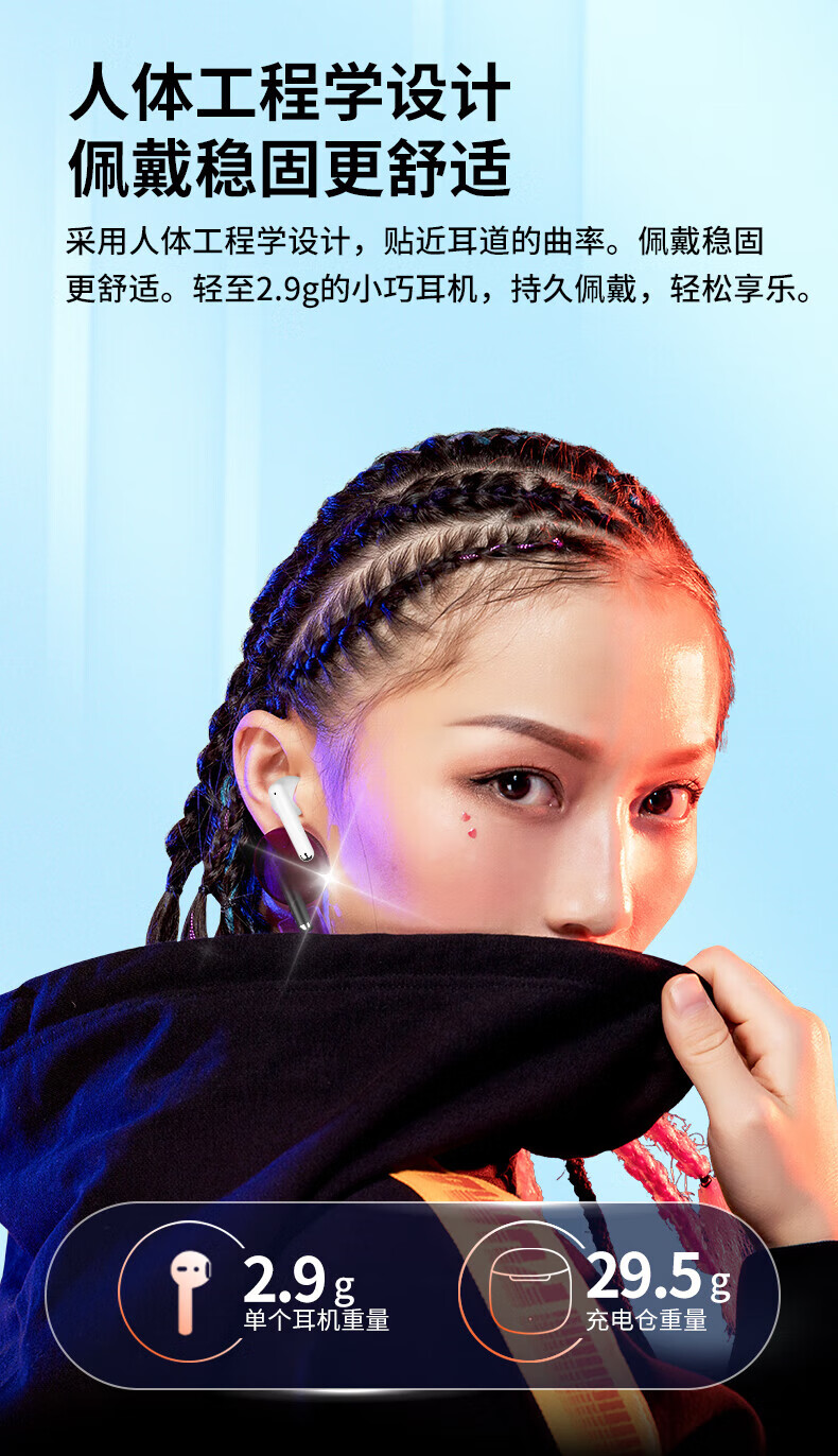 磁吸耳头,LED电量数显;35H播放时长,300mAh容量长续航;360°环绕音效,宛如身临其境