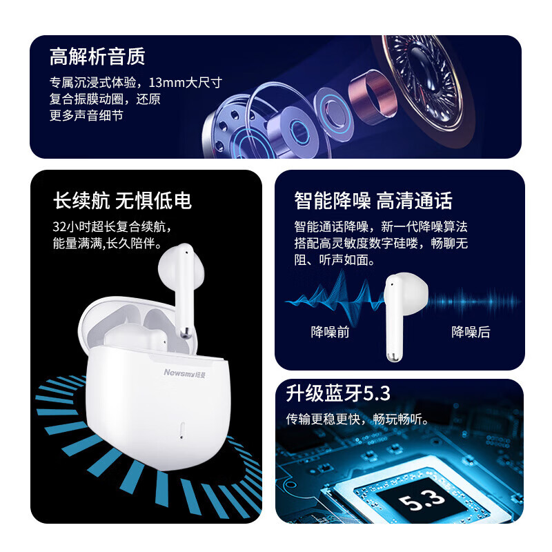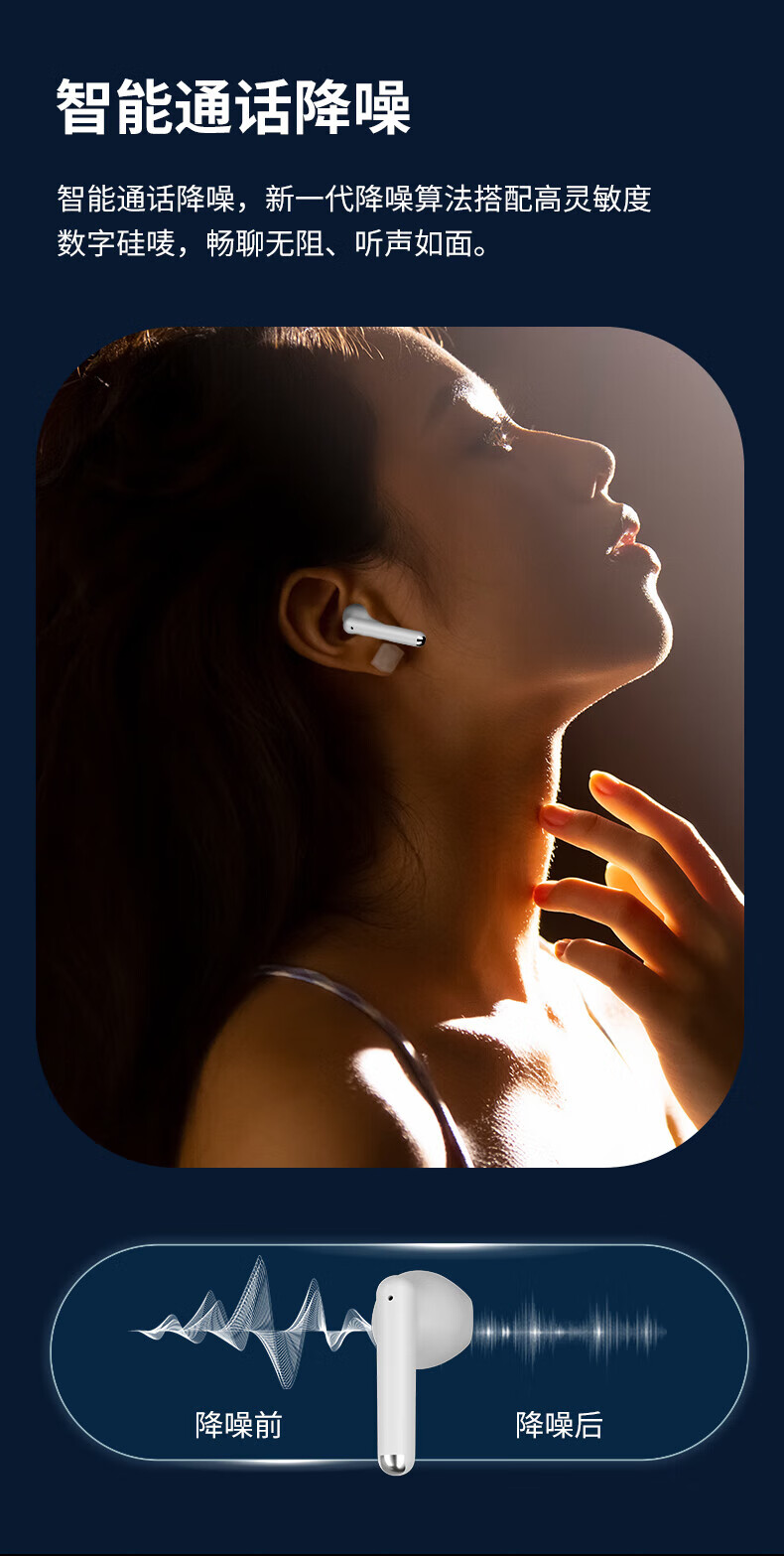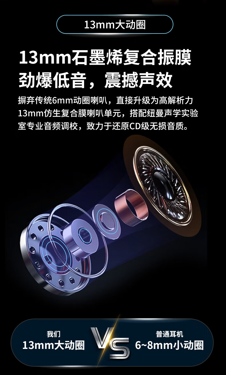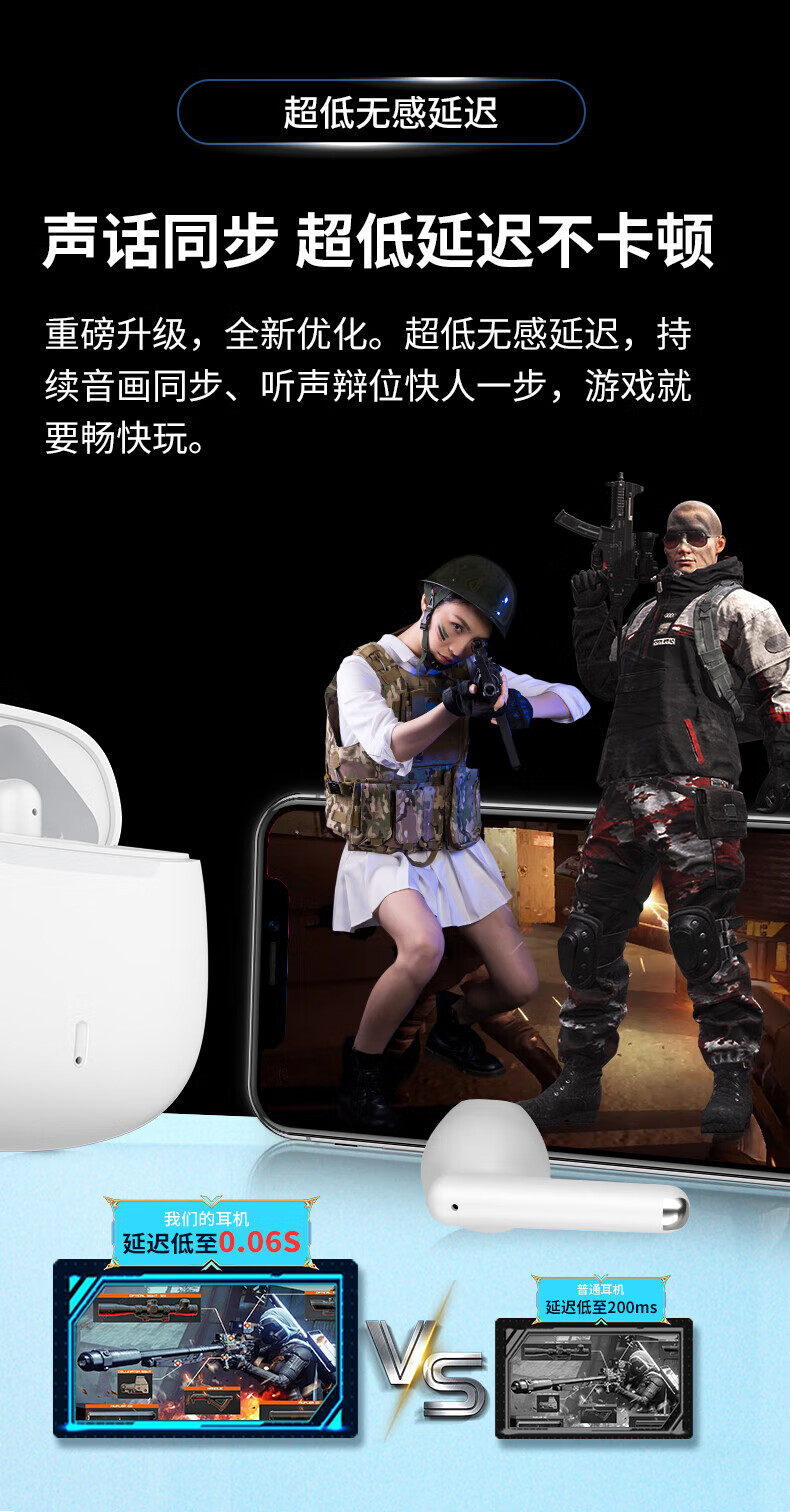 磁吸耳头,LED电量数显;35H播放时长,300mAh容量长续航;360°环绕音效,宛如身临其境