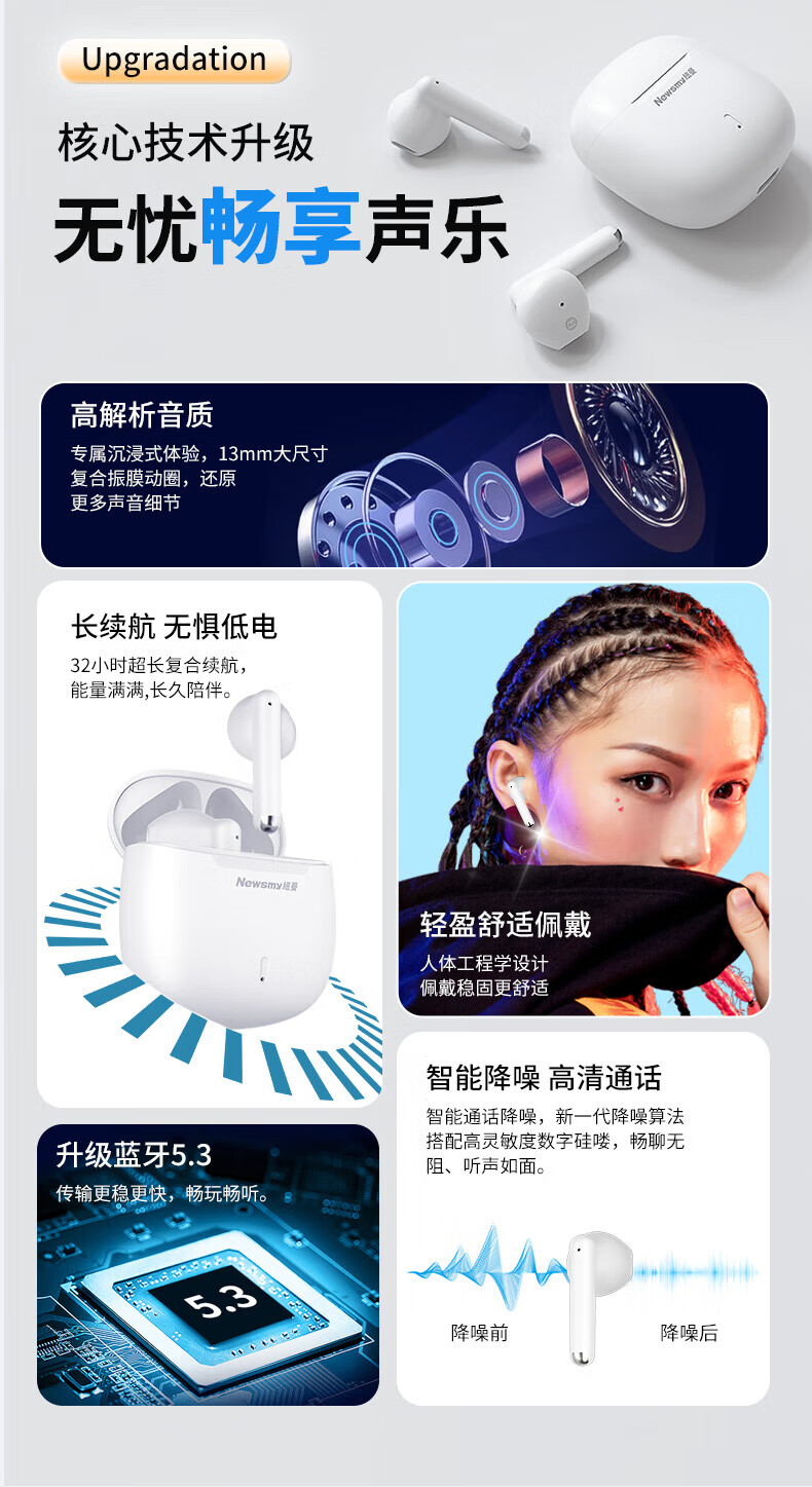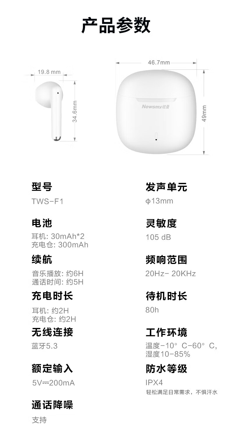 纽曼 真无线半入耳式音乐耳机TWS-F1
