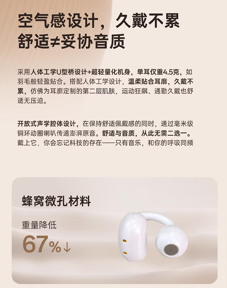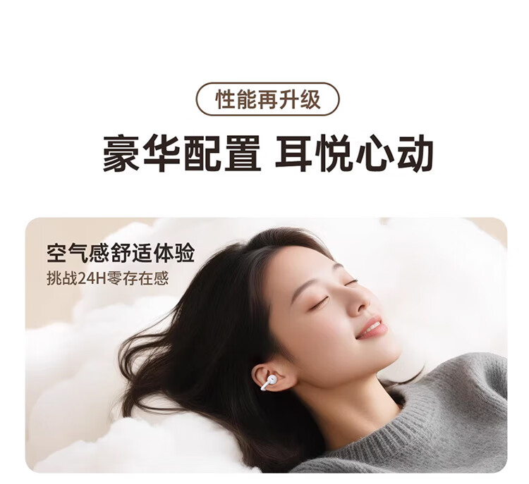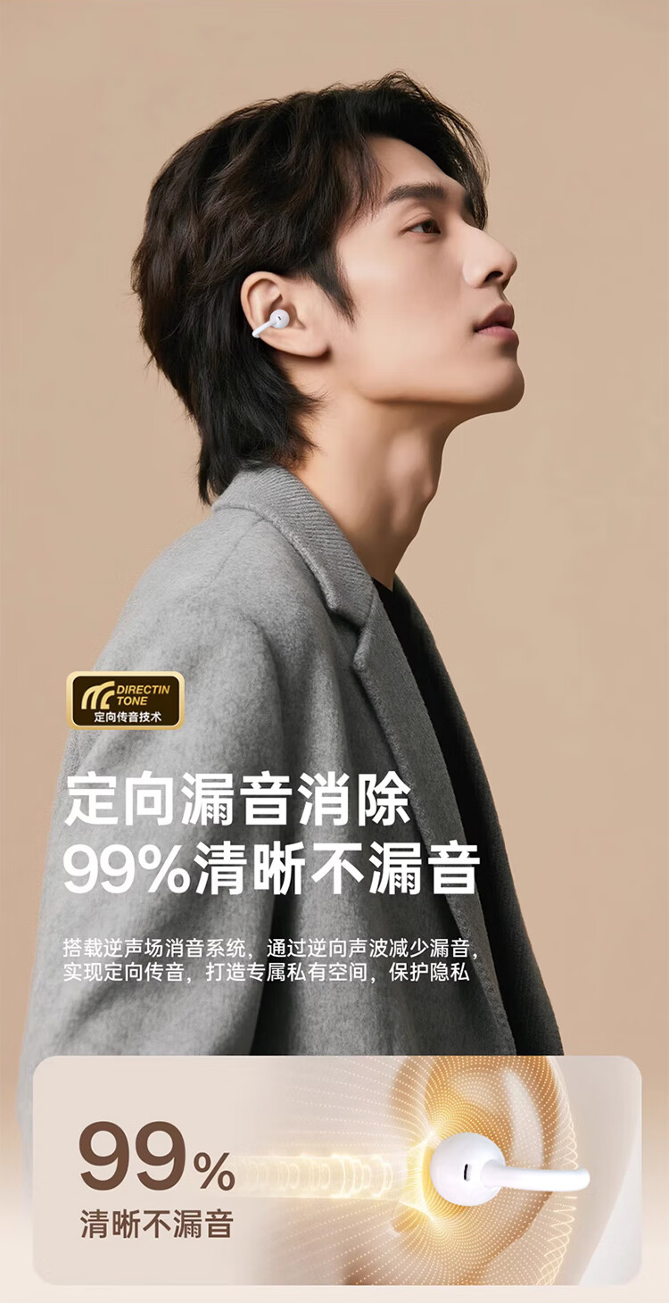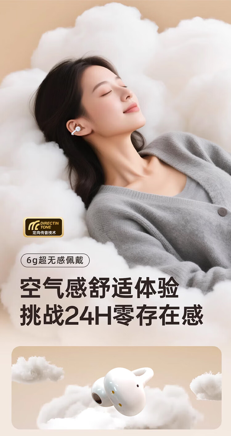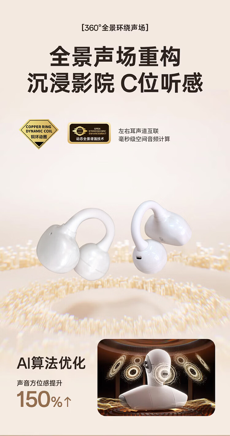 3D全景声场,呈现纯净高清音质;蓝牙快连5.4, 开盖开机秒连接;佩戴轻松,仿生支撑结构