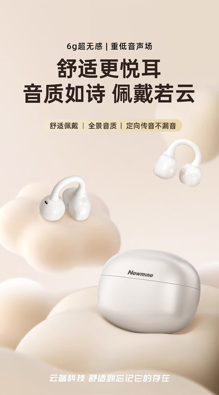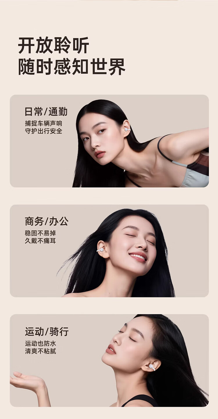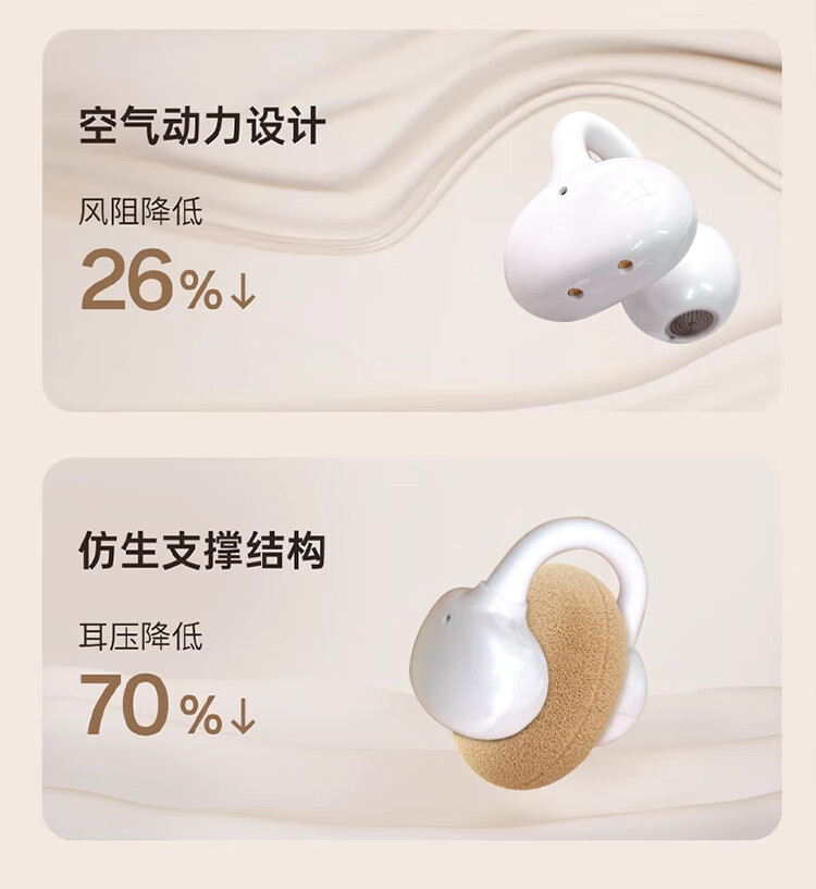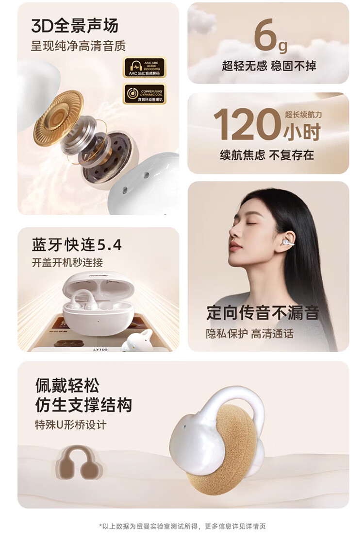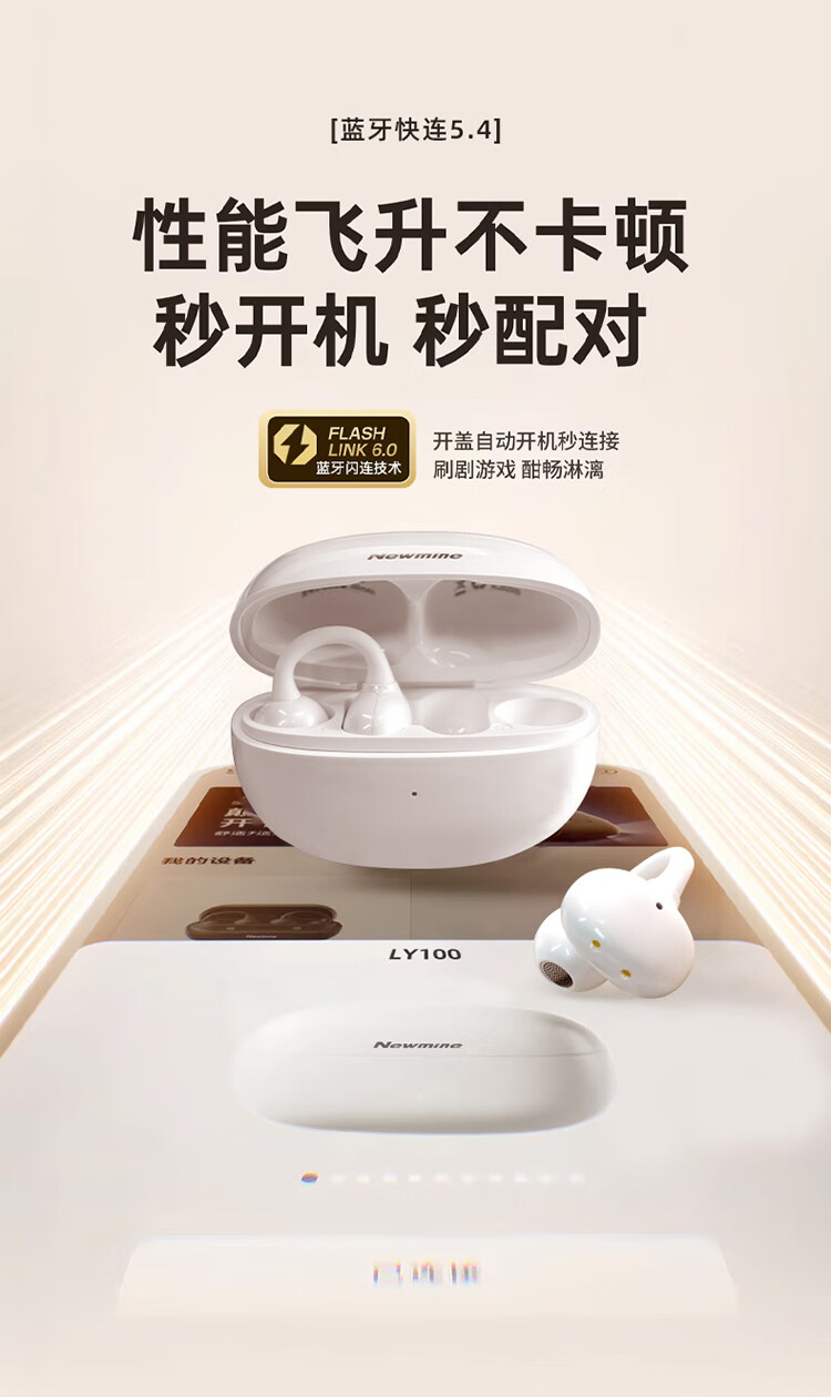 3D全景声场,呈现纯净高清音质;蓝牙快连5.4, 开盖开机秒连接;佩戴轻松,仿生支撑结构