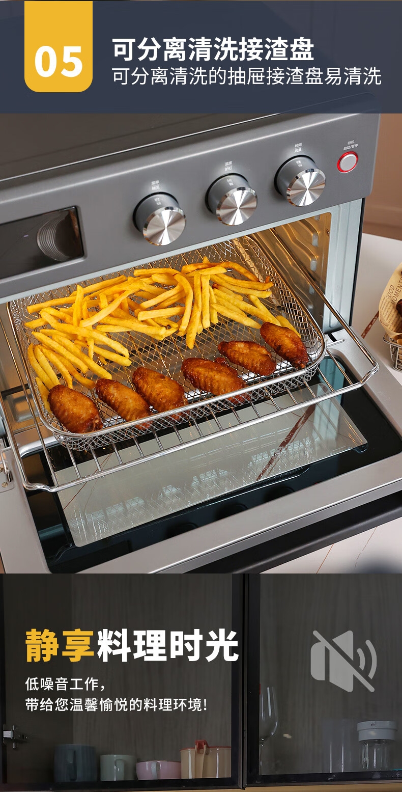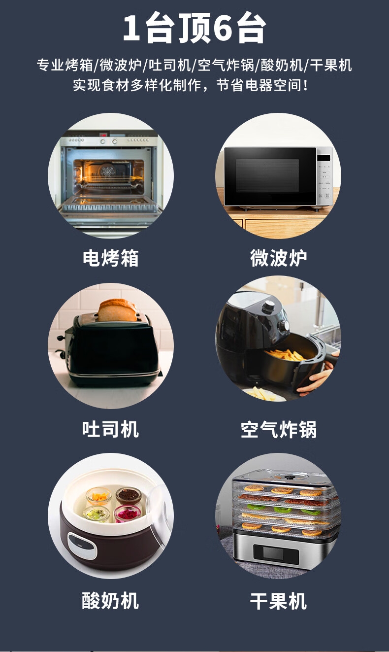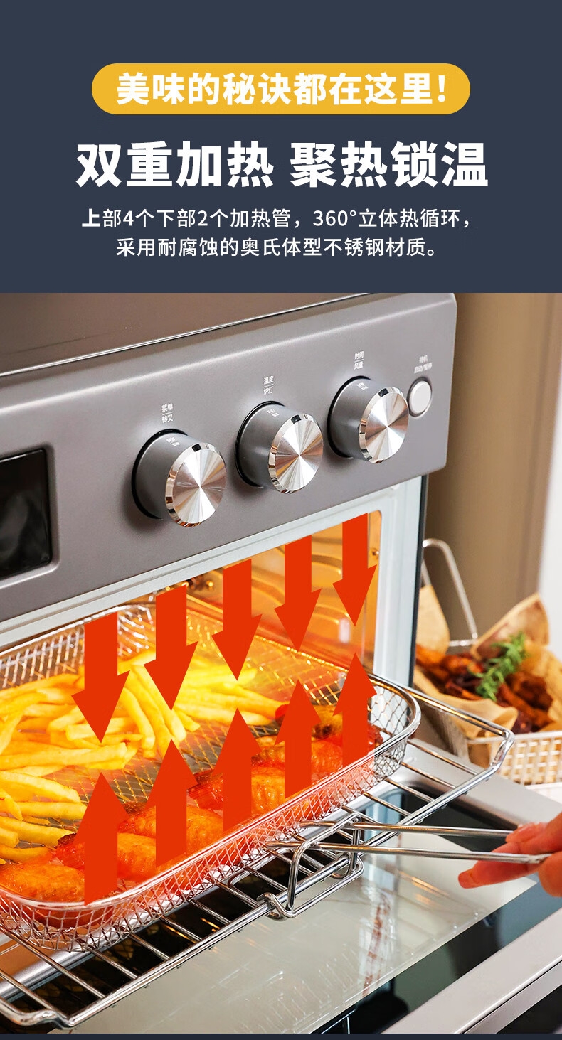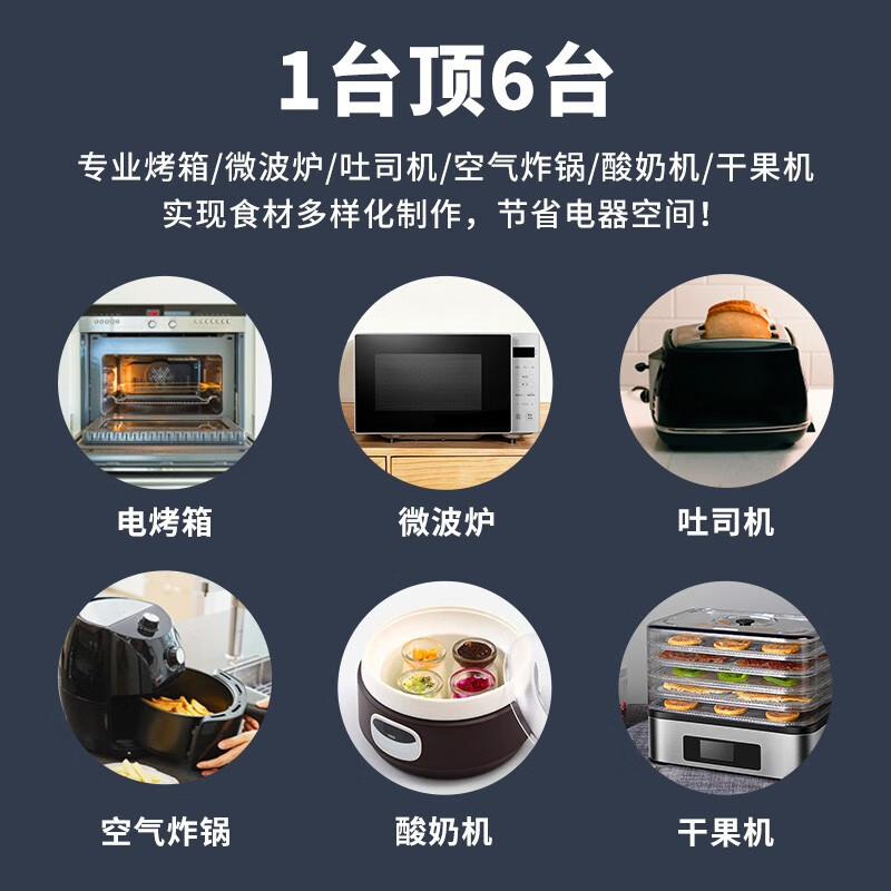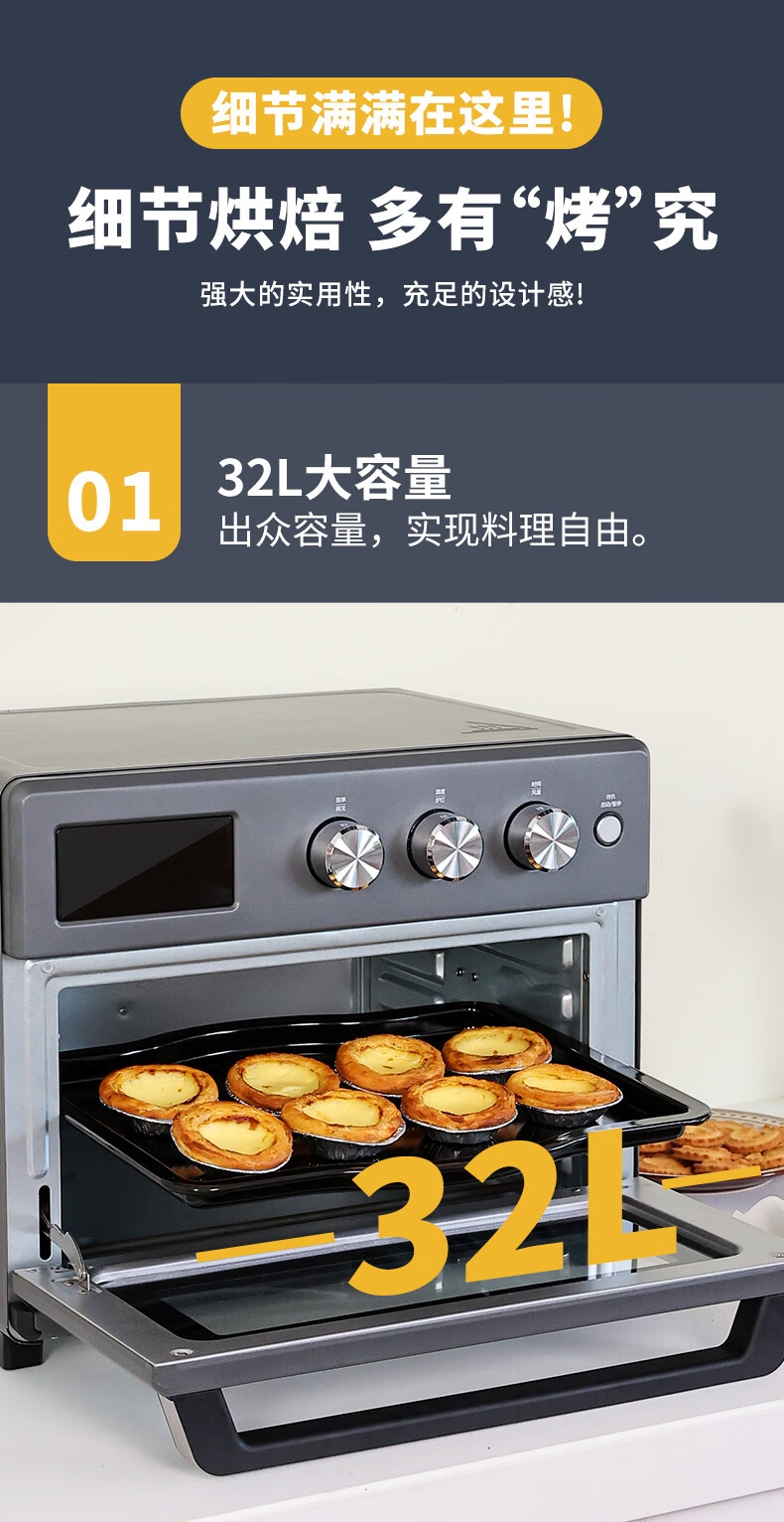 32升大容量,解放食材大小带来的局限。;双重玻璃锁住热量,保温防烫,还可以享受动态的烹饪;专业烤箱/吐司机/微波炉/酸奶机 空气炸锅/干果机